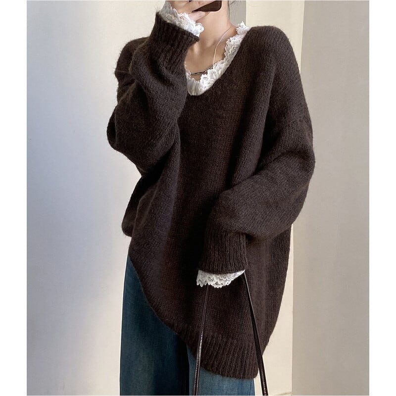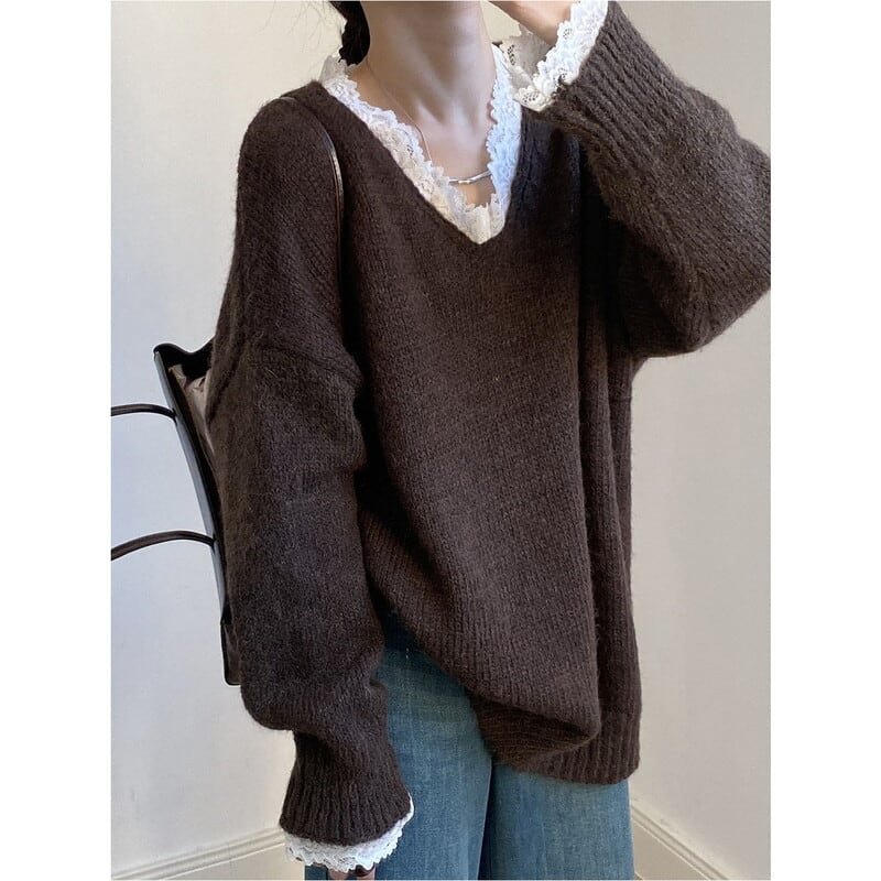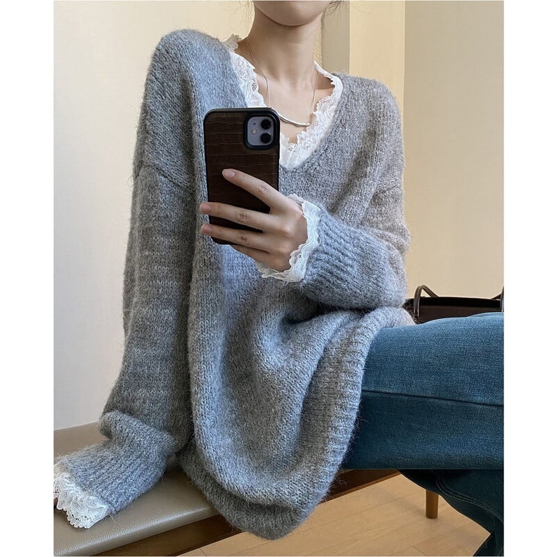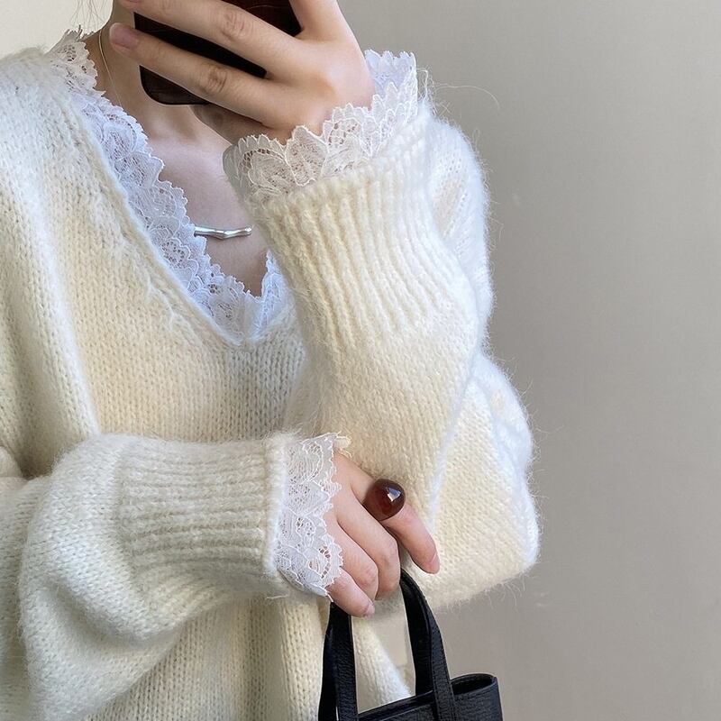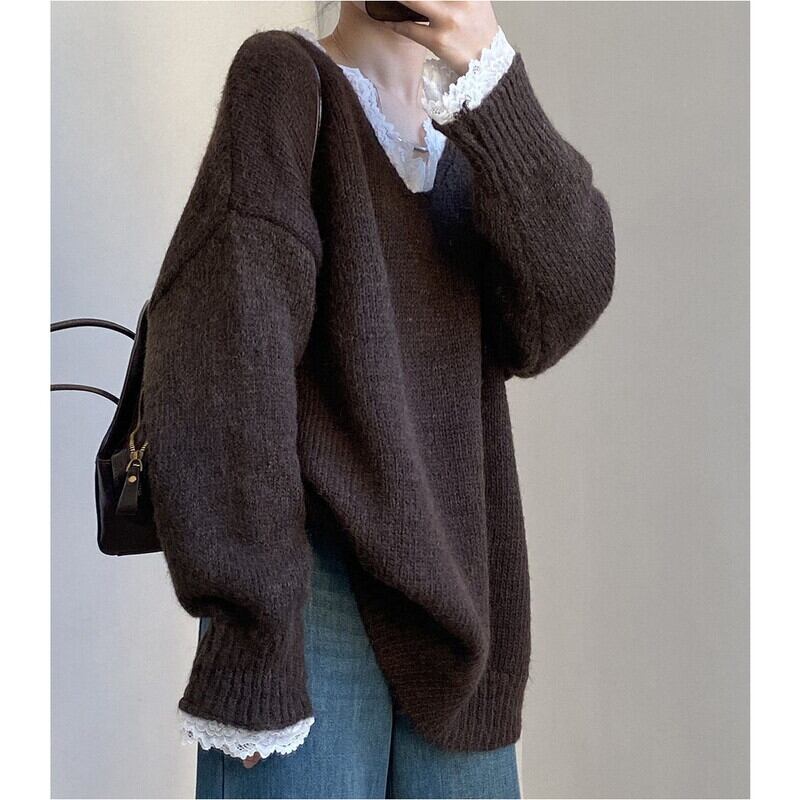 深めのVネックがデコルテを美しく見せてくれるニットプルオーバーです。