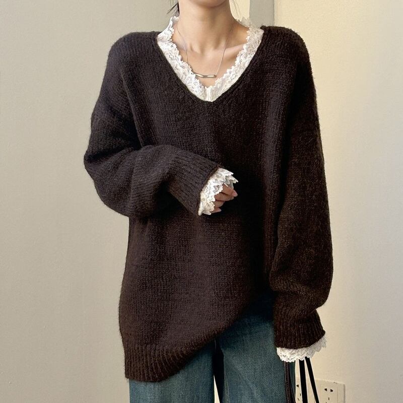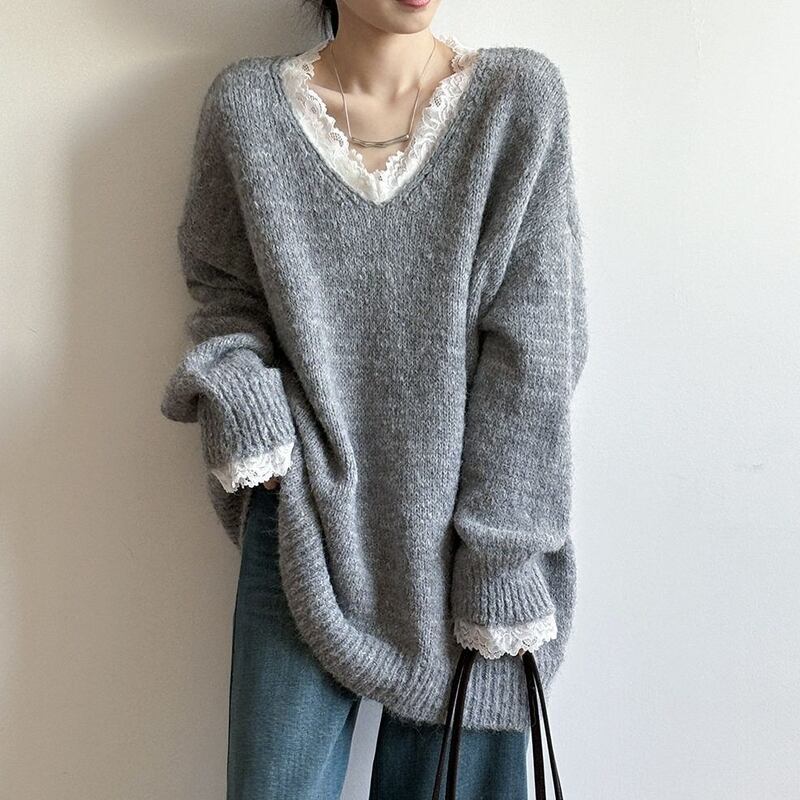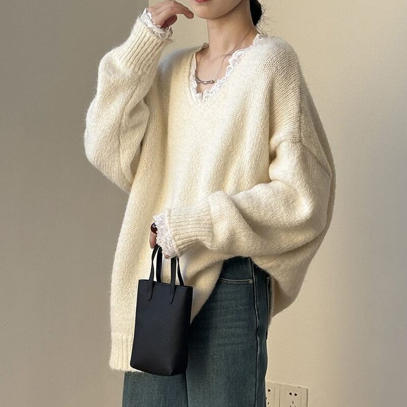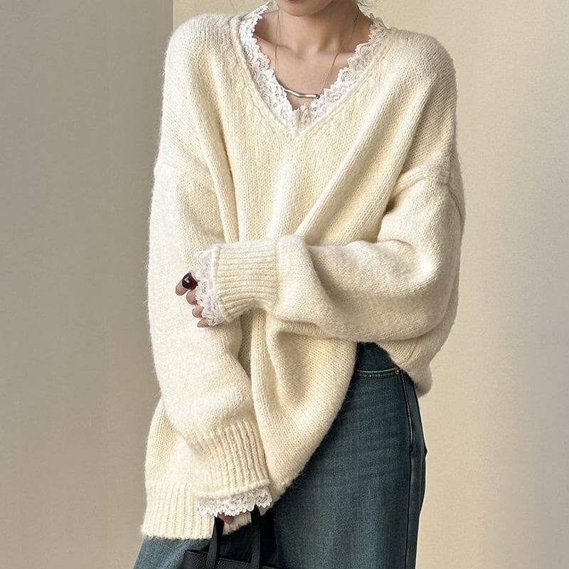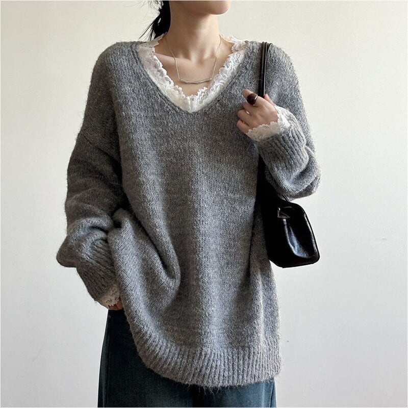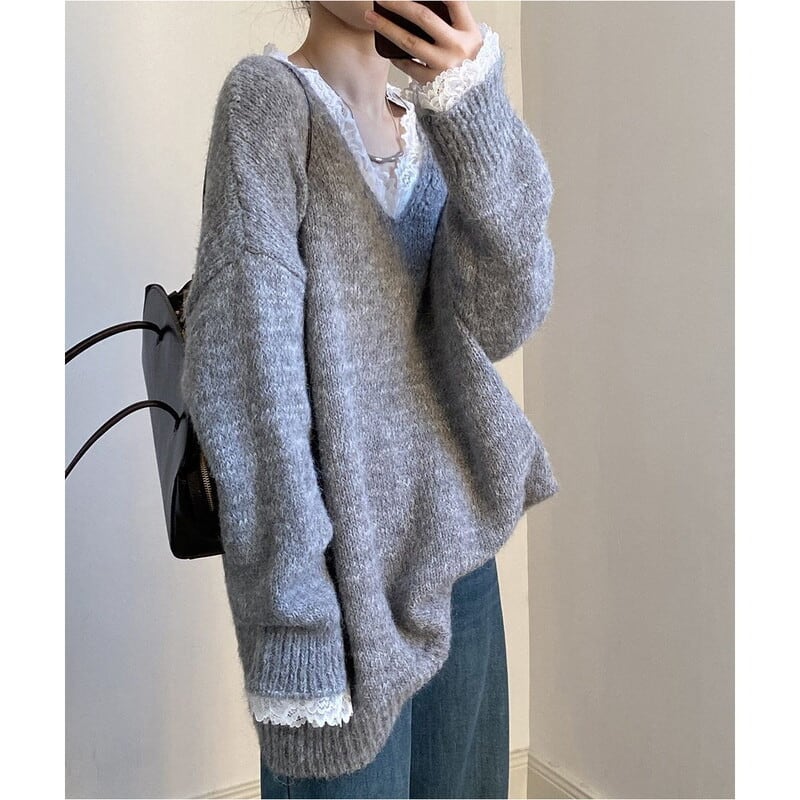 深めのVネックがデコルテを美しく見せてくれるニットプルオーバーです。