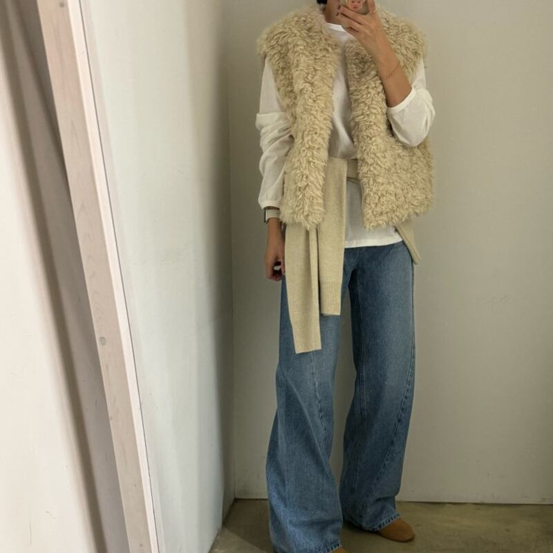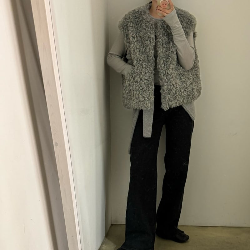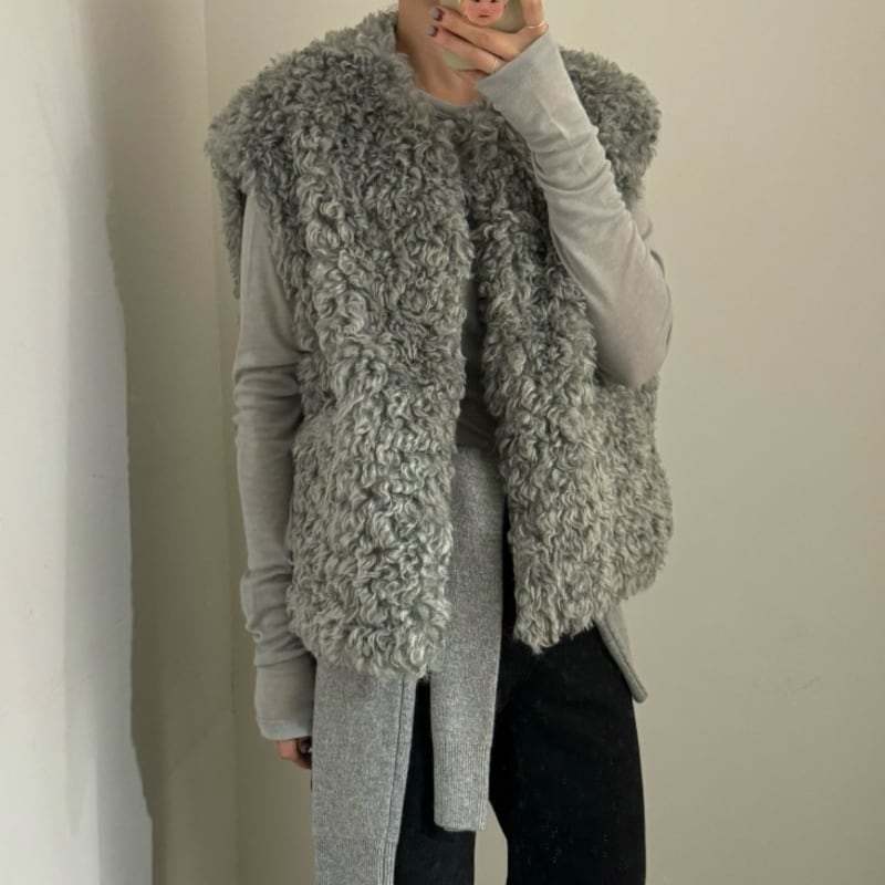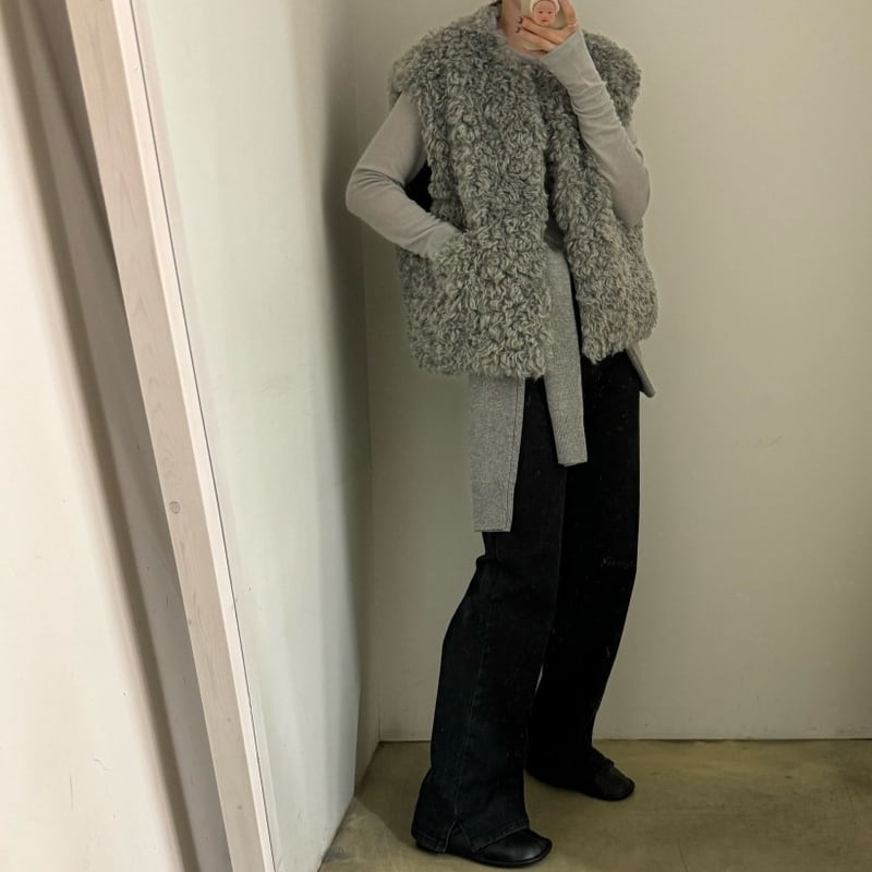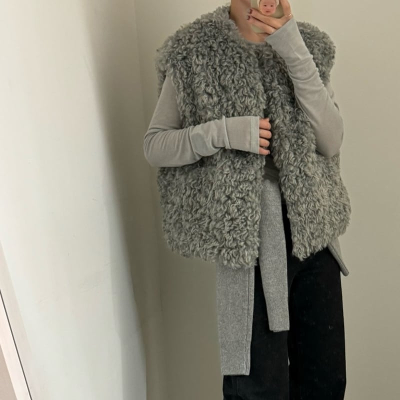 首元をすっきりと見せるノーカラーデザインのフェイクファーベストです。