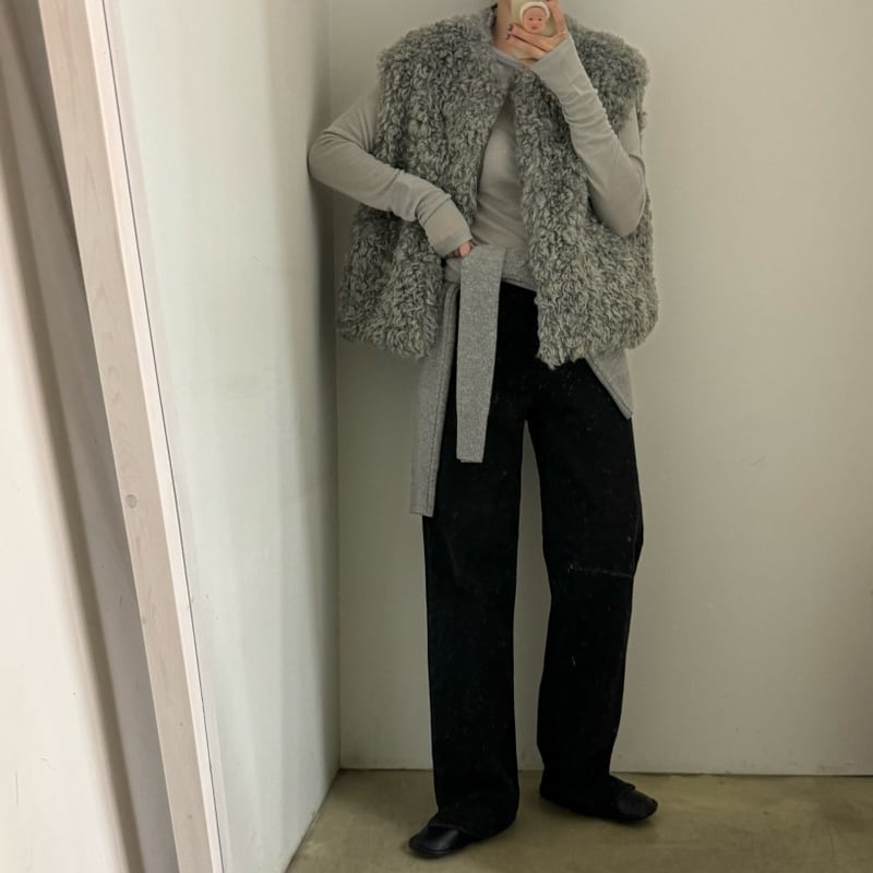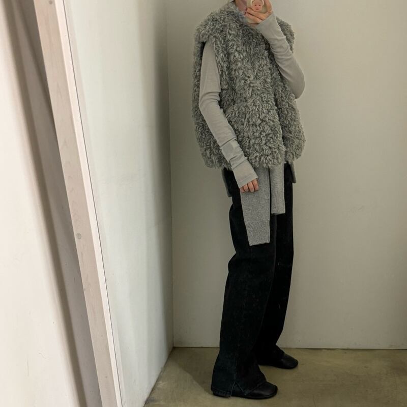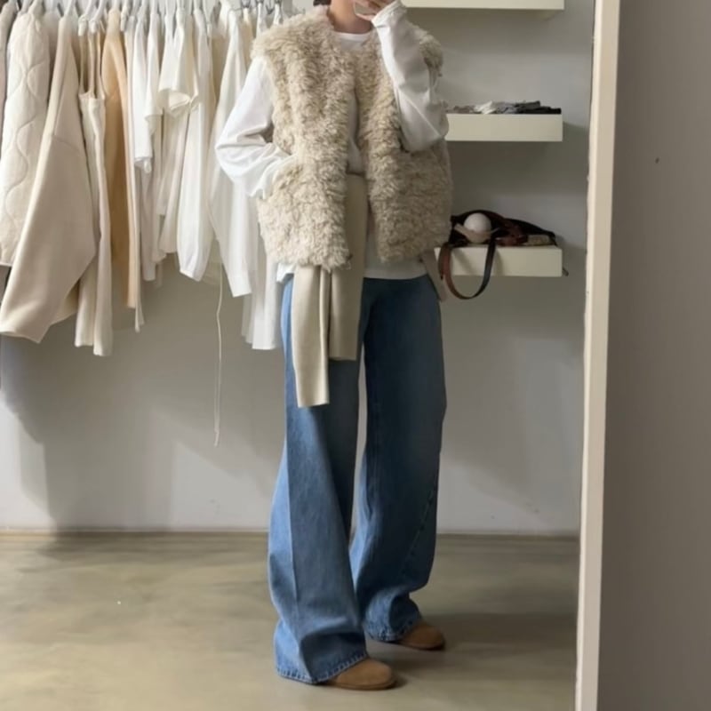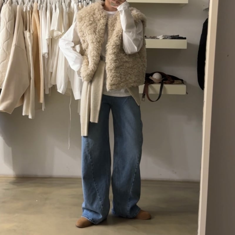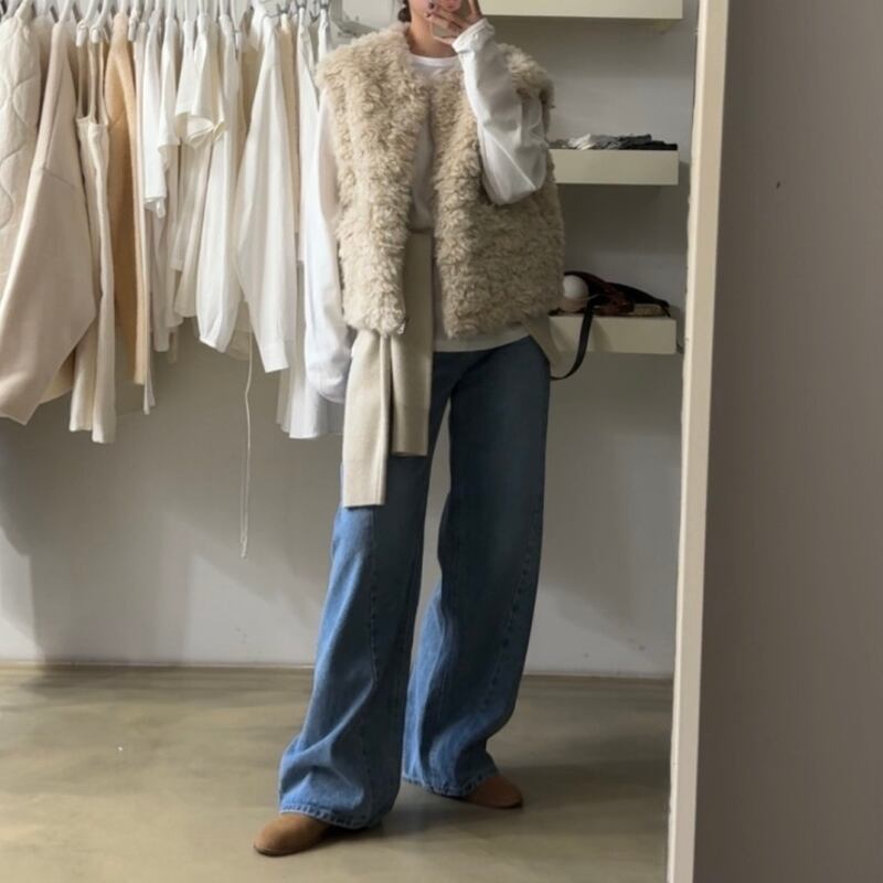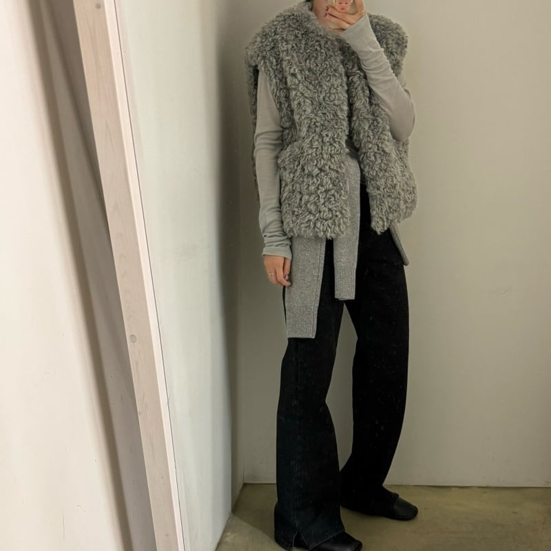 首元をすっきりと見せるノーカラーデザインのフェイクファーベストです。