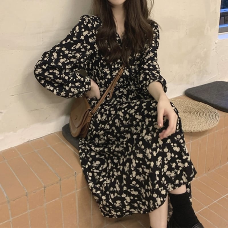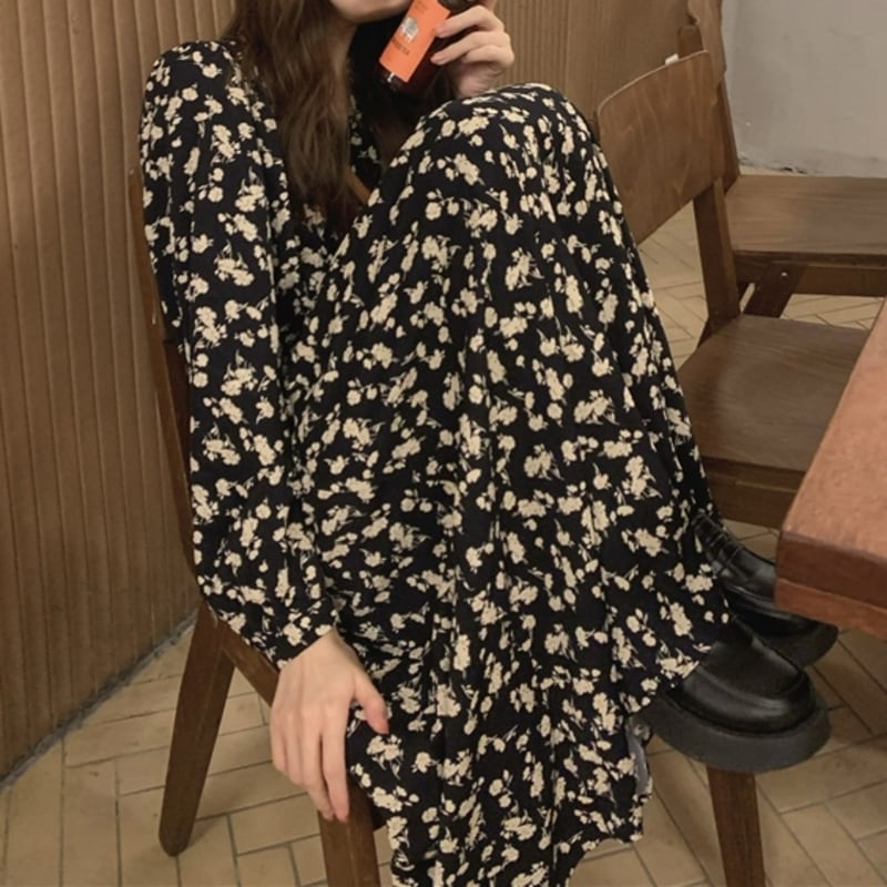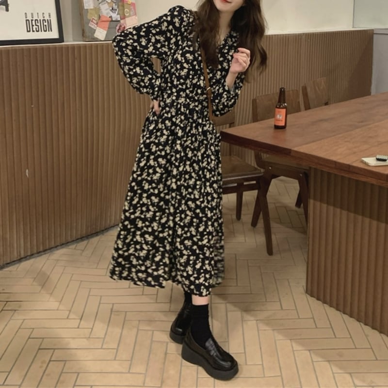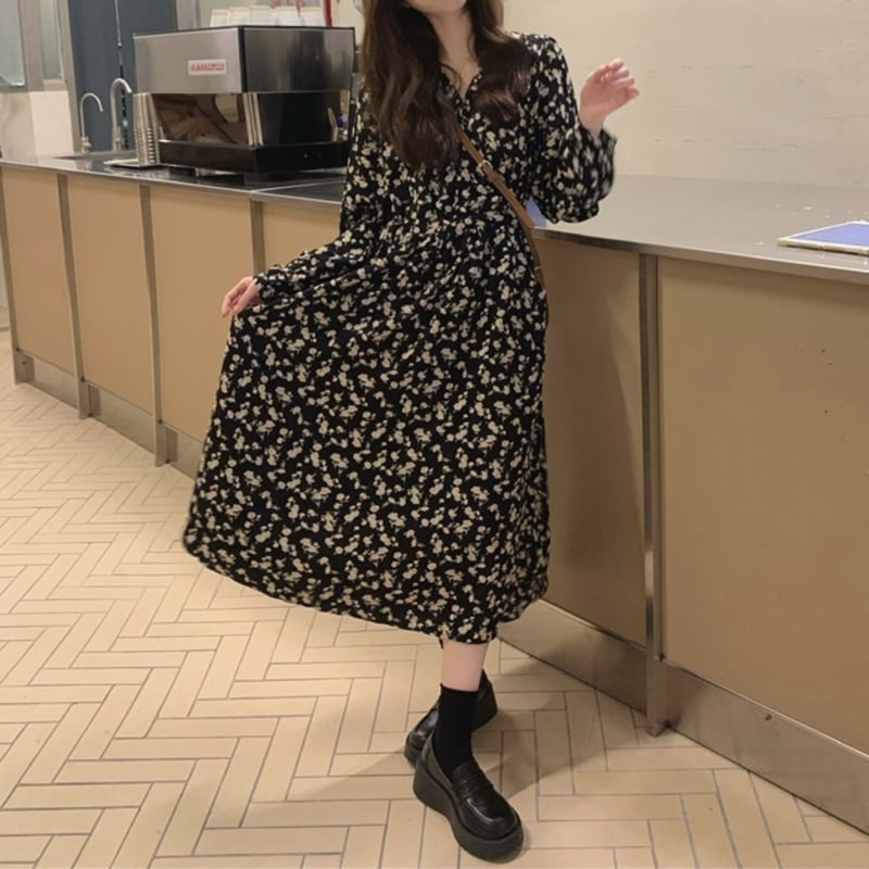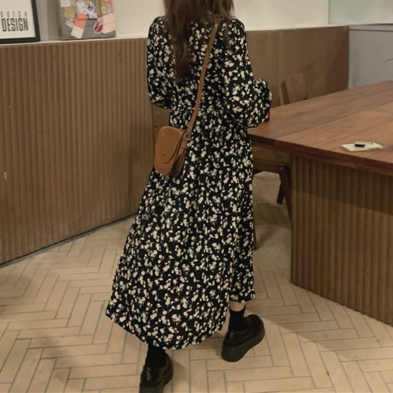 華やかなフラワープリントが目を惹くミモレ丈ワンピースです。