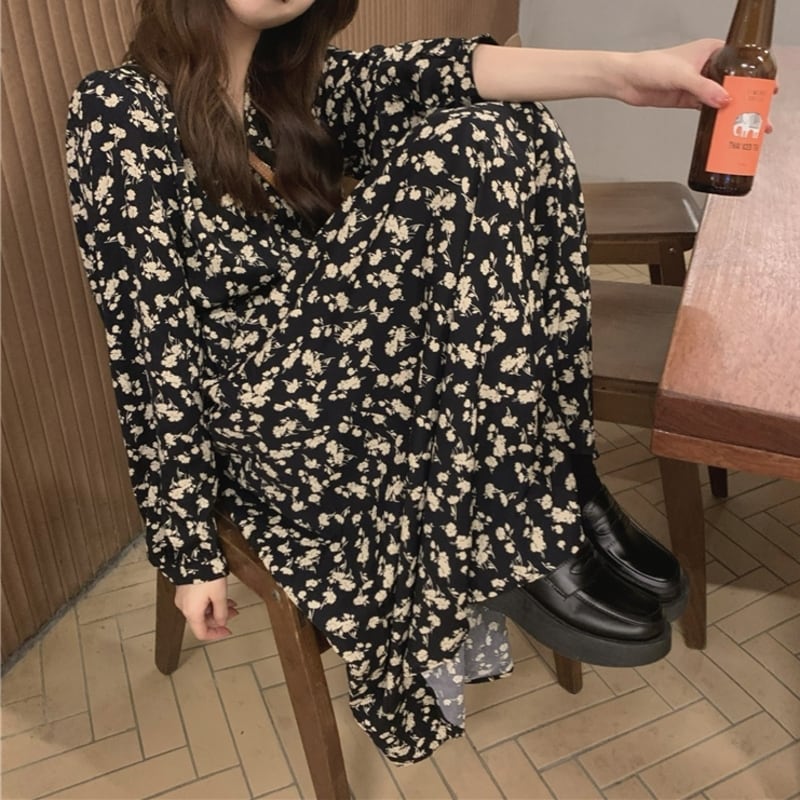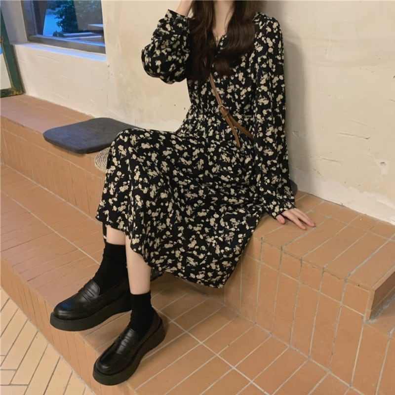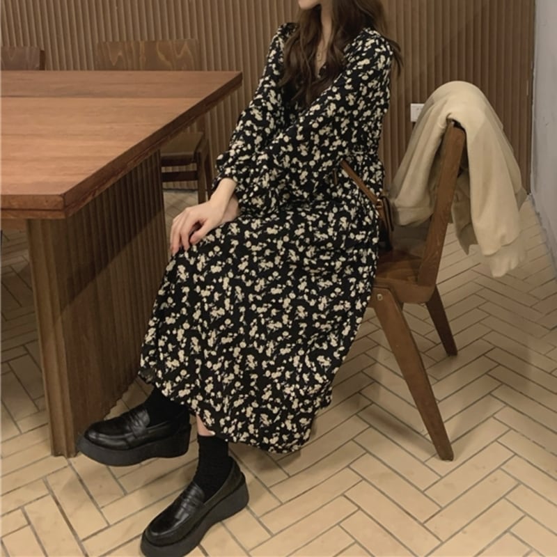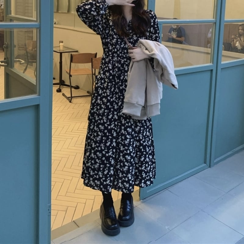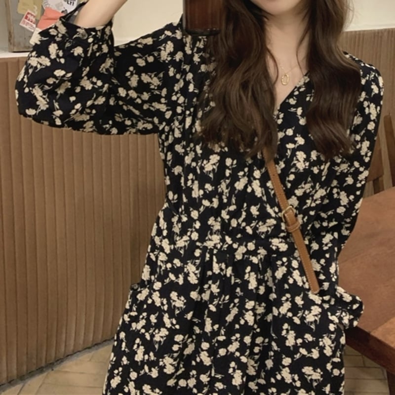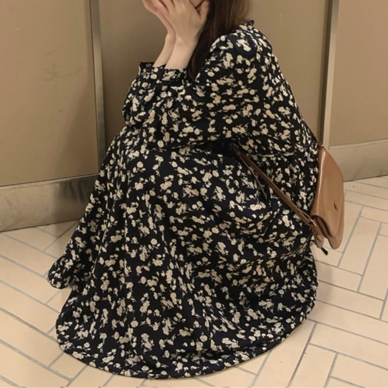 華やかなフラワープリントが目を惹くミモレ丈ワンピースです。