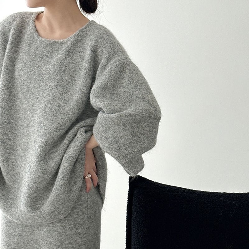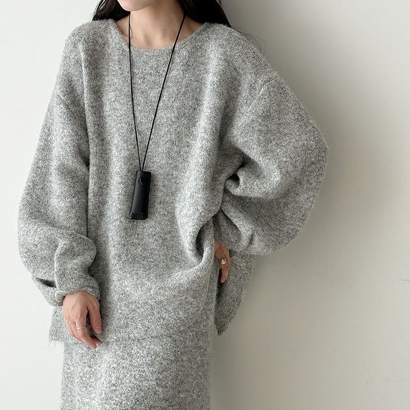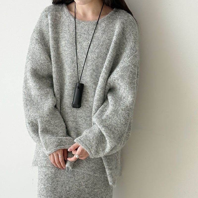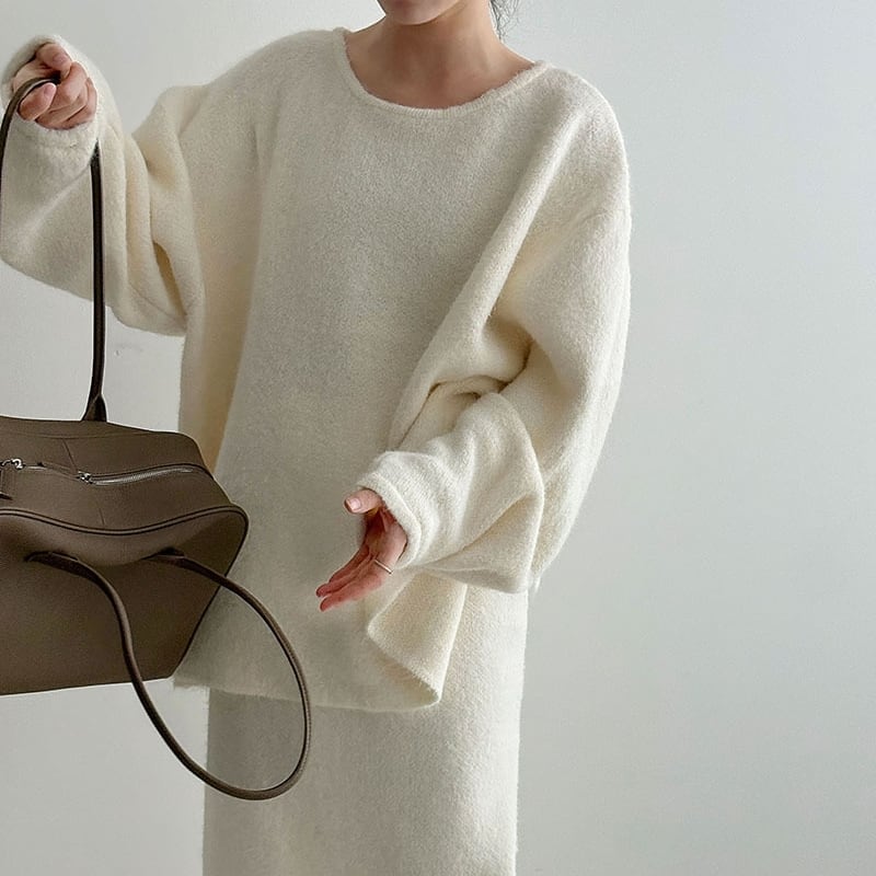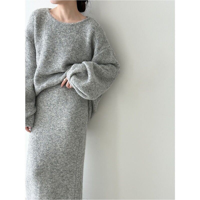 ゆったりとしたシルエットが魅力的なニットトップスとペンシルスカートのセットアップです。