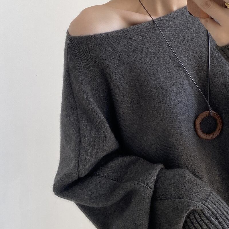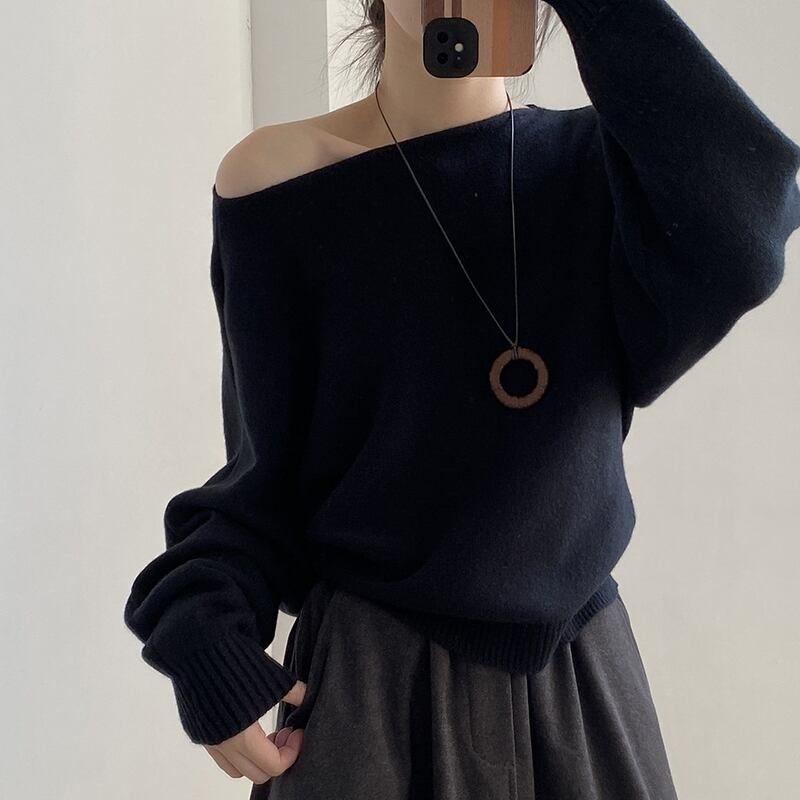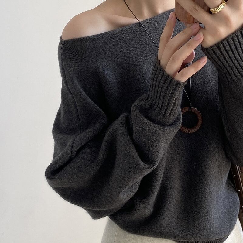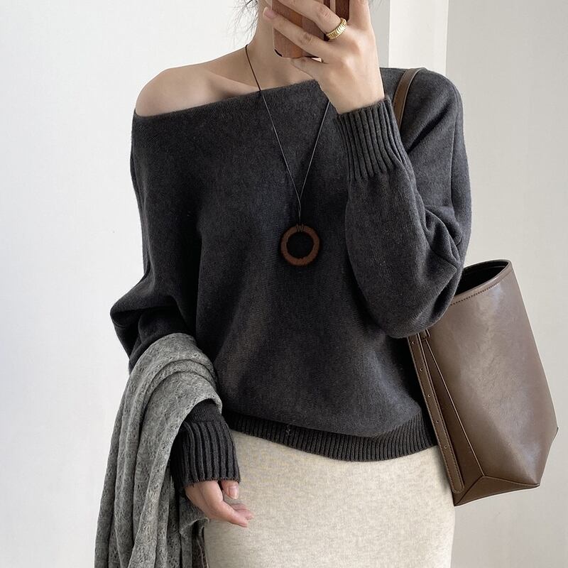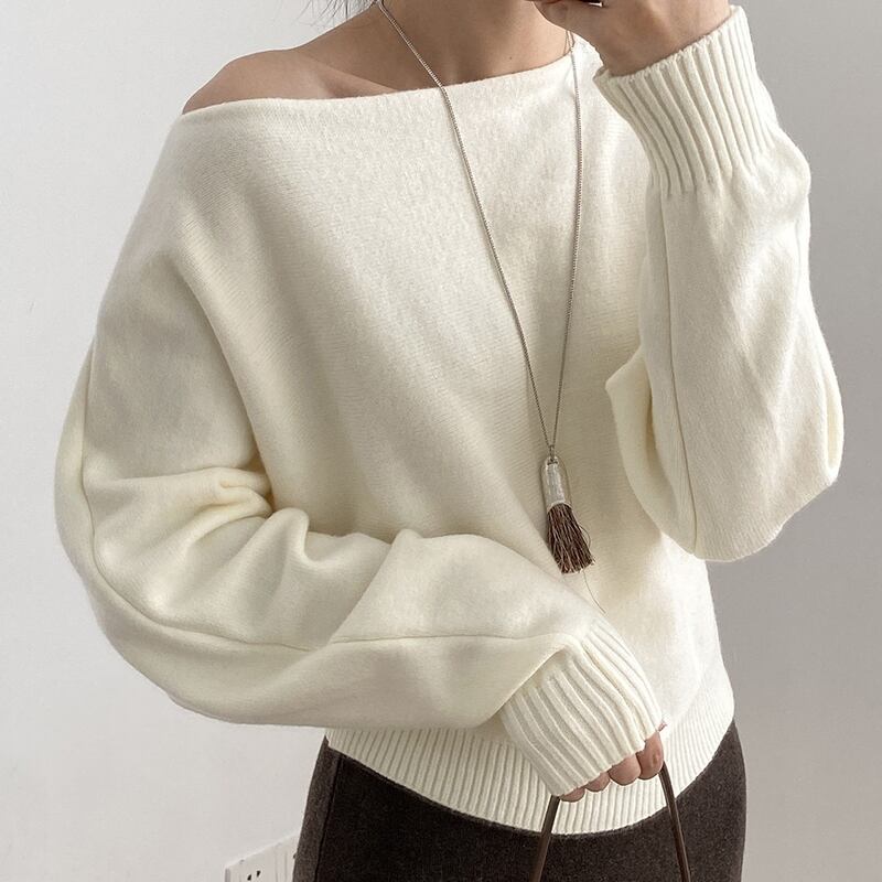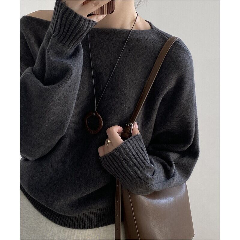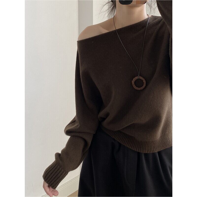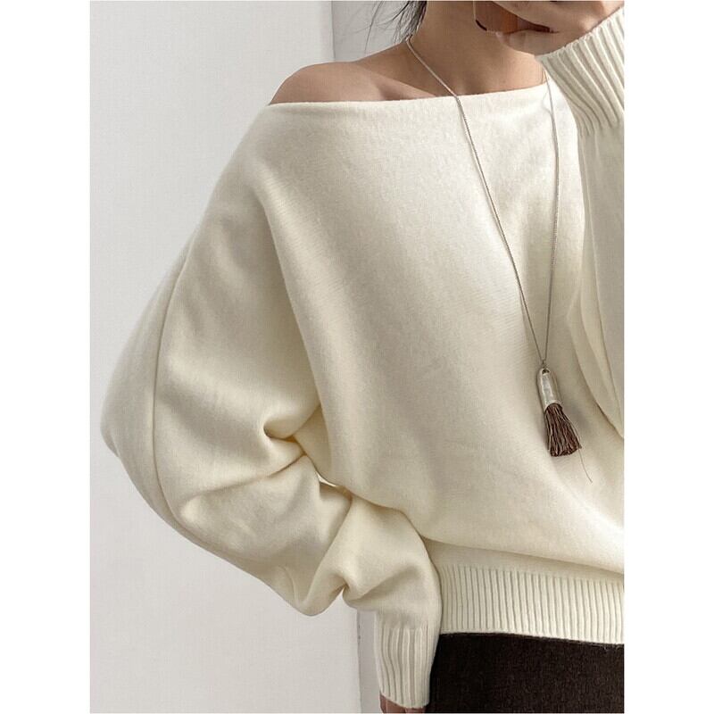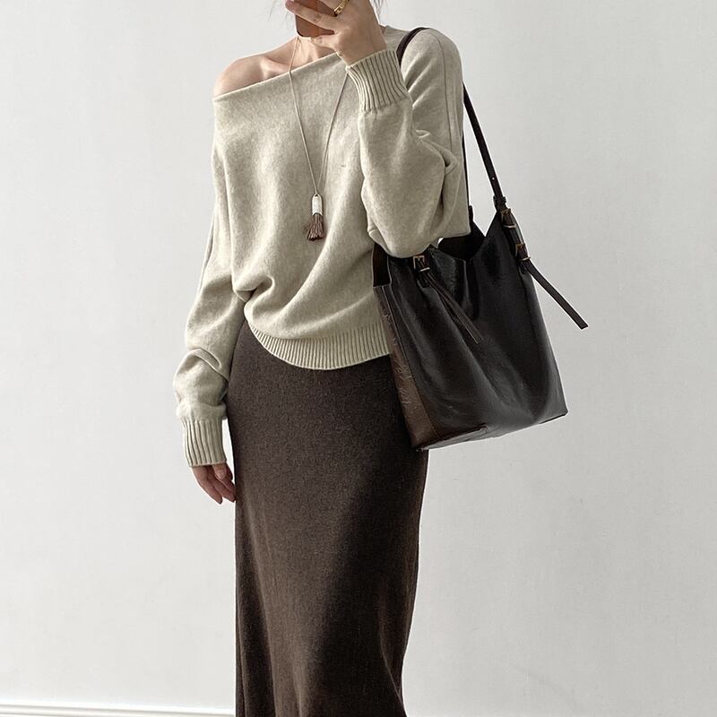 ワンショルダーとボートネックの2WAYで女性らしさを演出するリブ編みニット。