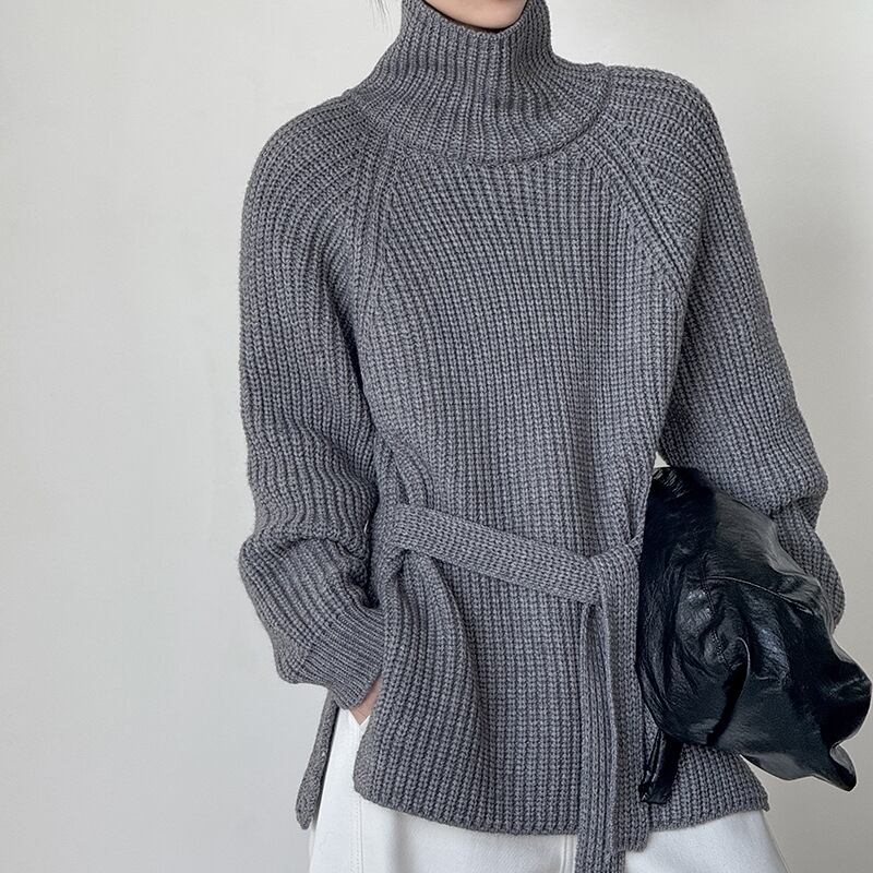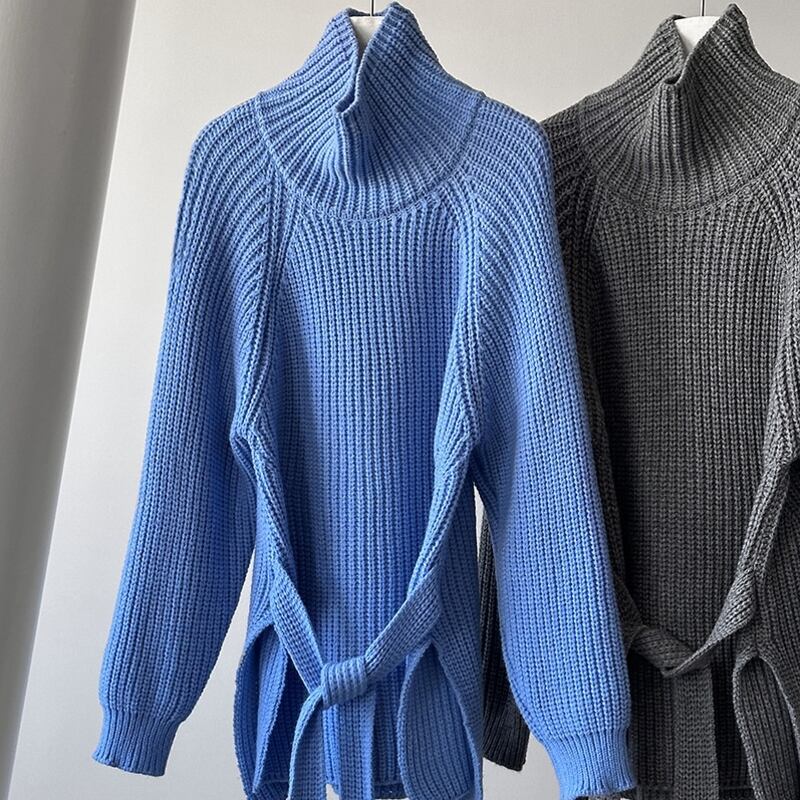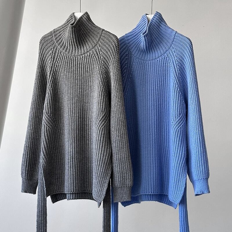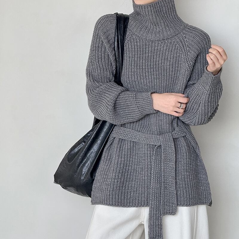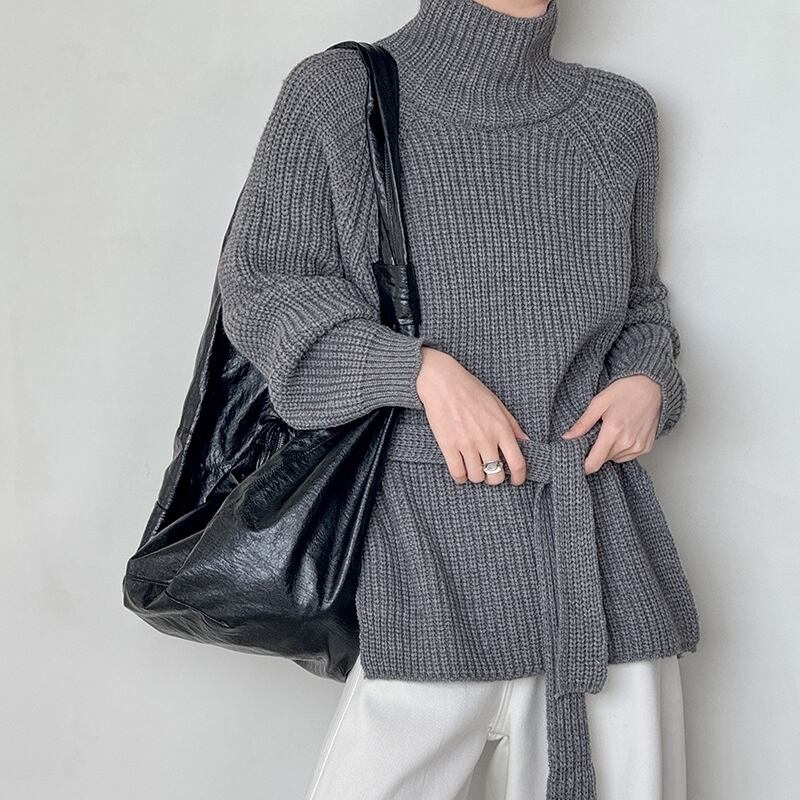 縦ラインを強調するリブ編みが、すっきりとした印象を与えるハイネックニットです。