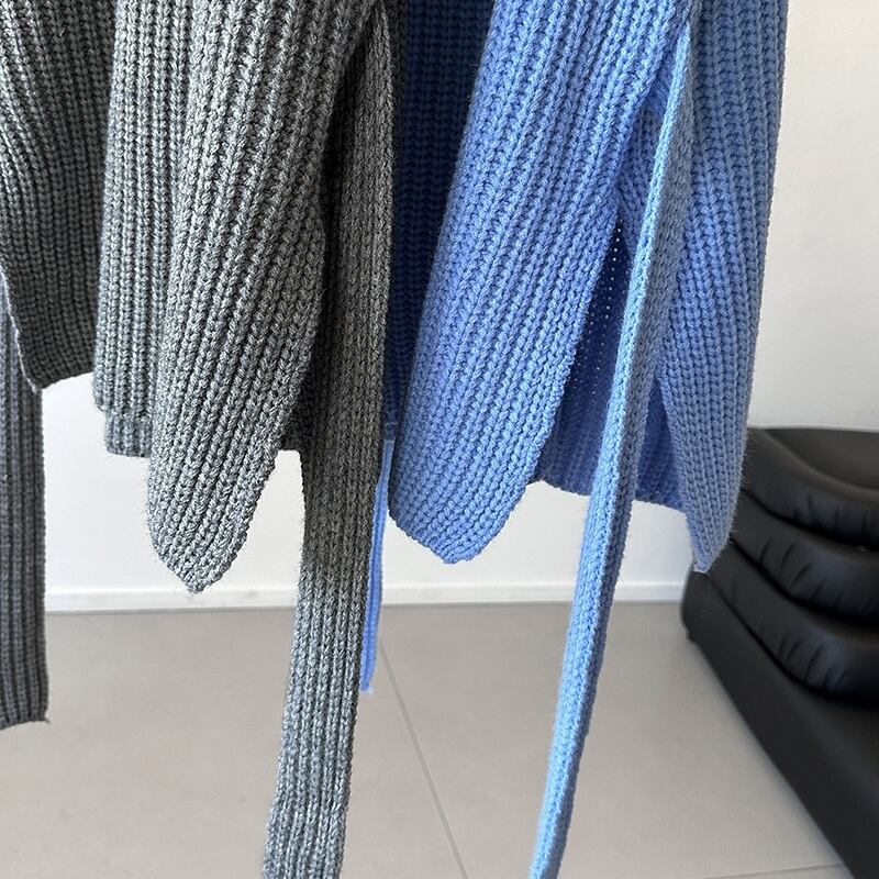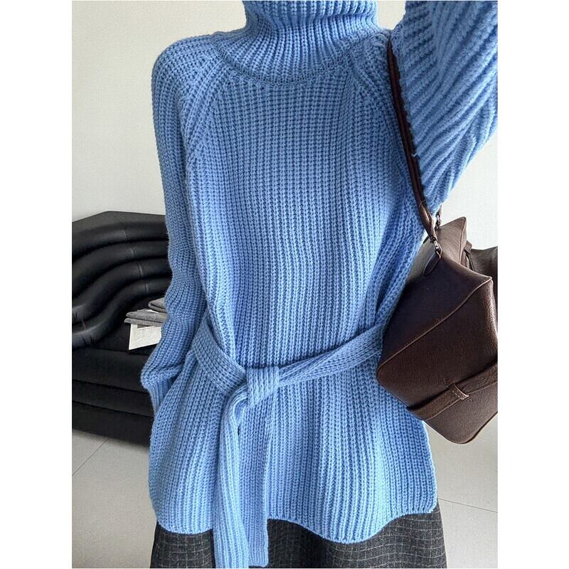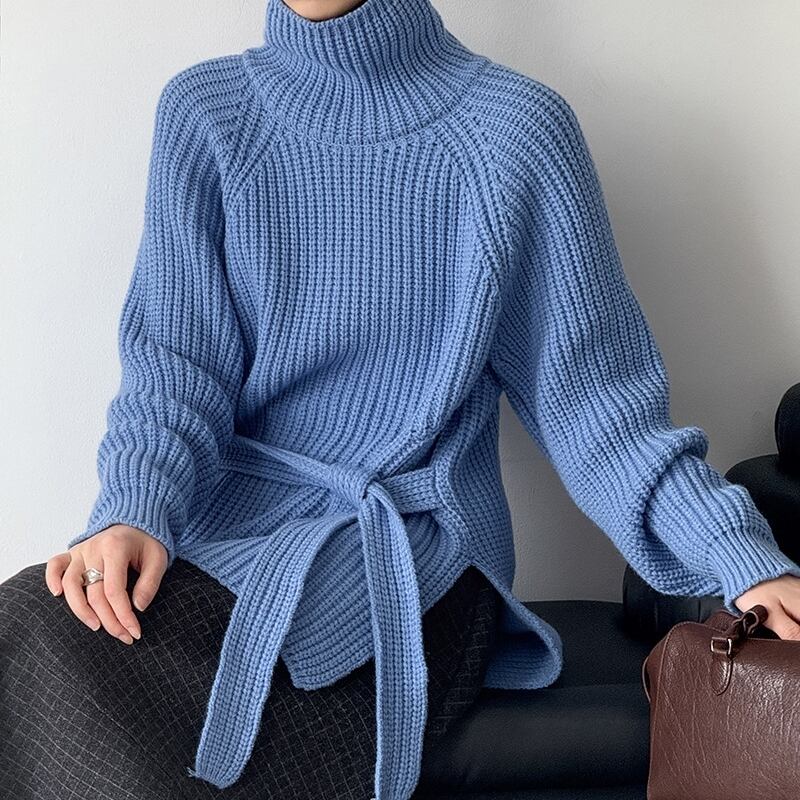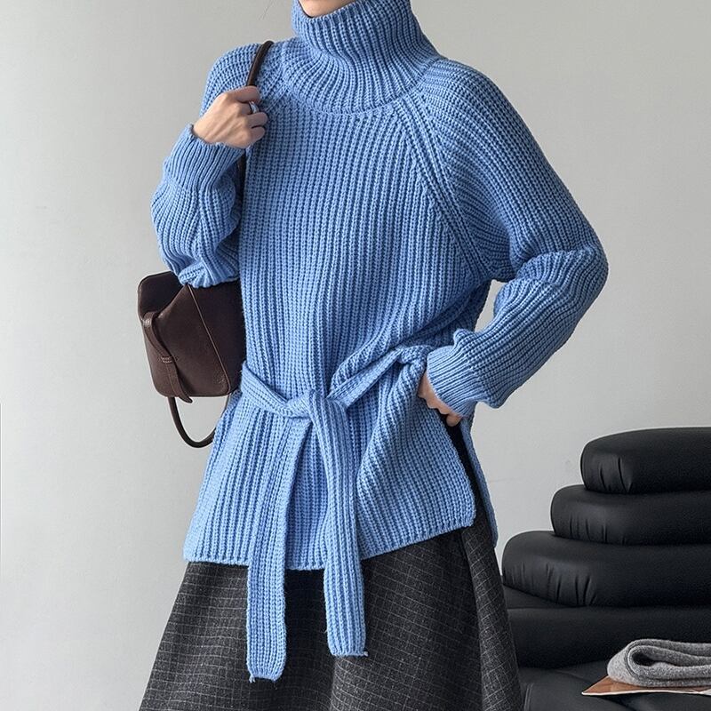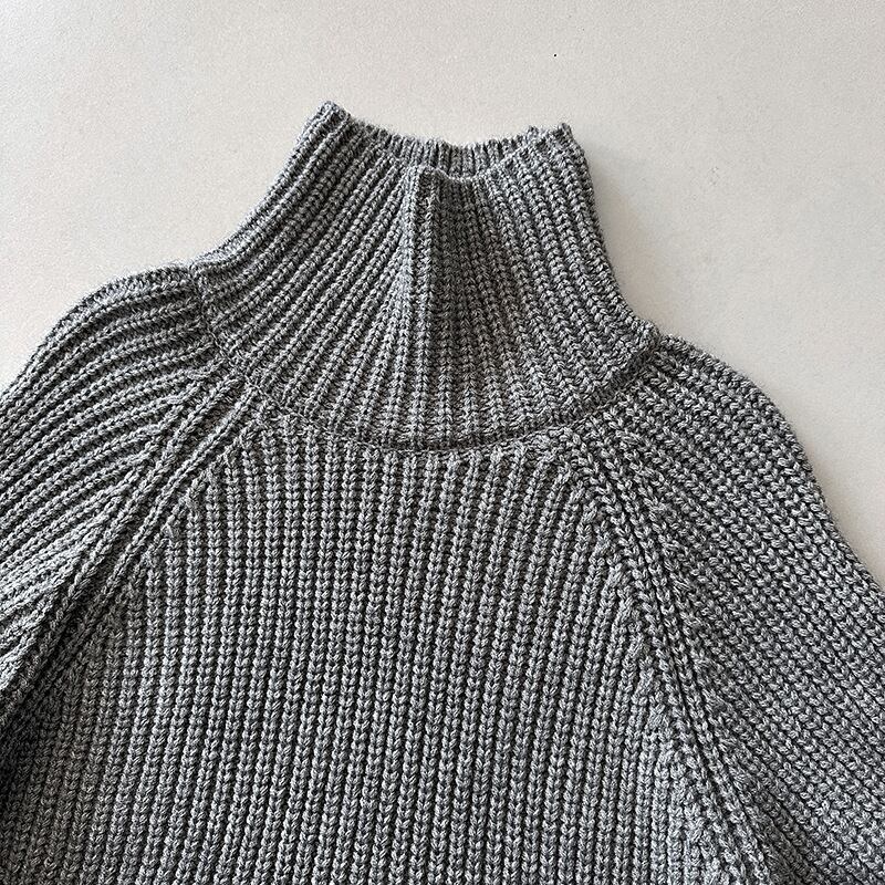 縦ラインを強調するリブ編みが、すっきりとした印象を与えるハイネックニットです。