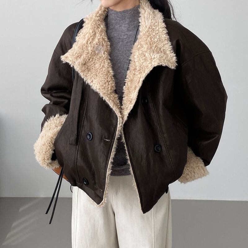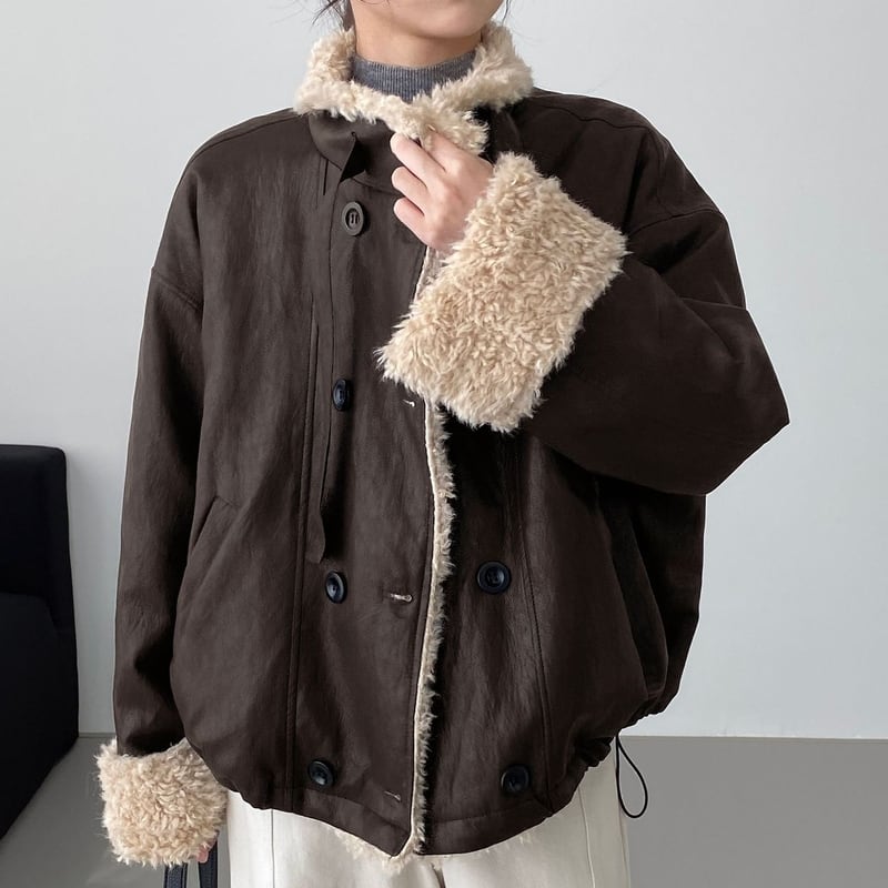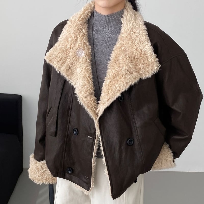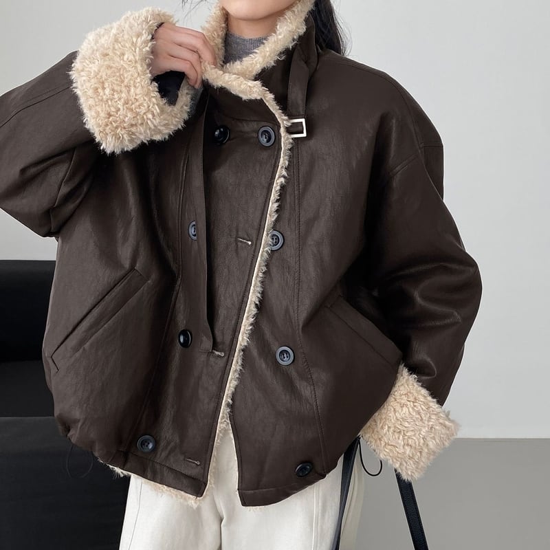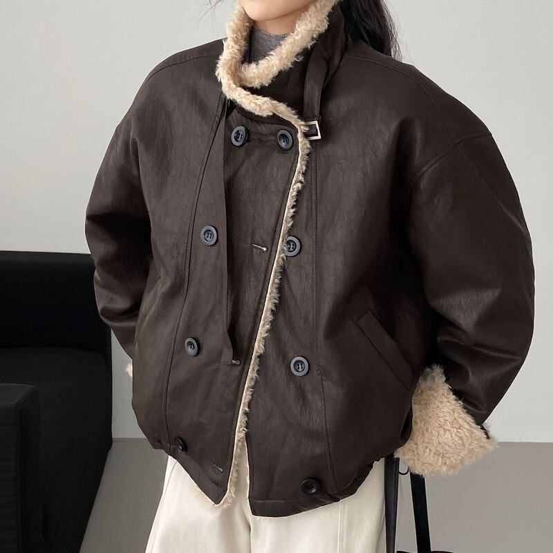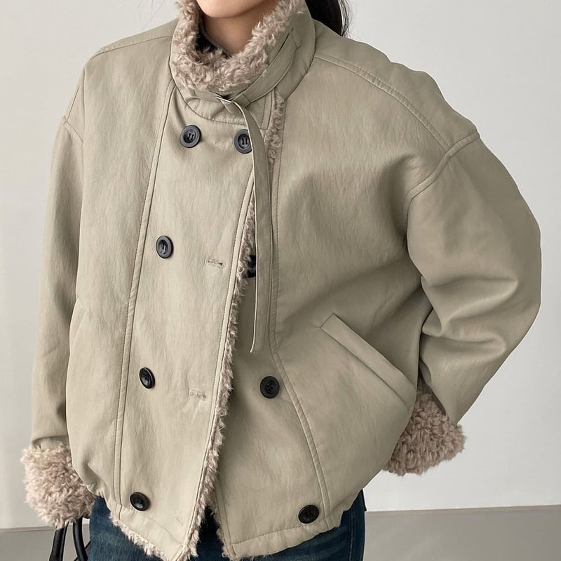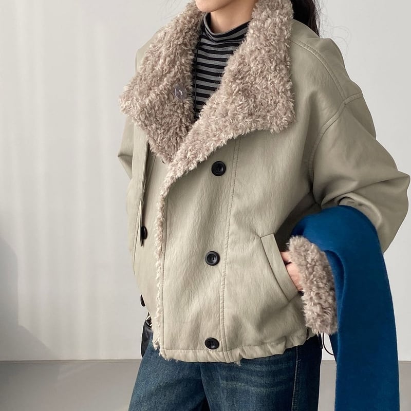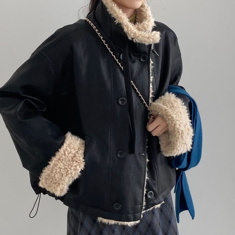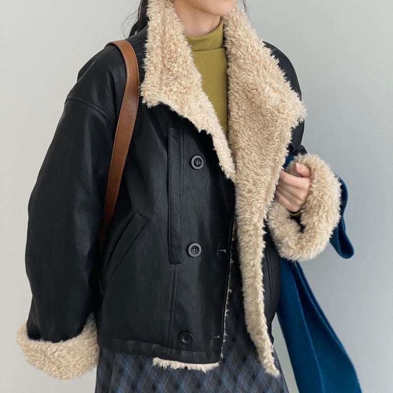フェイクレザー素材で仕立てられた、トレンド感溢れるジャケットです。