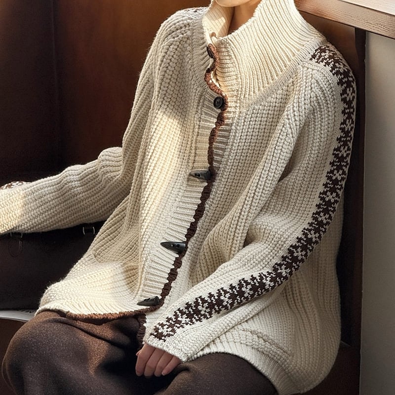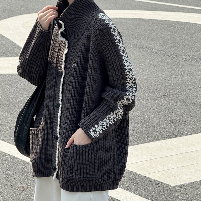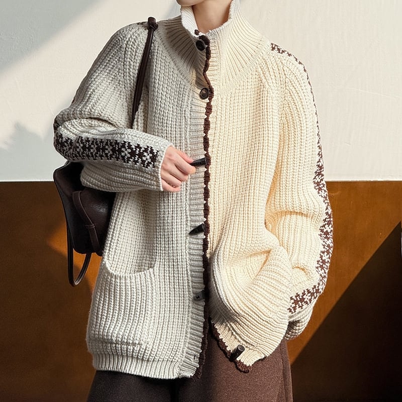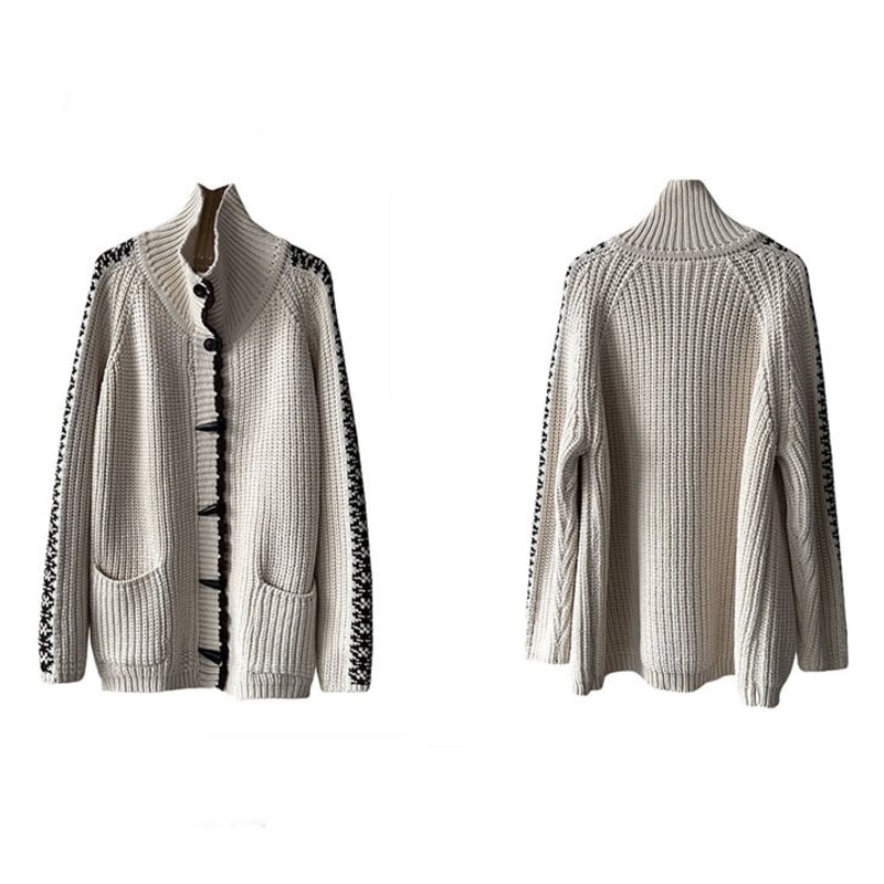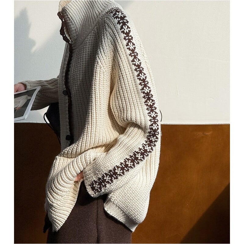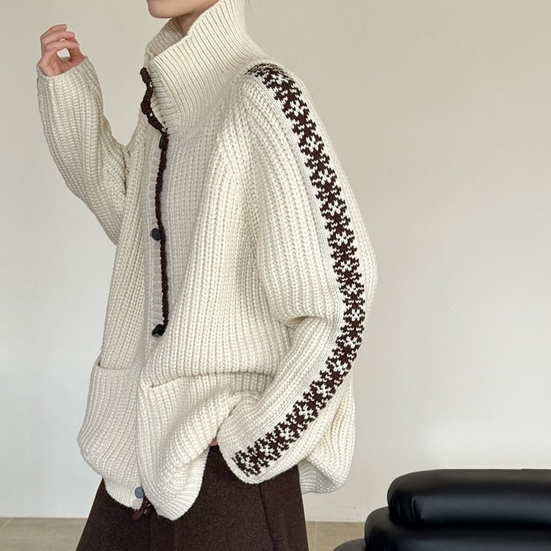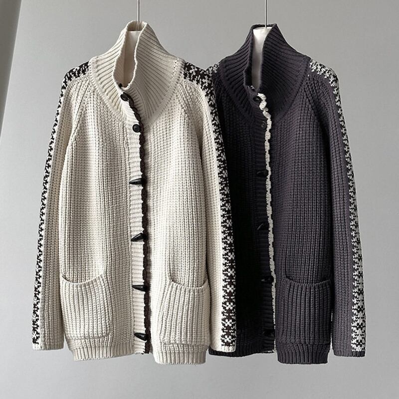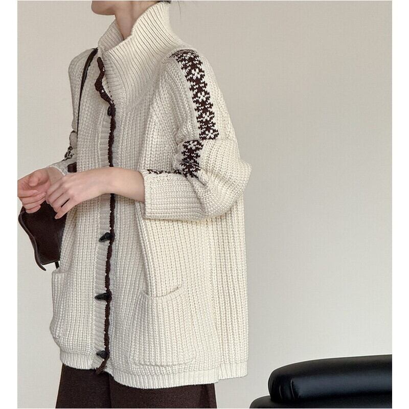 クラシカルな編地が特徴のハイネックニットカーディガンです。