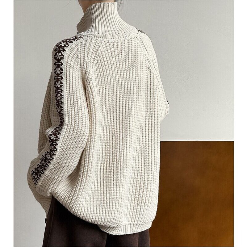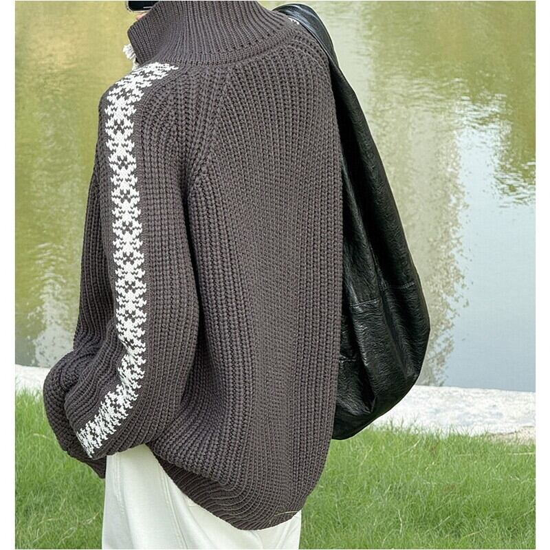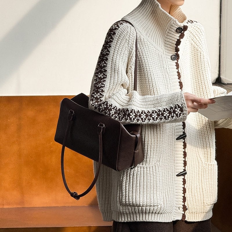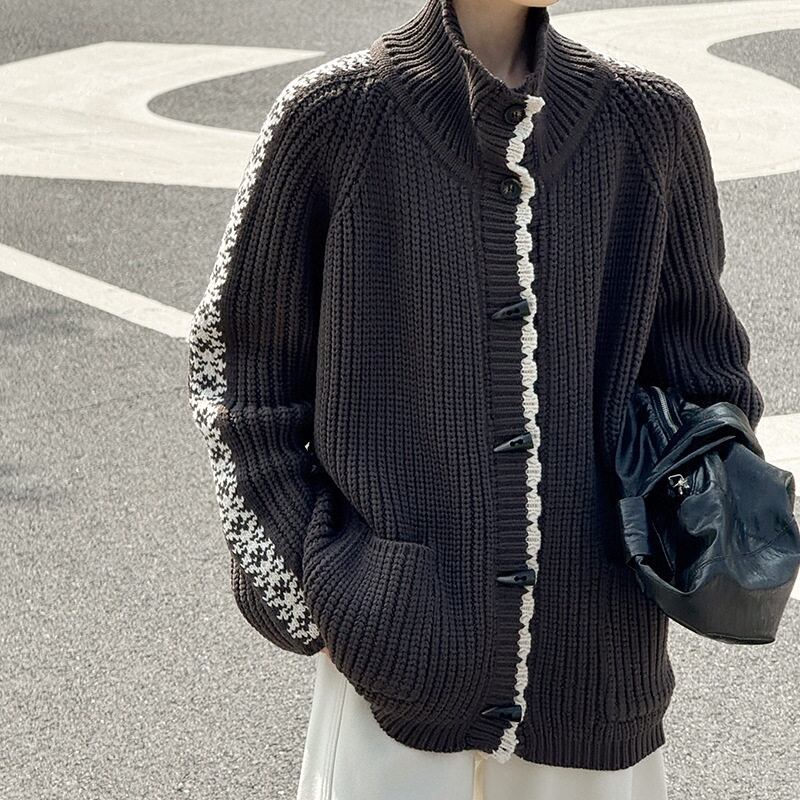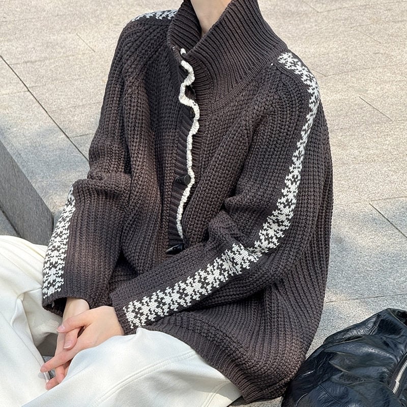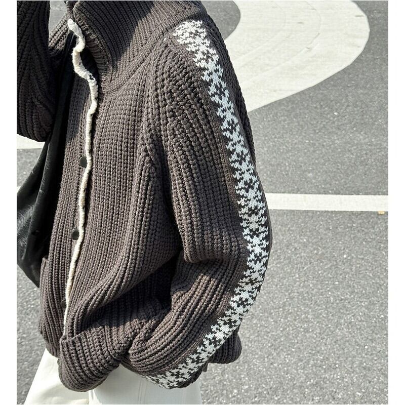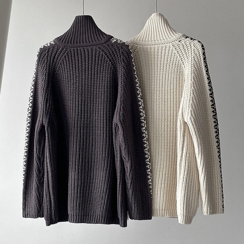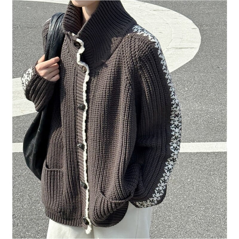 クラシカルな編地が特徴のハイネックニットカーディガンです。