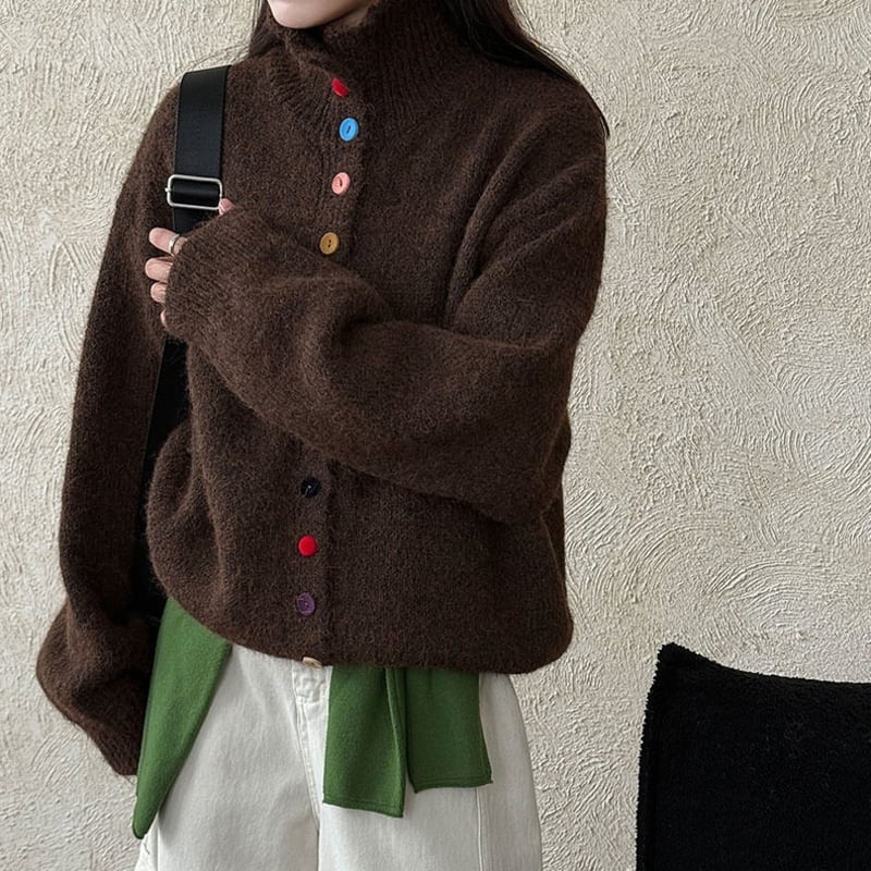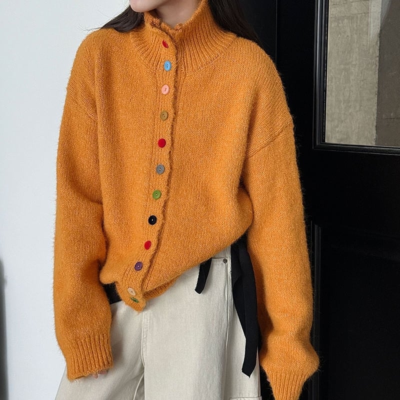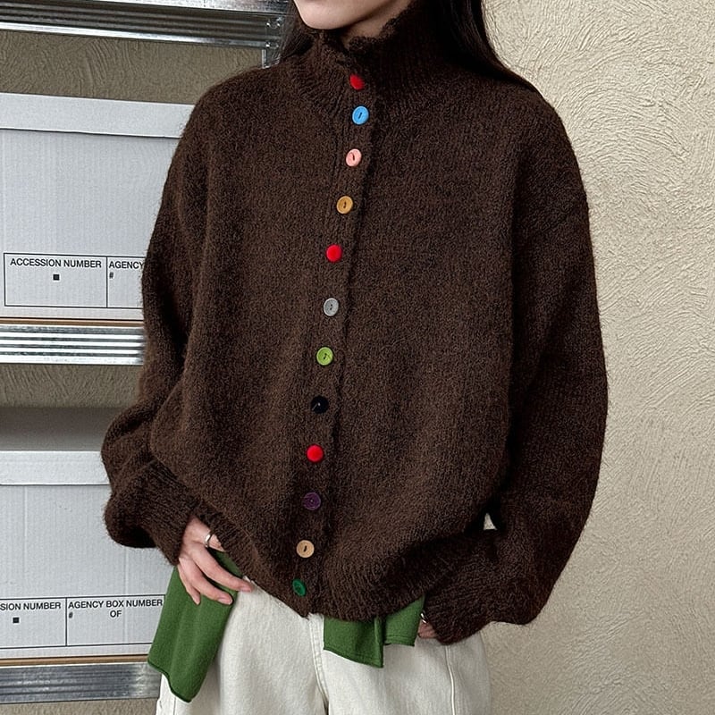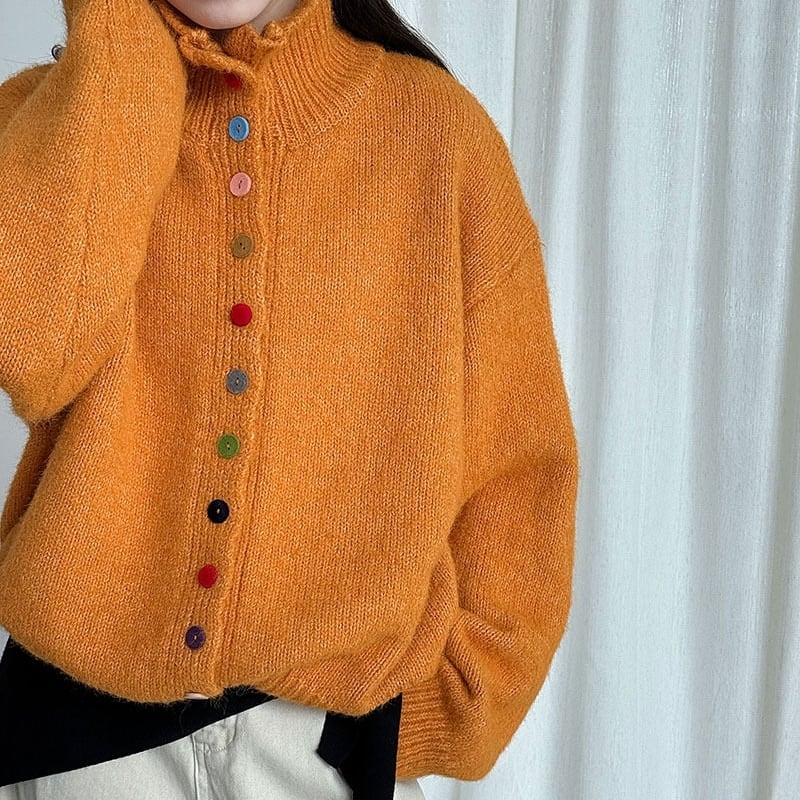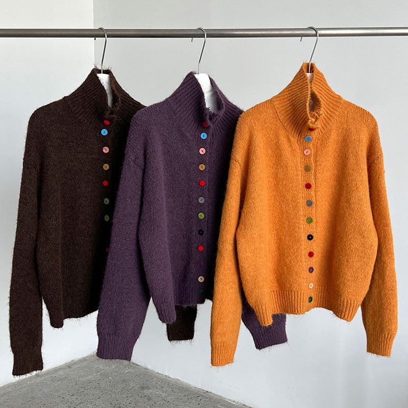 目を引くカラフルなボタンがアクセントになり、コーディネートの主役になること間違いなし。