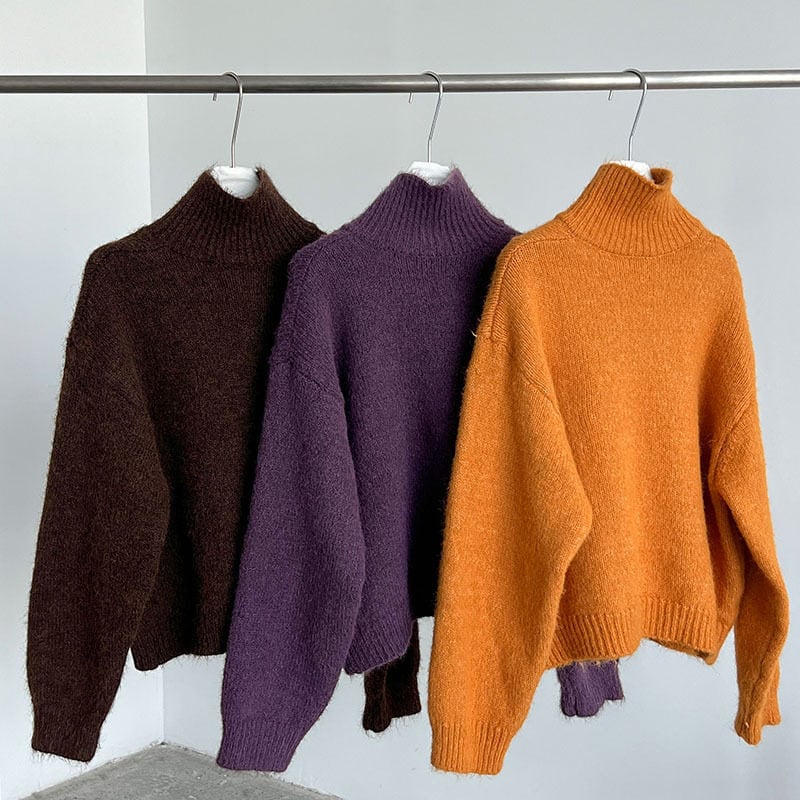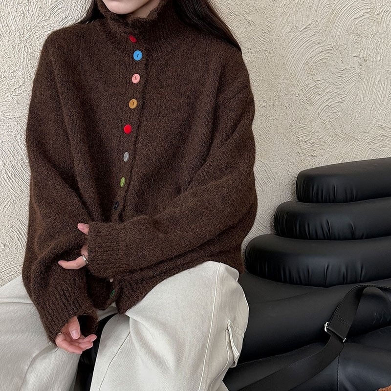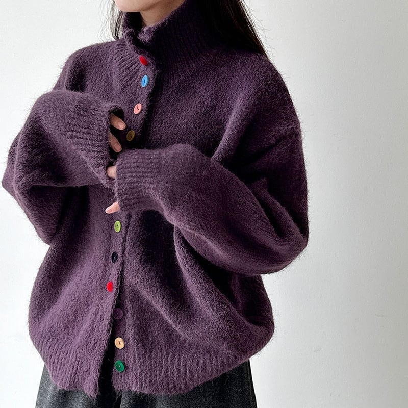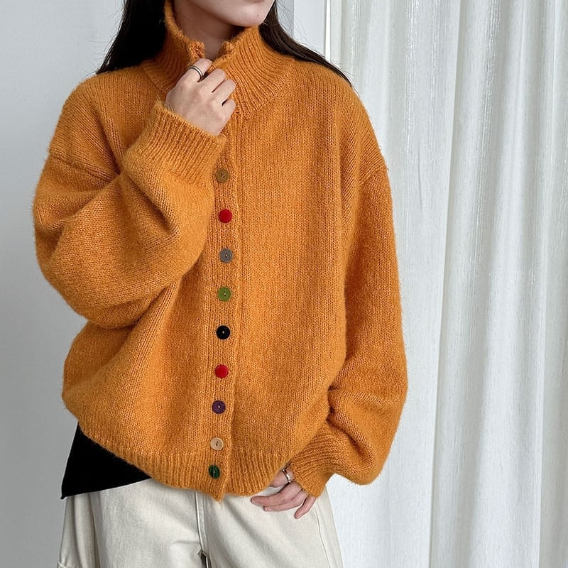 首元をすっきりと見せるスタンドネックがポイントのニットカーディガンです。