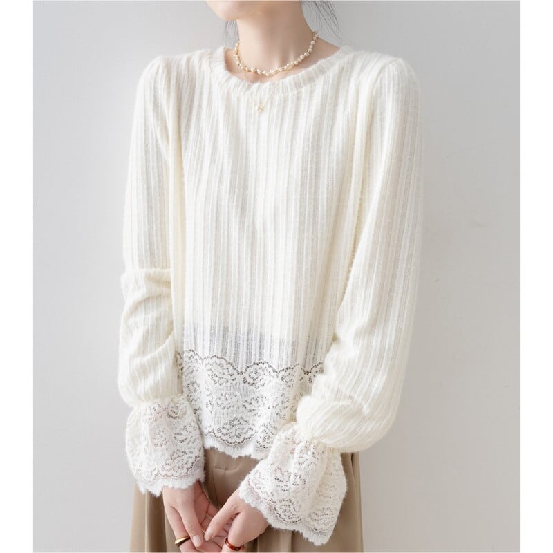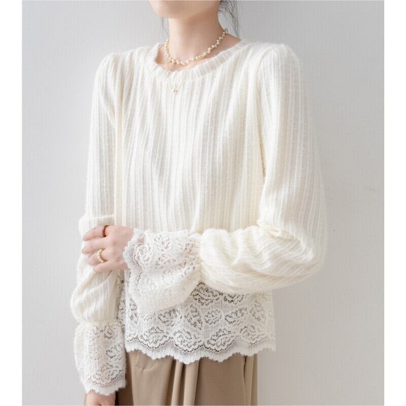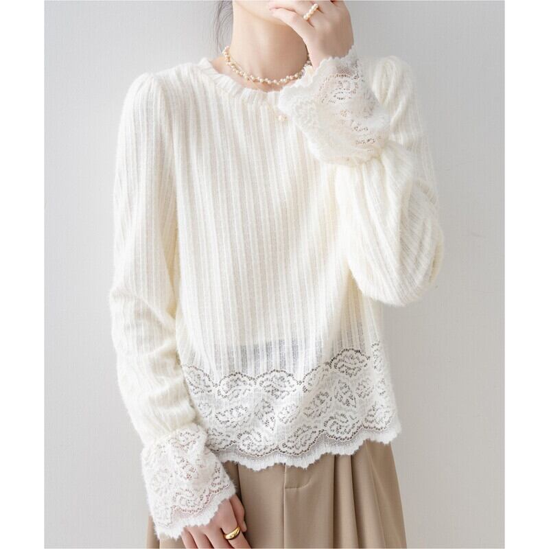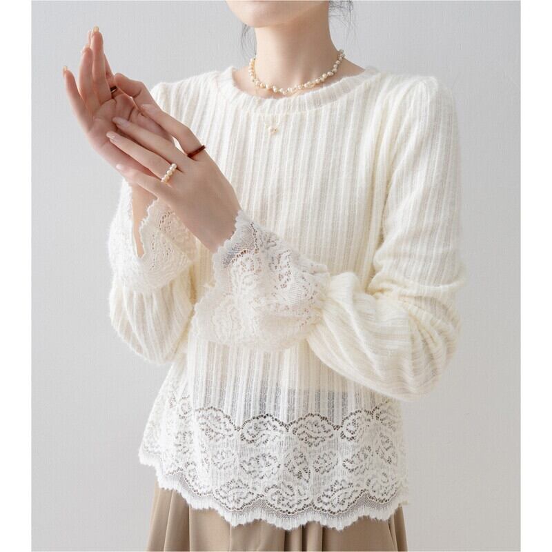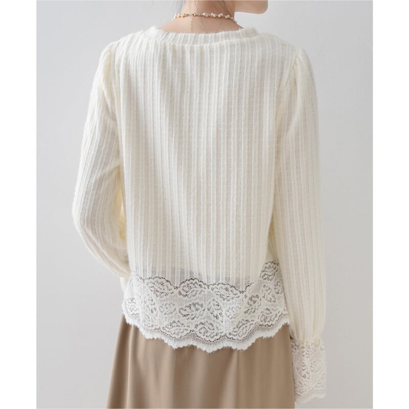 袖と裾にあしらわれた繊細なレースが、フェミニンな雰囲気をプラス。