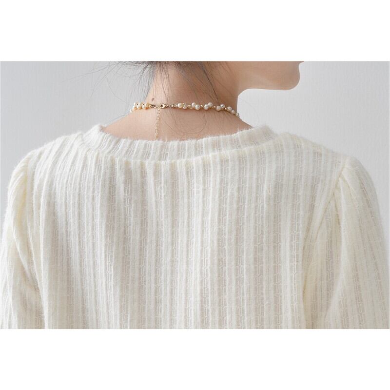 リブ編みの縦ラインが、すっきりとした印象を与える長袖トップスです。