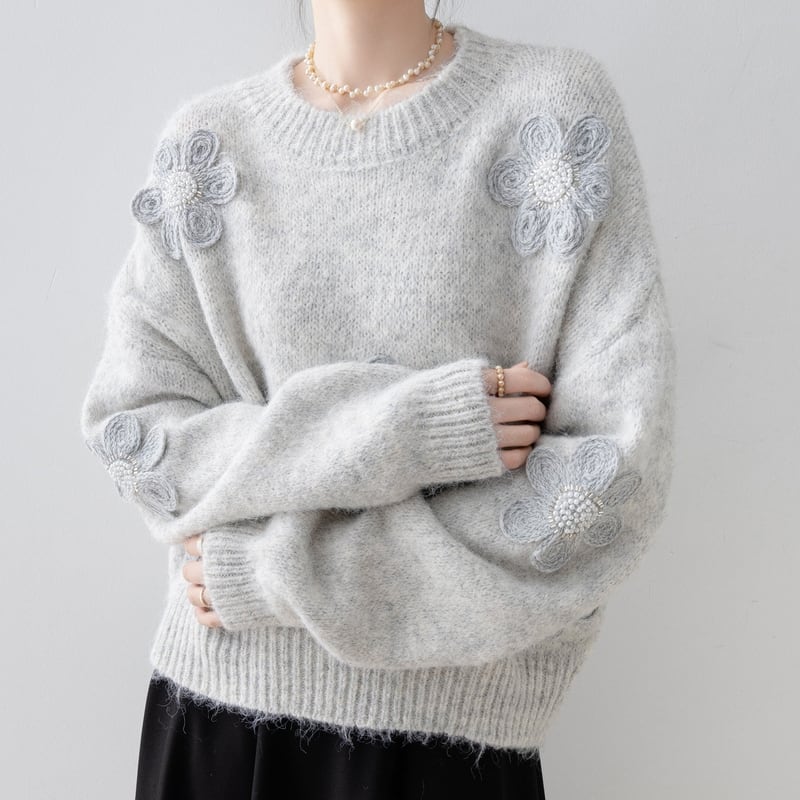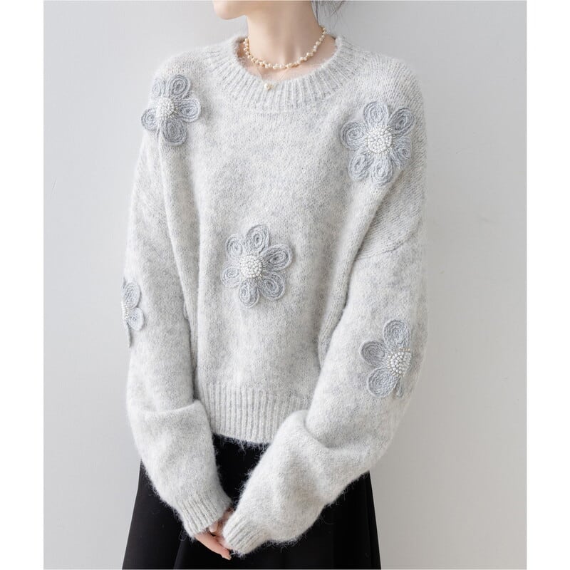 全体にあしらわれたフラワーモチーフが目を引くニットプルオーバーです。