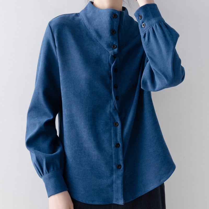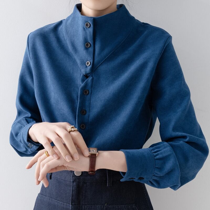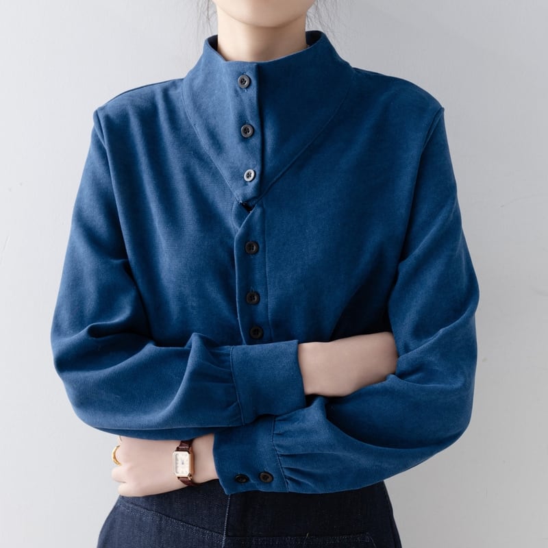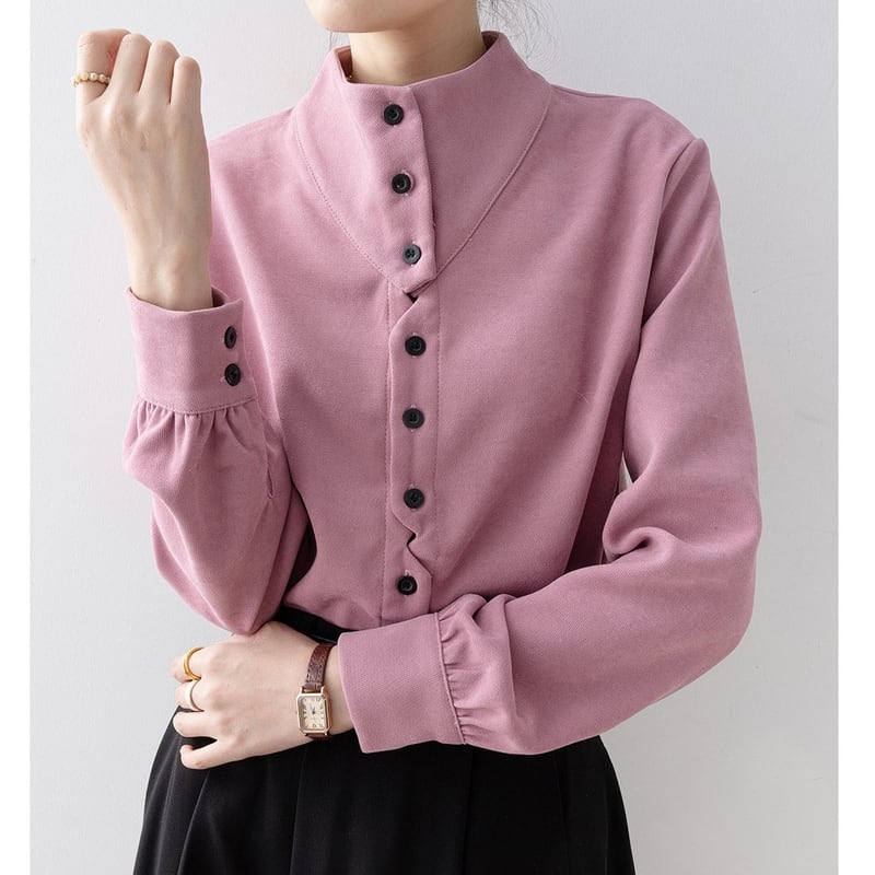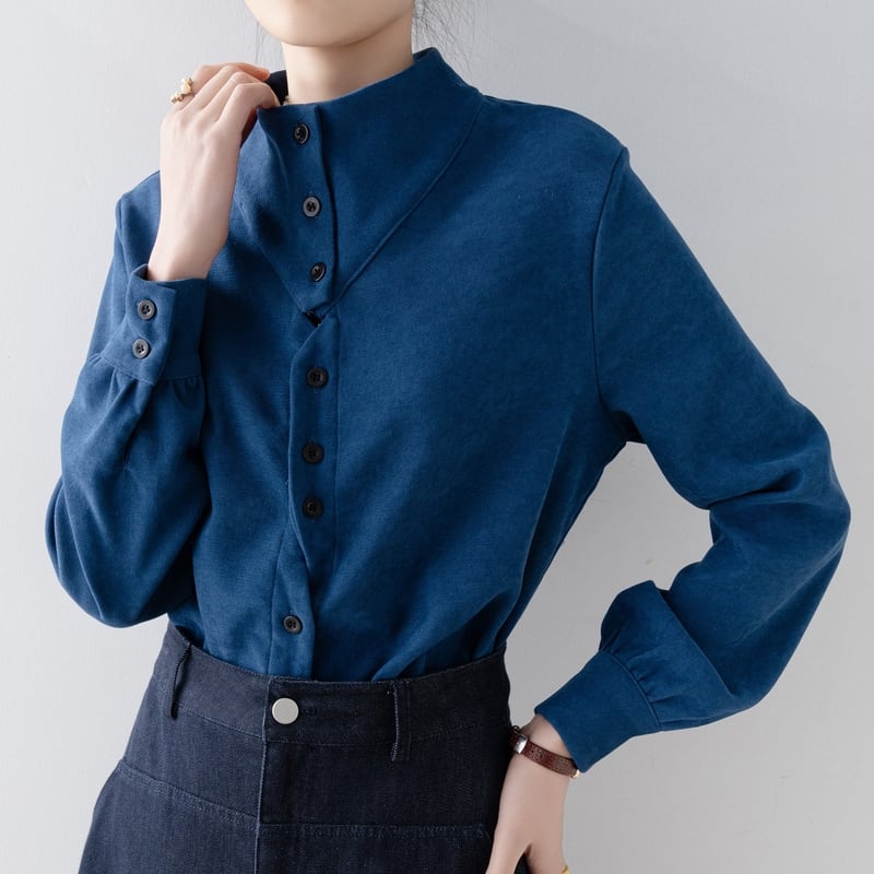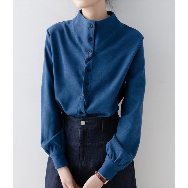 ノーカラーのボトルネックが上品な印象を与える長袖ブラウスです。