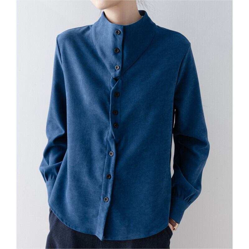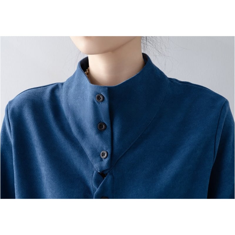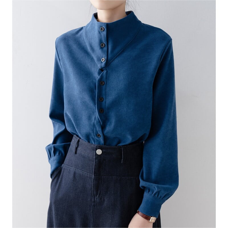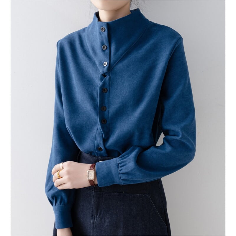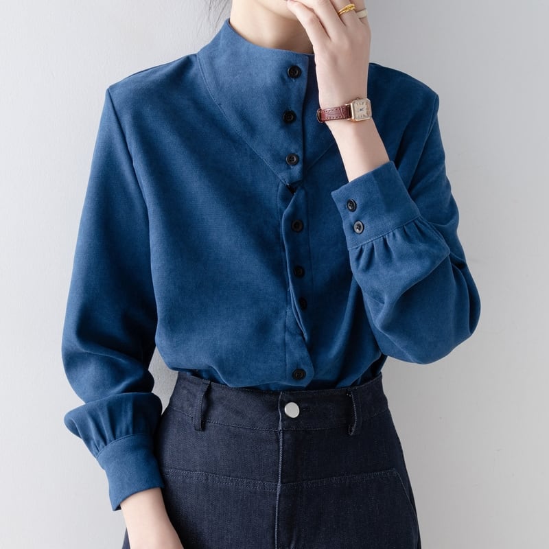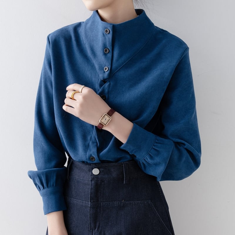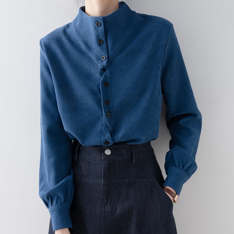 ノーカラーのボトルネックが上品な印象を与える長袖ブラウスです。