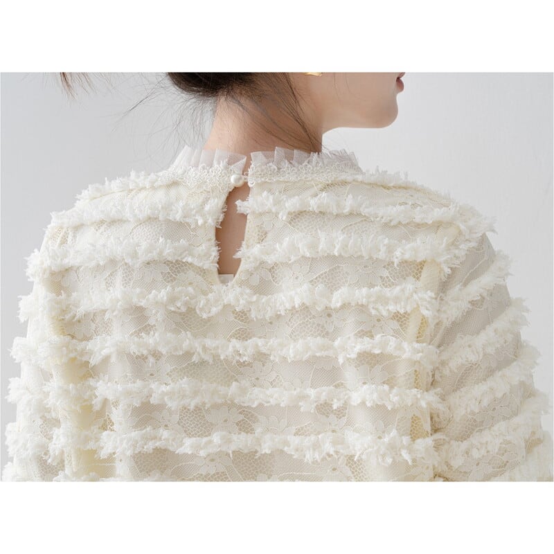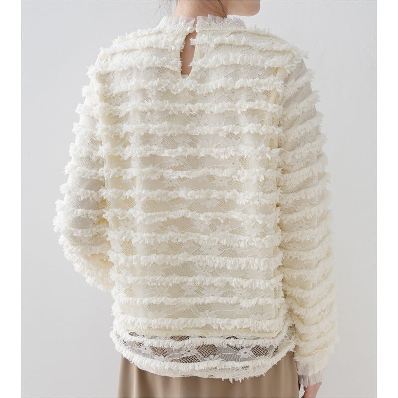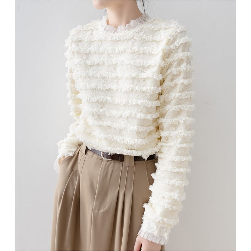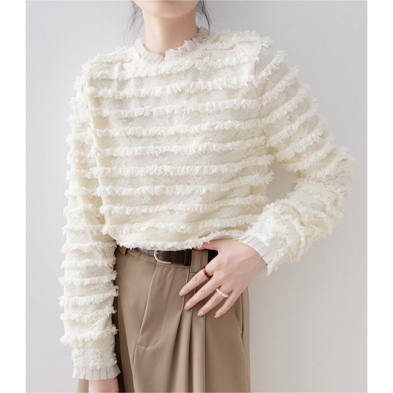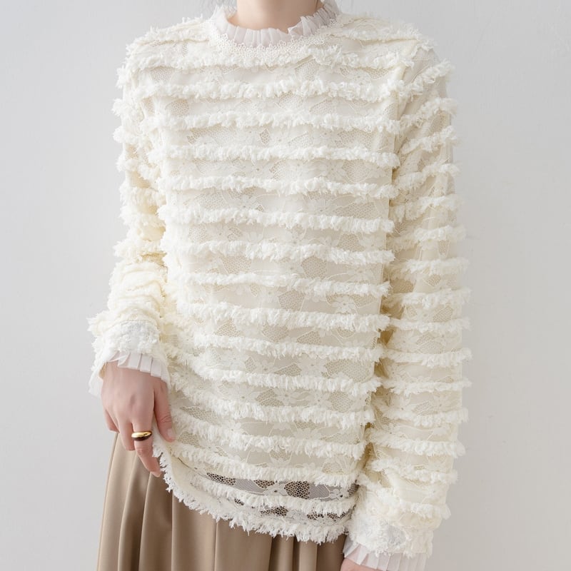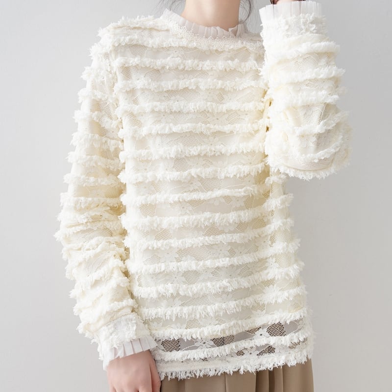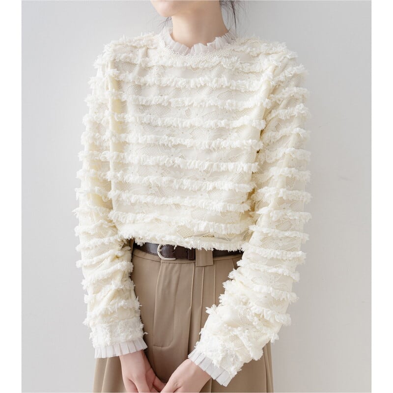 フリンジ調のフリル装飾が目を惹く、ドレッシーなプルオーバータイプのブラウスです。