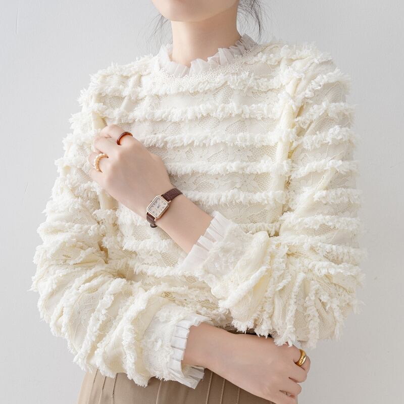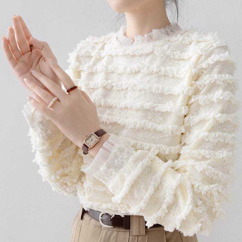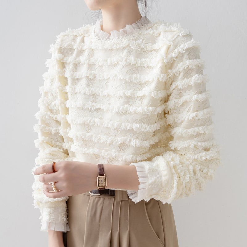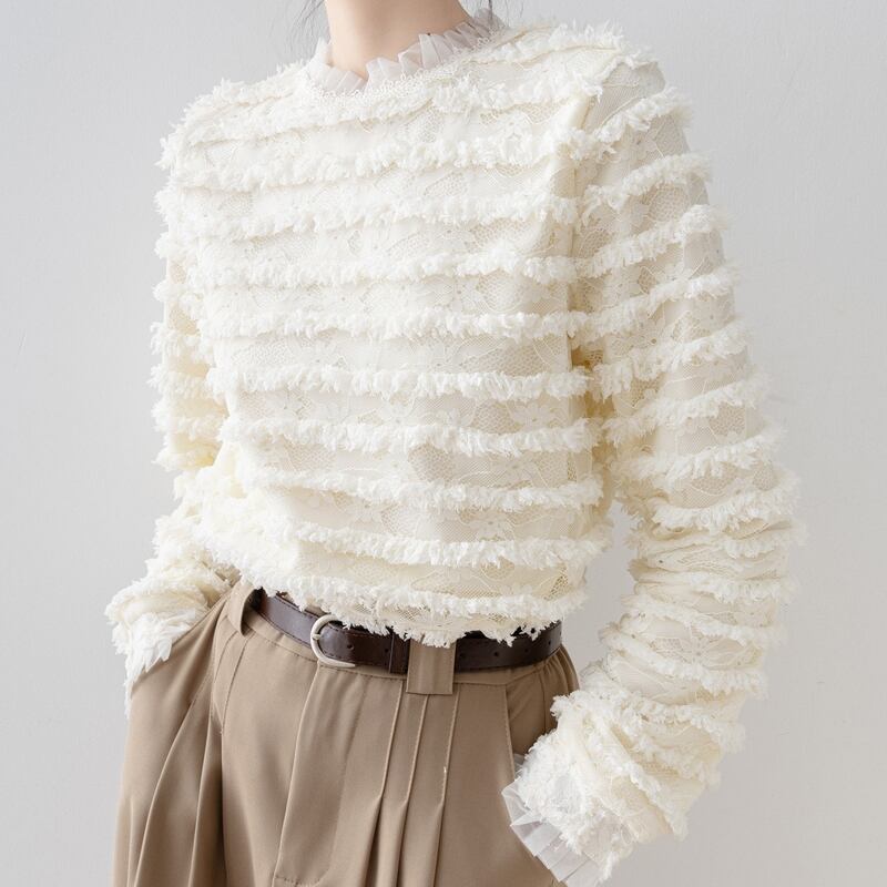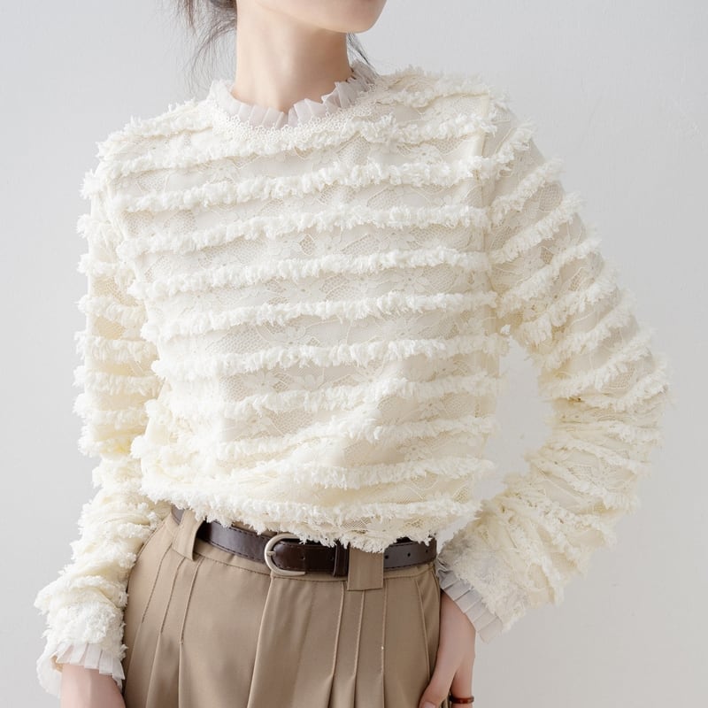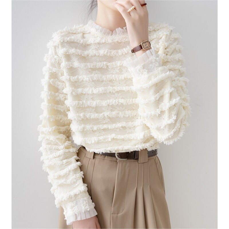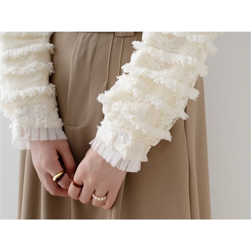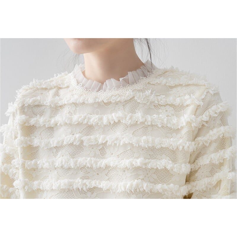 フリンジ調のフリル装飾が目を惹く、ドレッシーなプルオーバータイプのブラウスです。