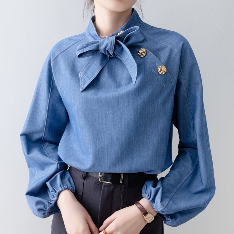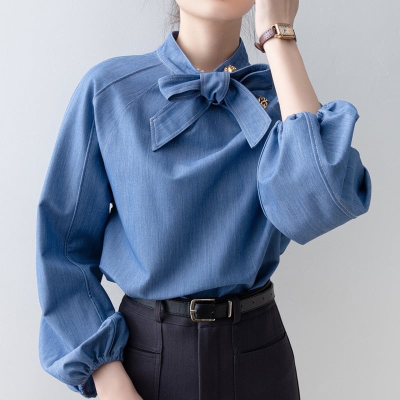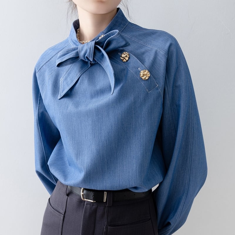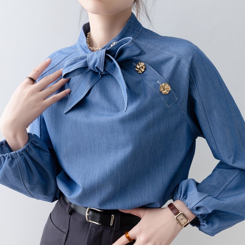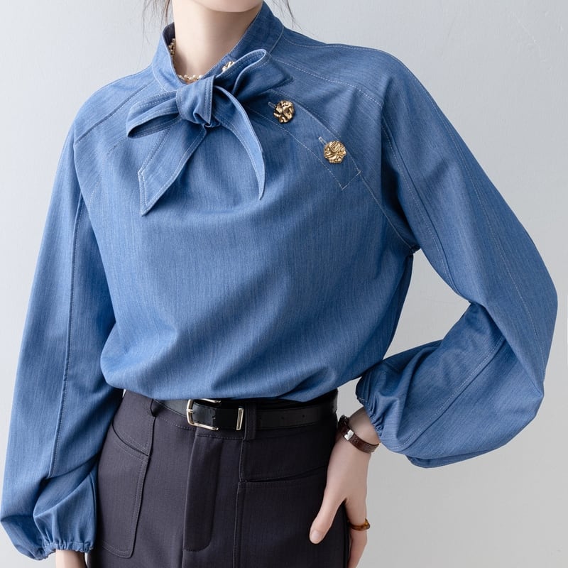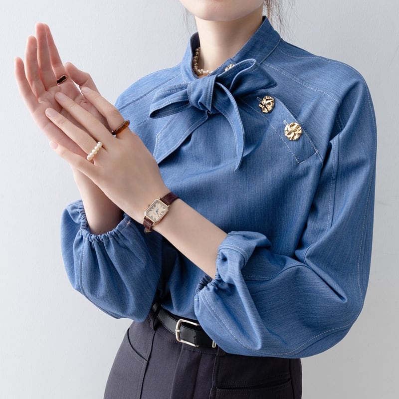 ボウタイデザインが上品な印象をプラスする長袖シャツです。