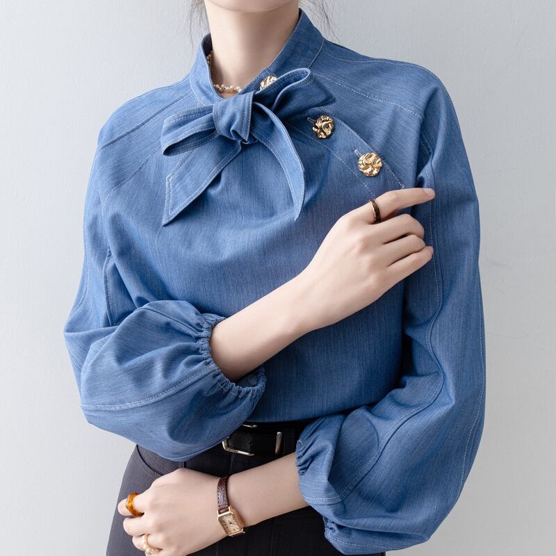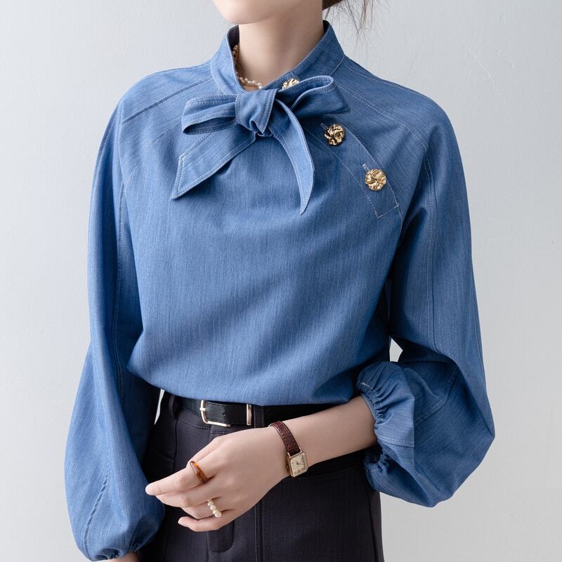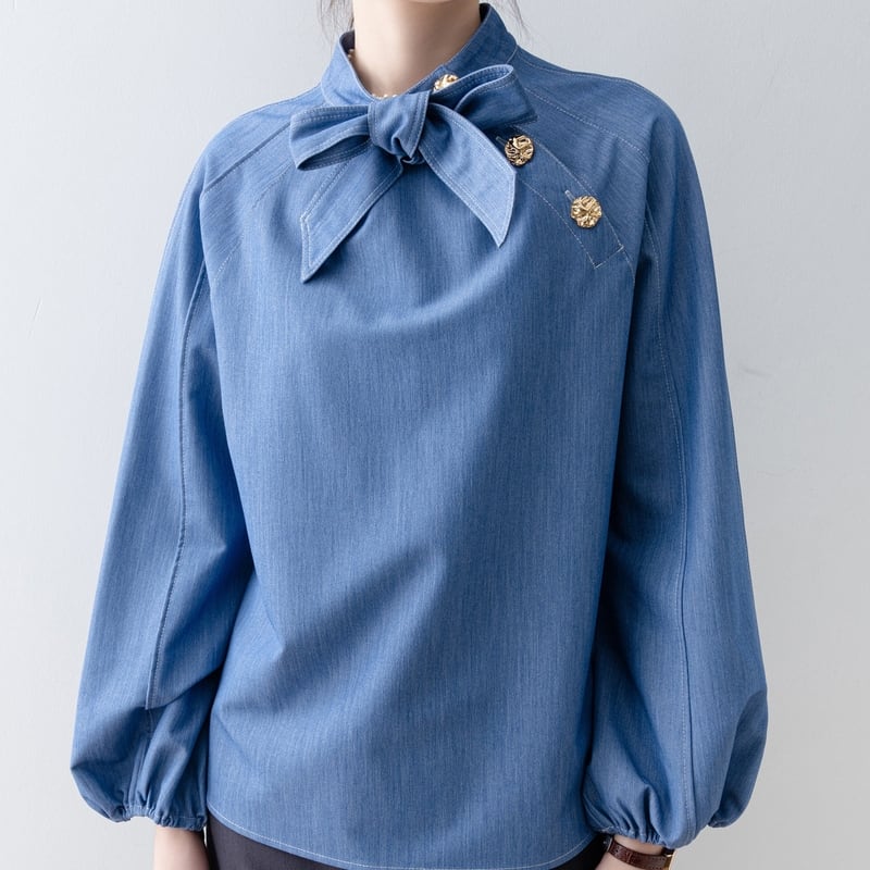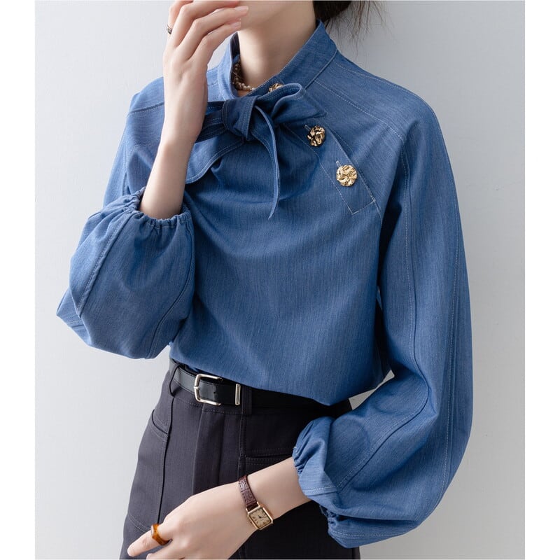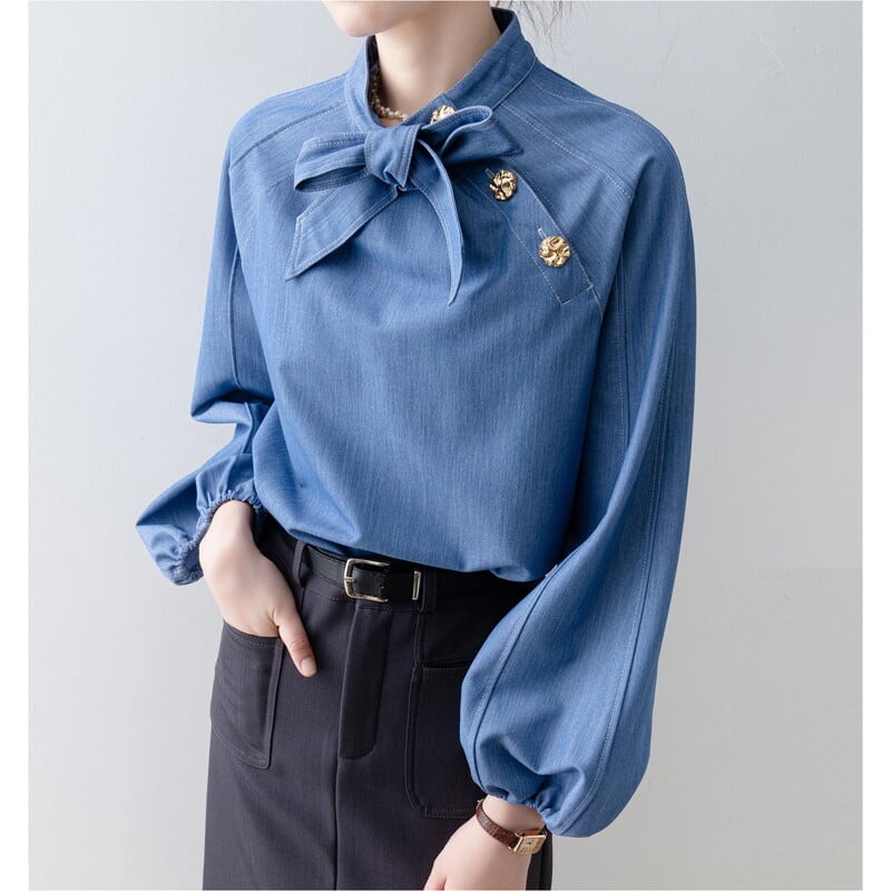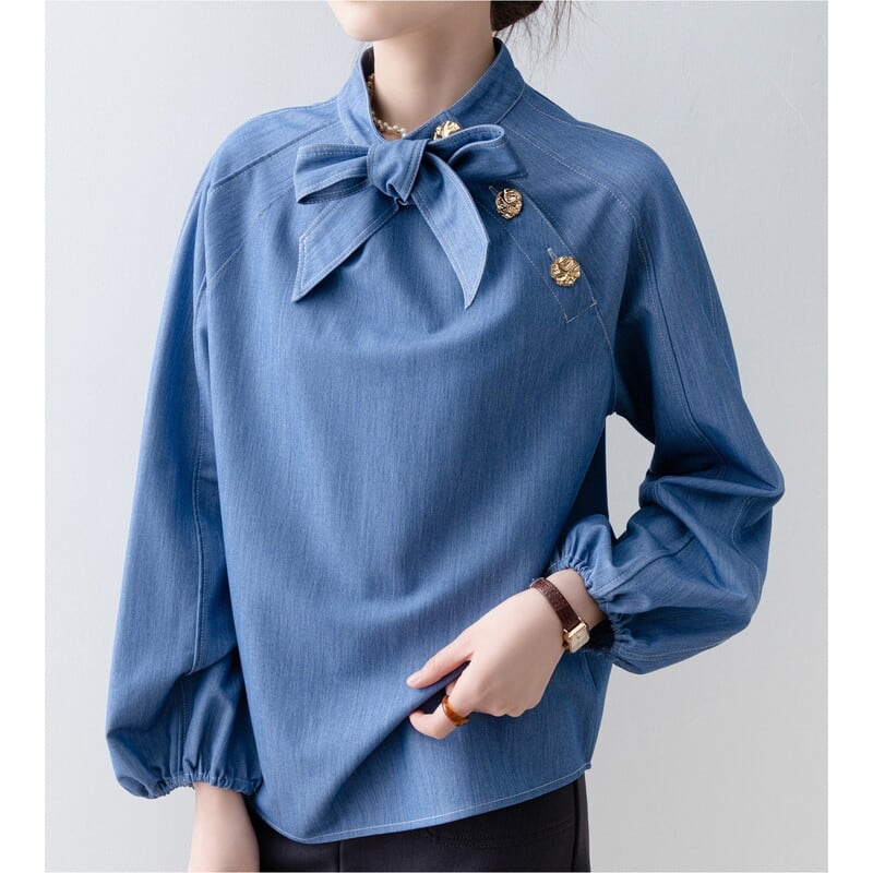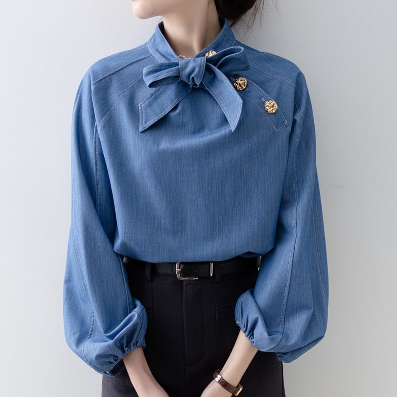 ボウタイデザインが上品な印象をプラスする長袖シャツです。