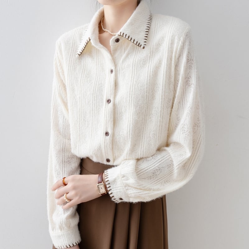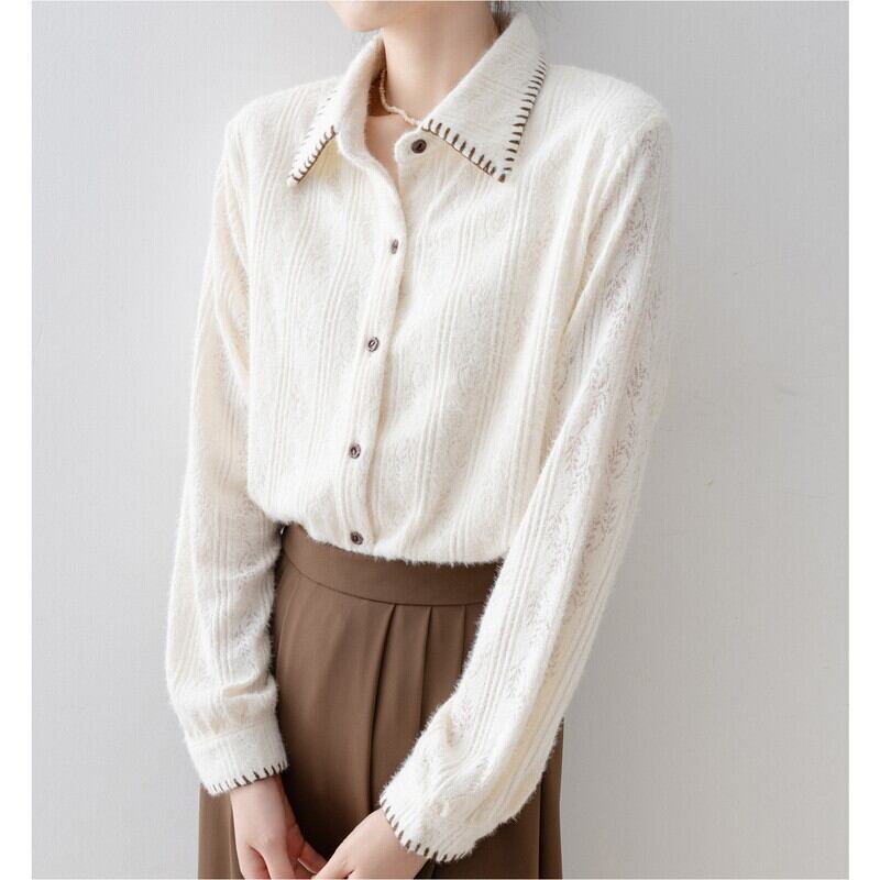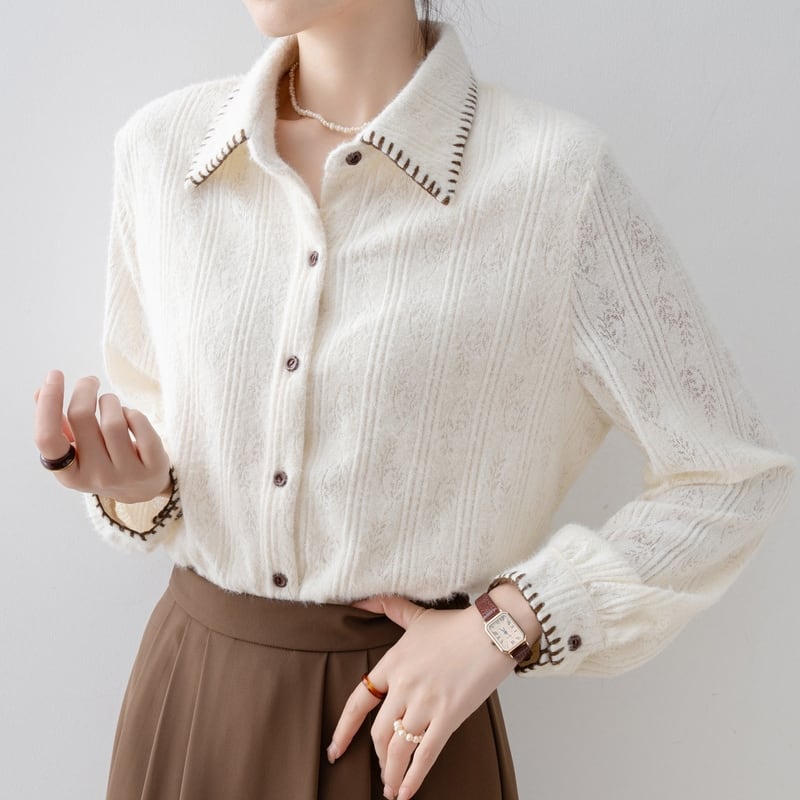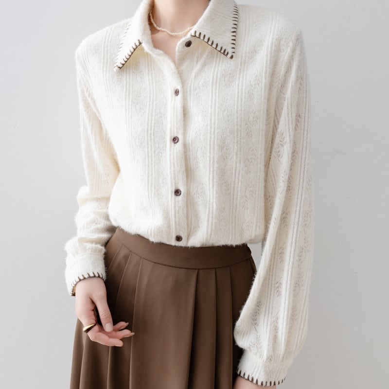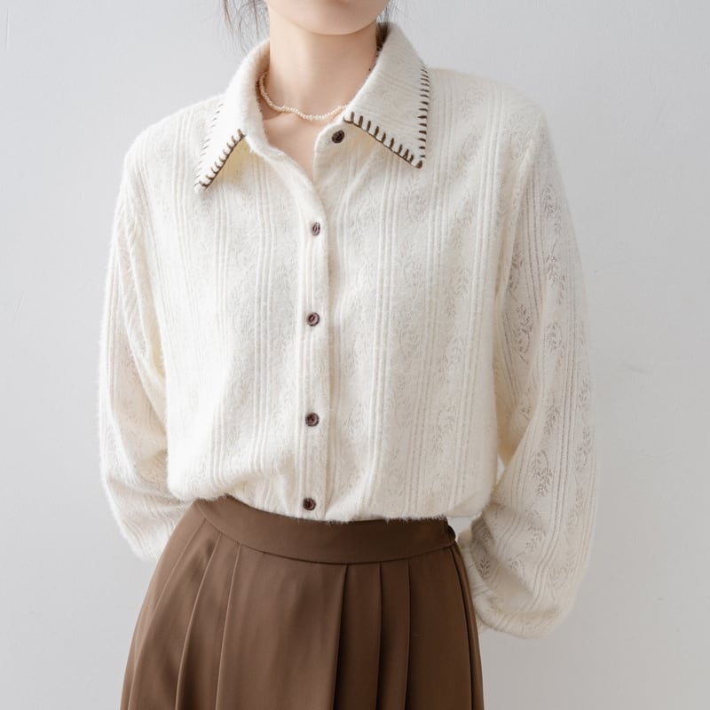 ステッチ入りの襟が特徴的な、起毛感のあるレースパターンの長袖シャツです。