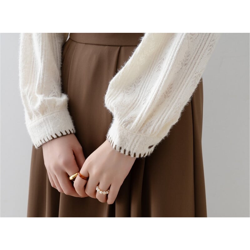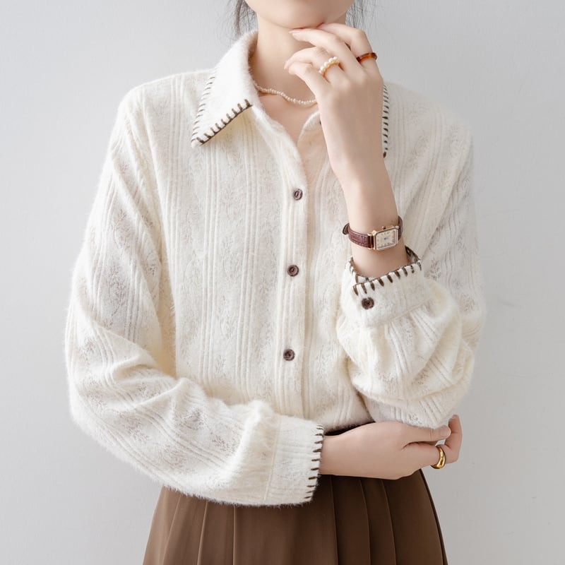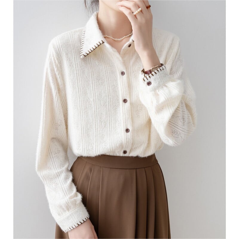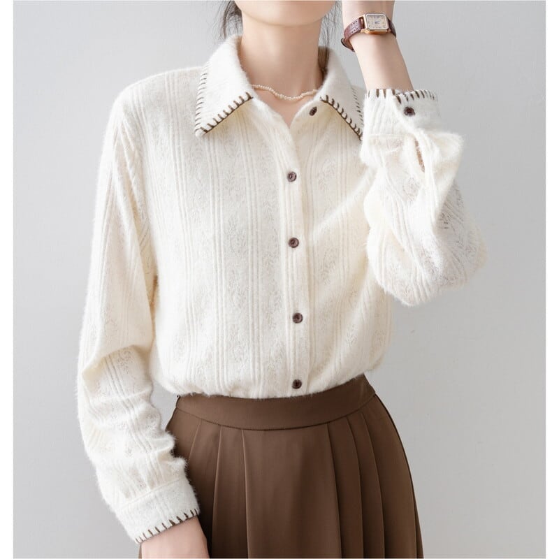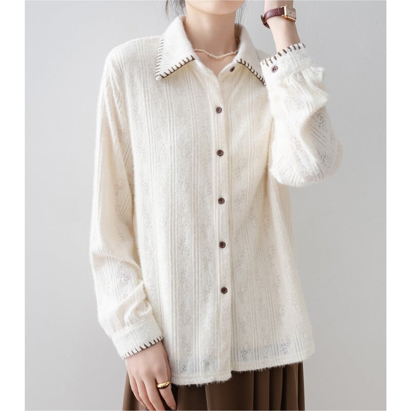 ステッチ入りの襟が特徴的な、起毛感のあるレースパターンの長袖シャツです。