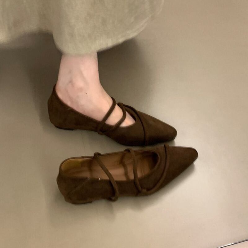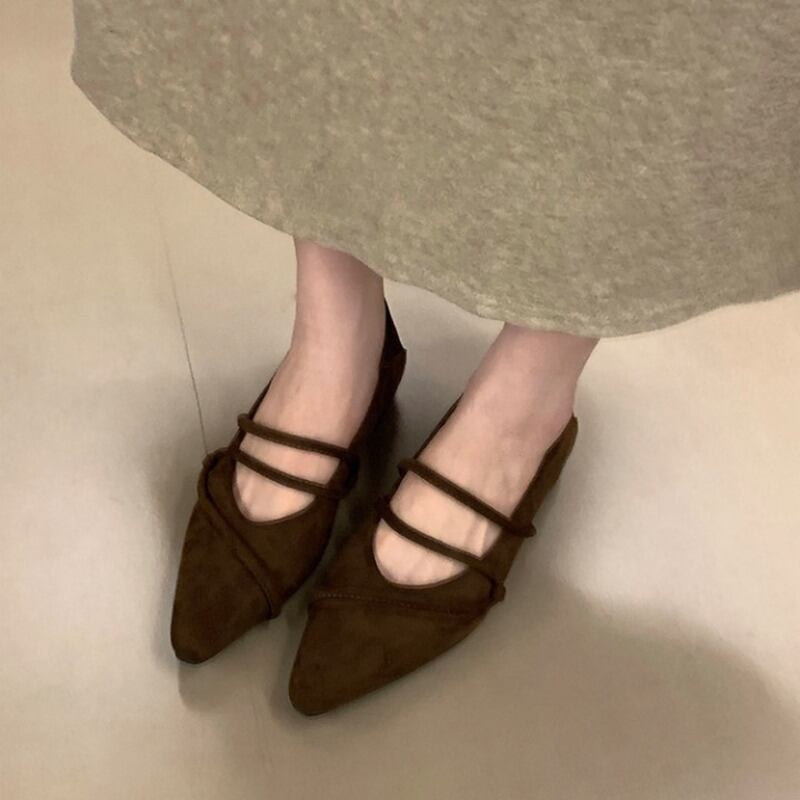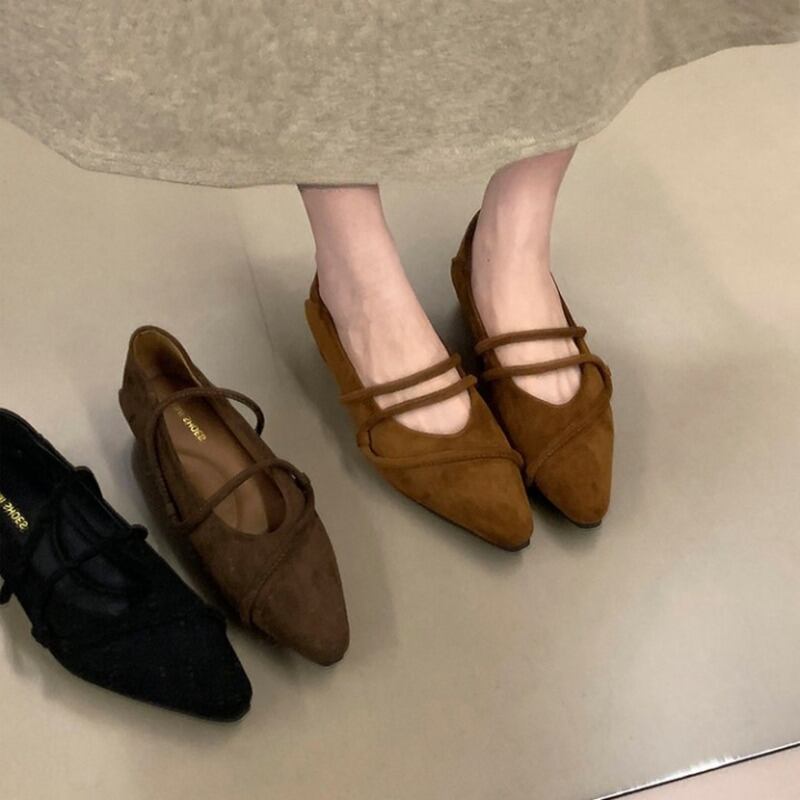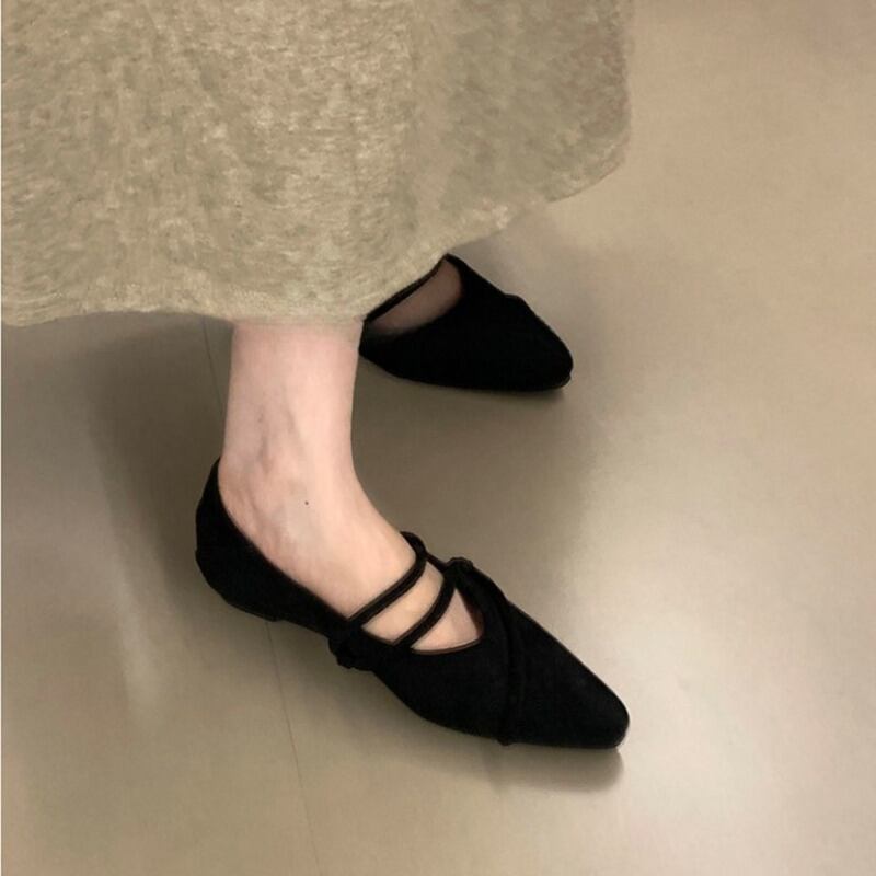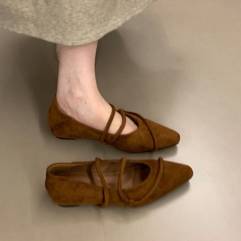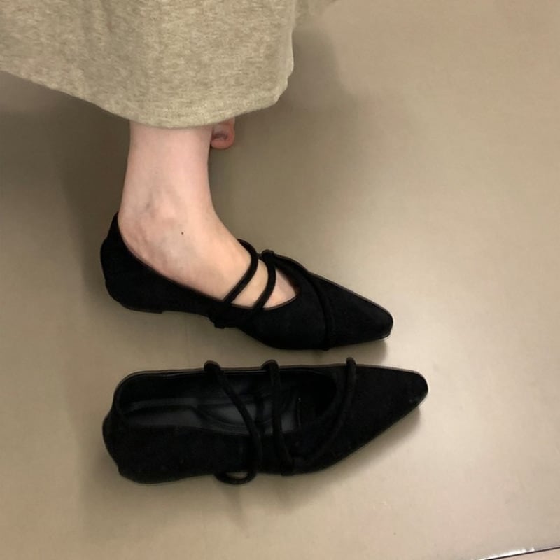ストラップデザインが目を惹くフェイクスエード仕立てのフラットパンプスです。