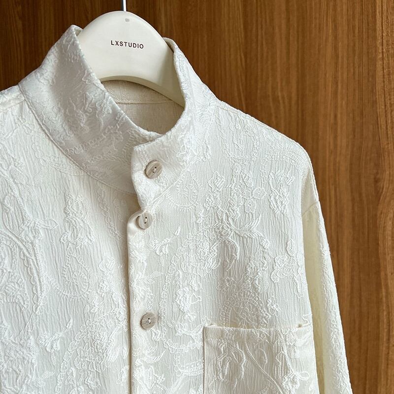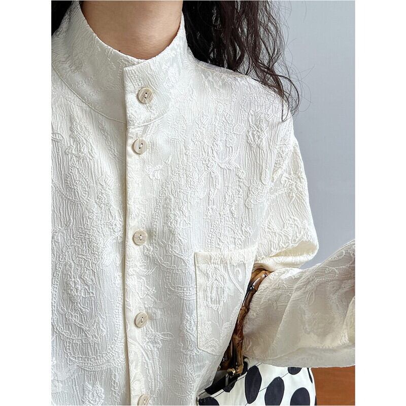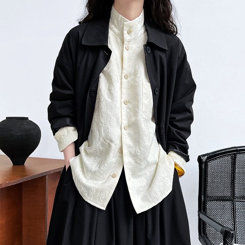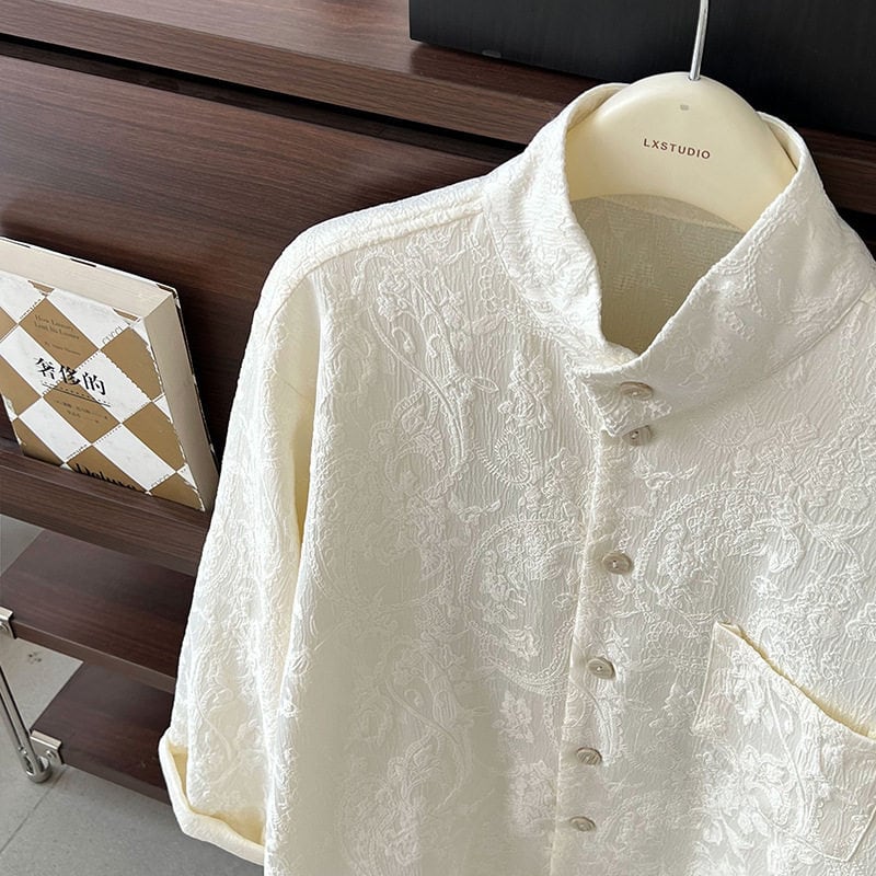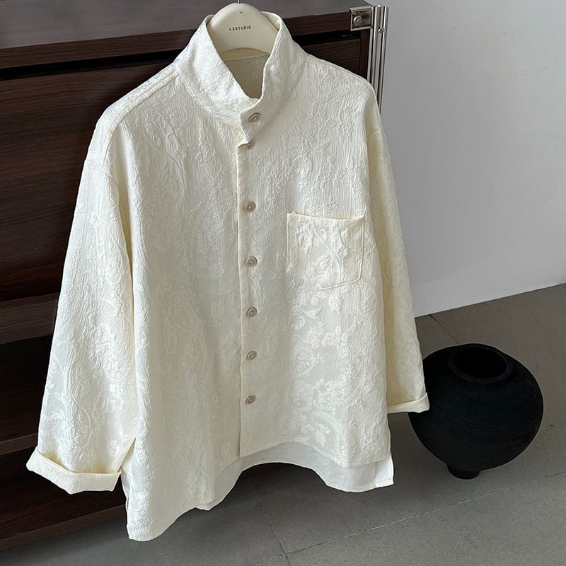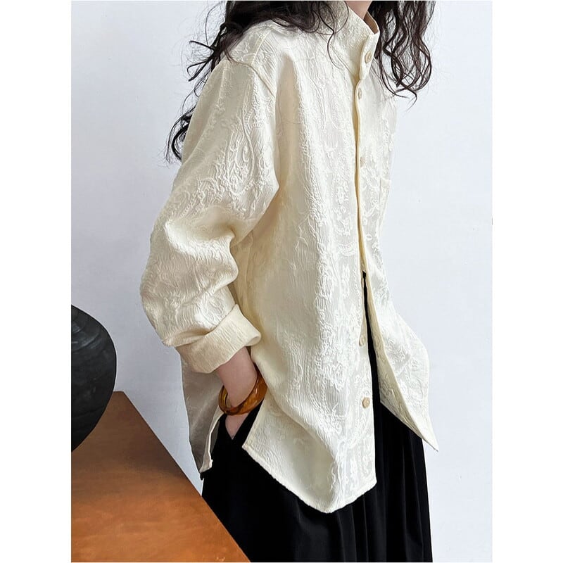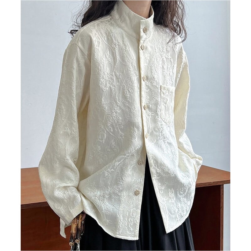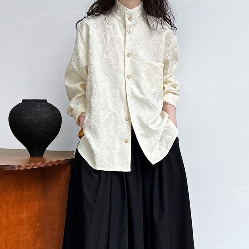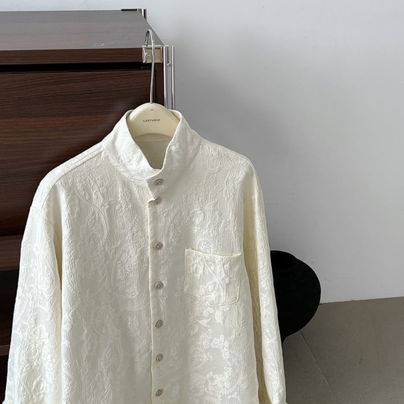 スタンドカラーが首元をすっきりと見せてくれる長袖シャツです。