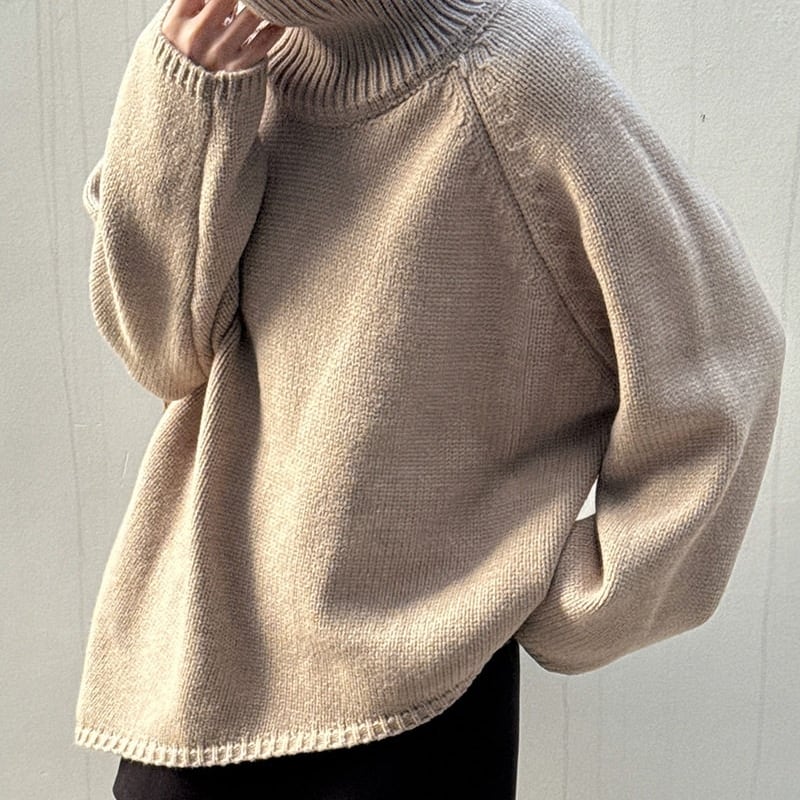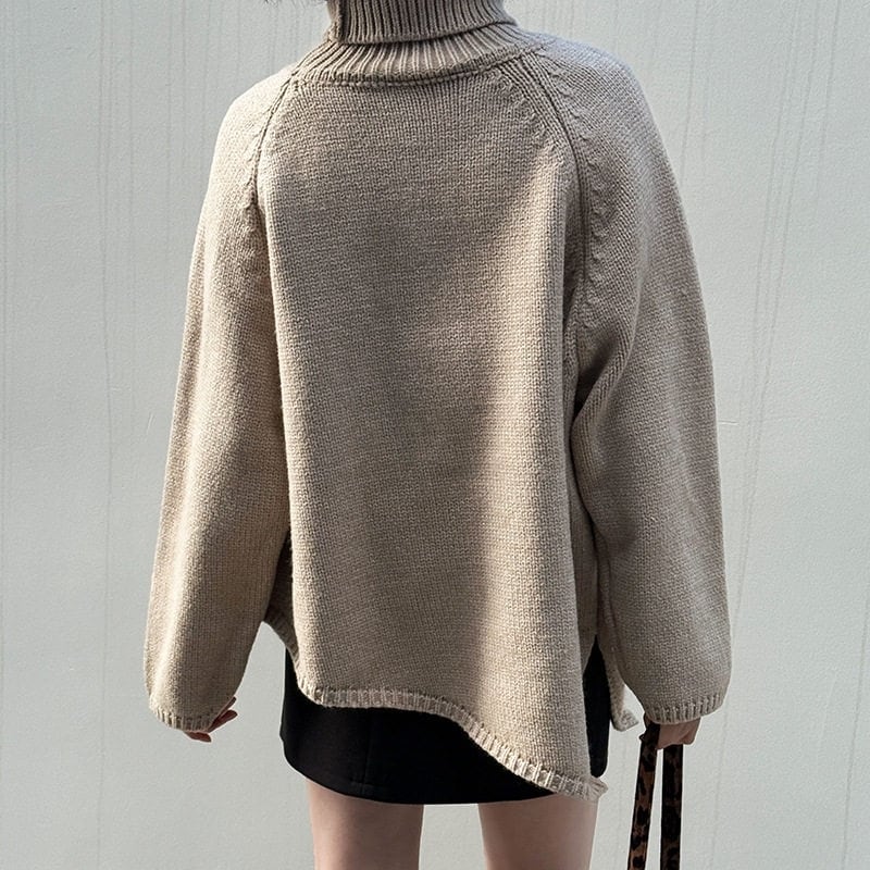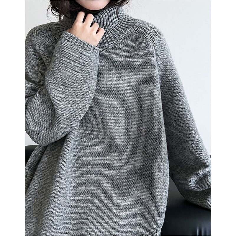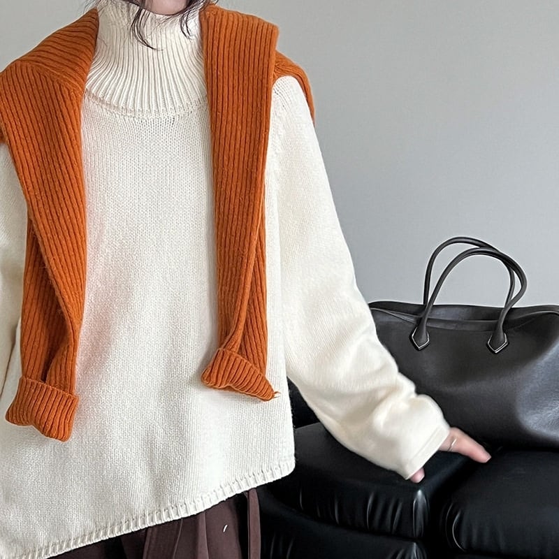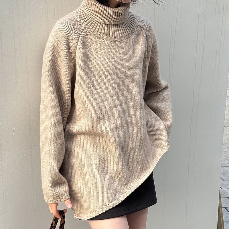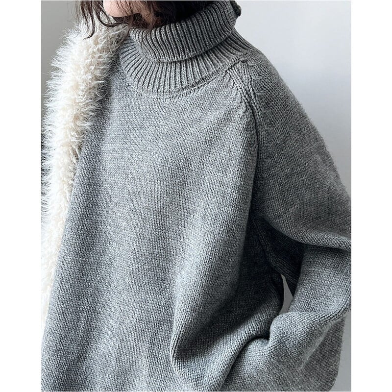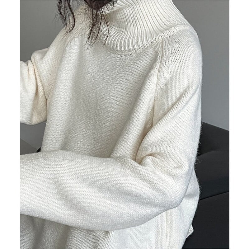 リブ編みのハイネックが首元を優しく包み込む、暖かみのあるニットトップスです。