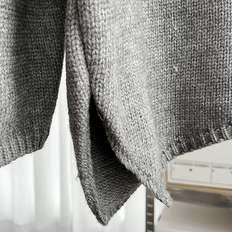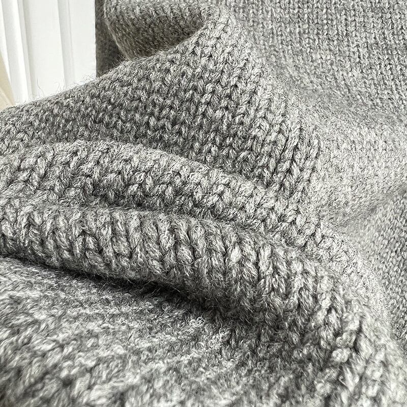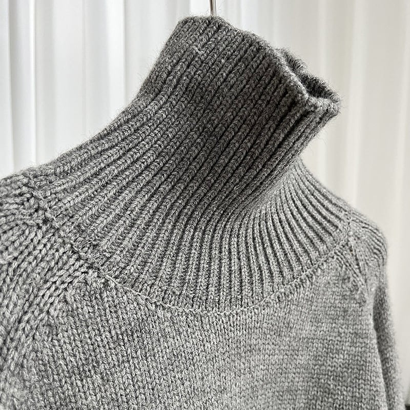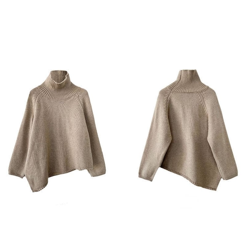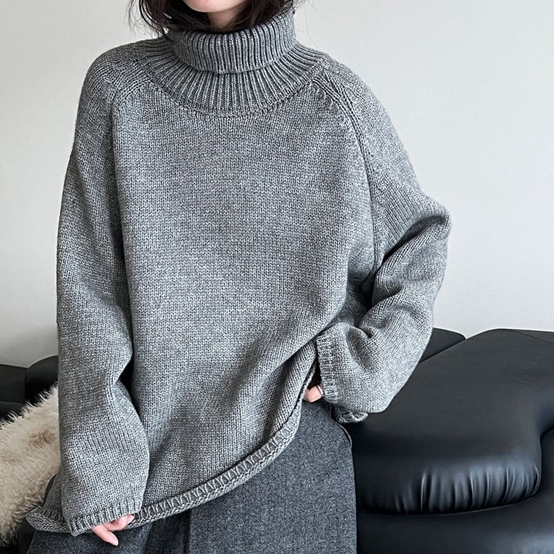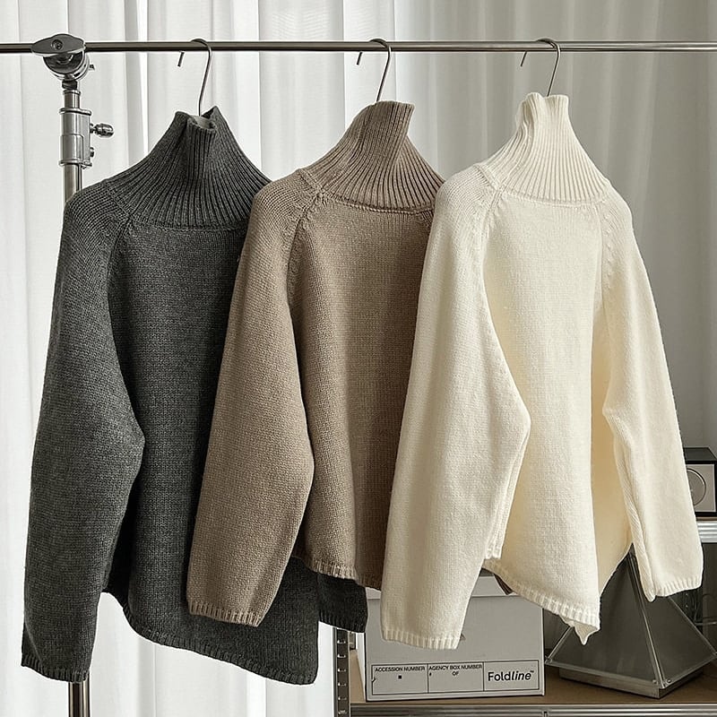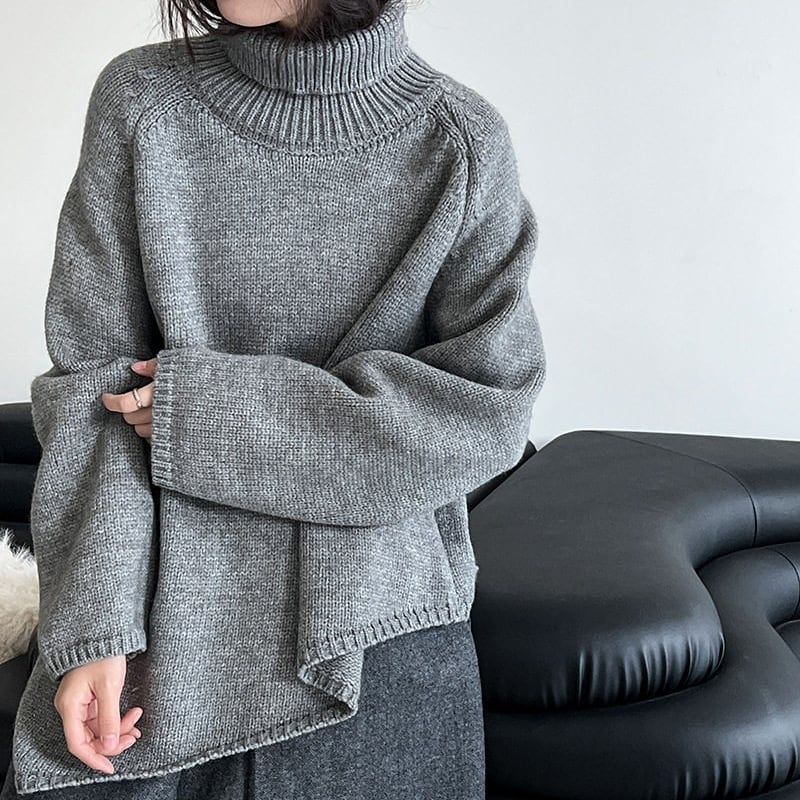 リブ編みのハイネックが首元を優しく包み込む、暖かみのあるニットトップスです。
