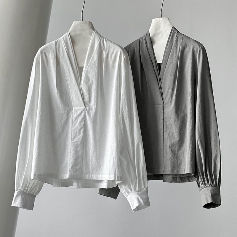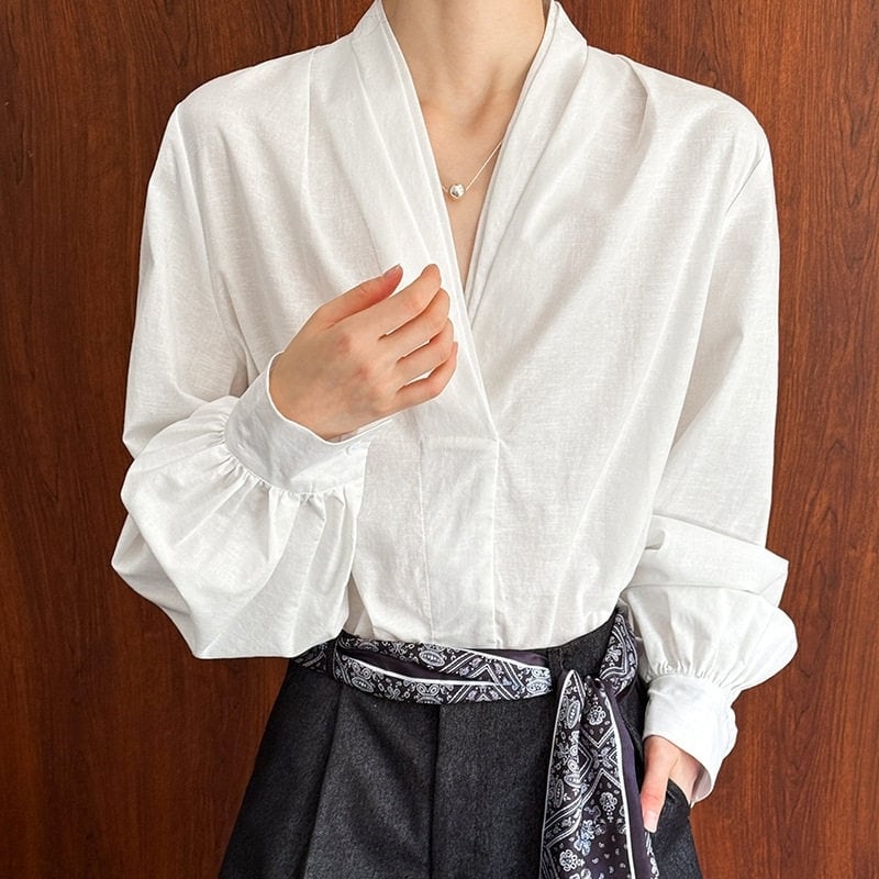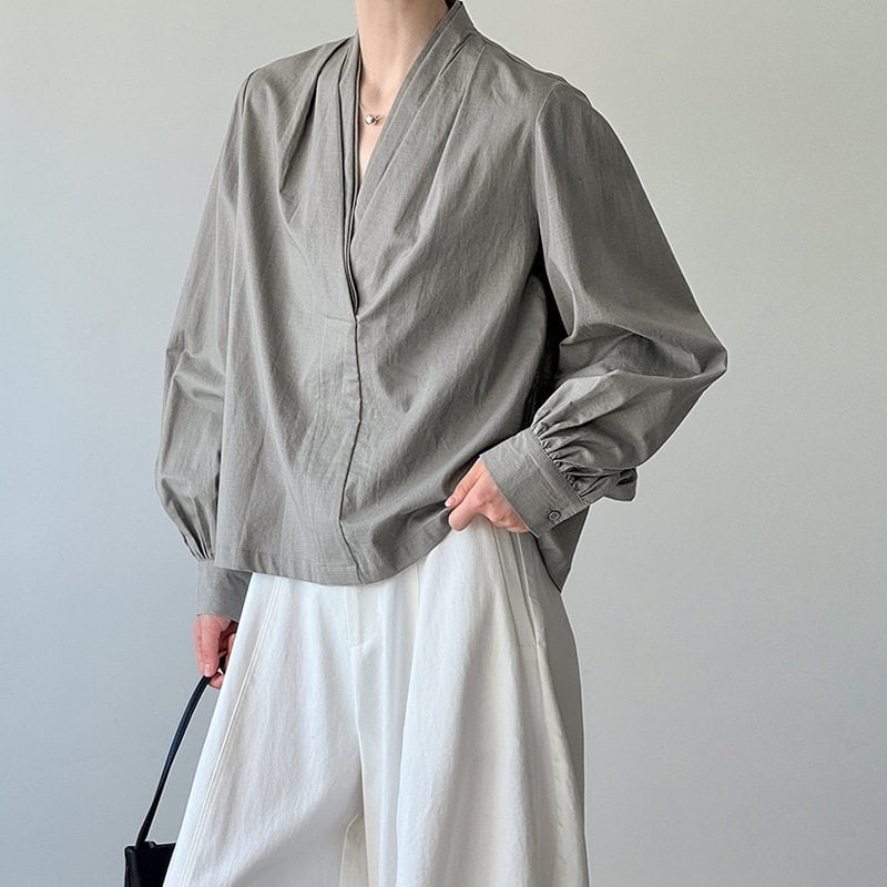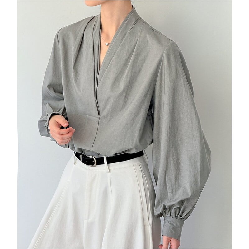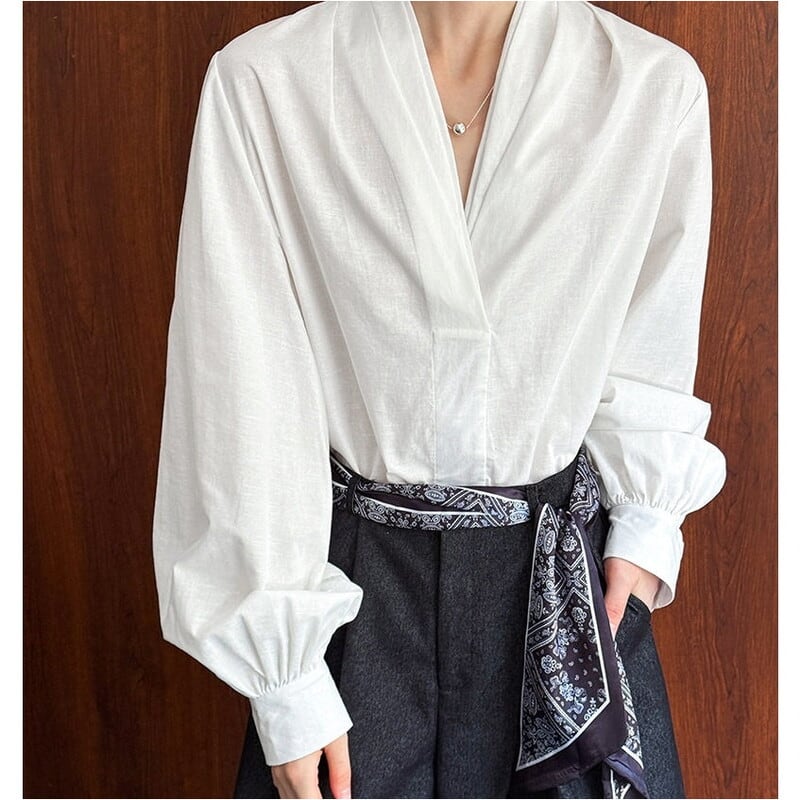 カシュクールで深めのVネックが、顔周りをすっきりと見せてくれる長袖シャツです。