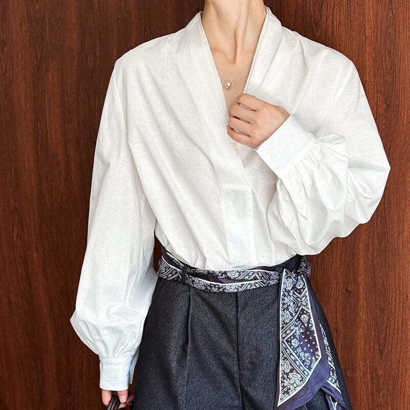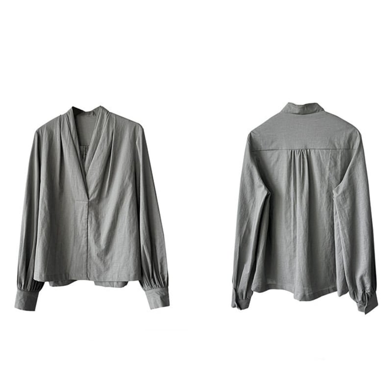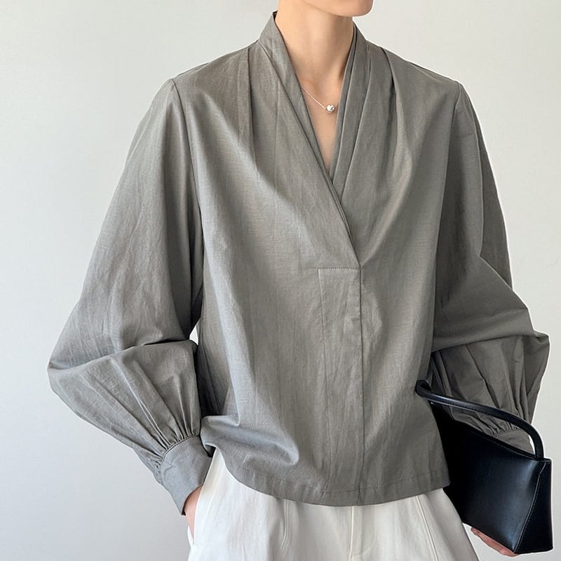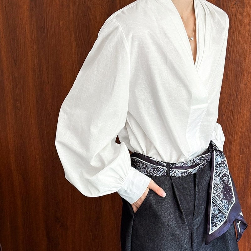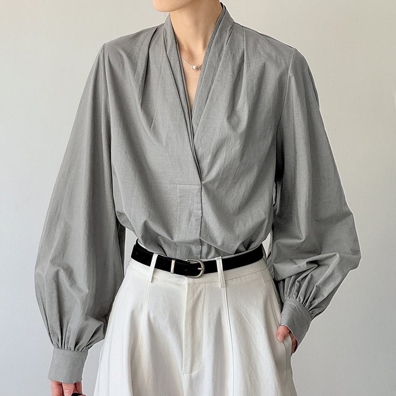 カシュクールで深めのVネックが、顔周りをすっきりと見せてくれる長袖シャツです。