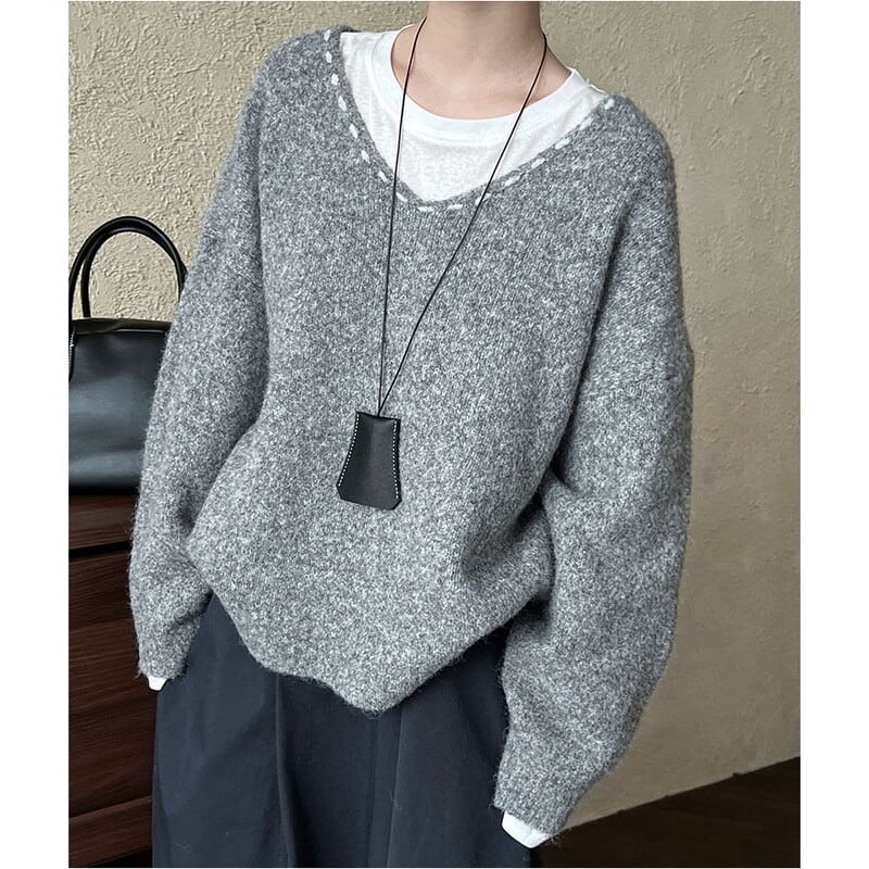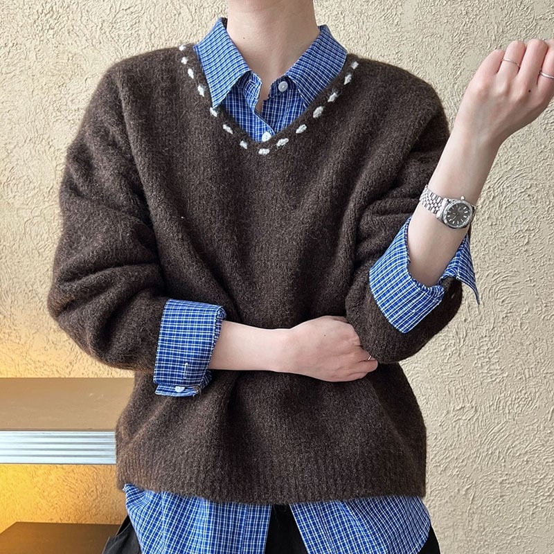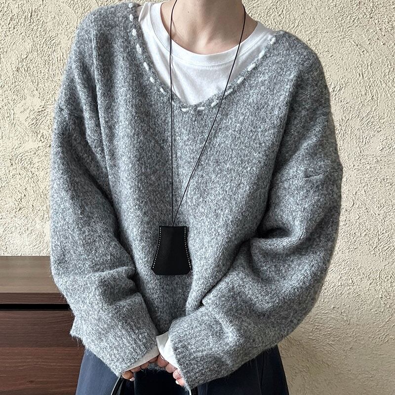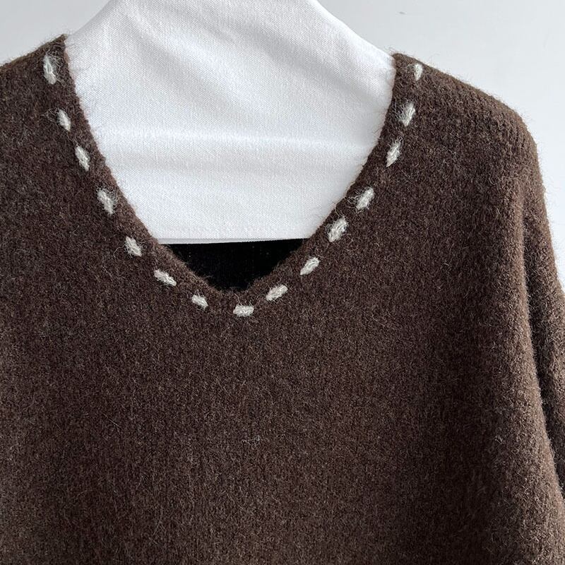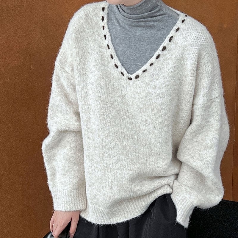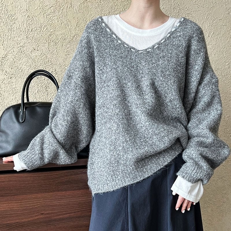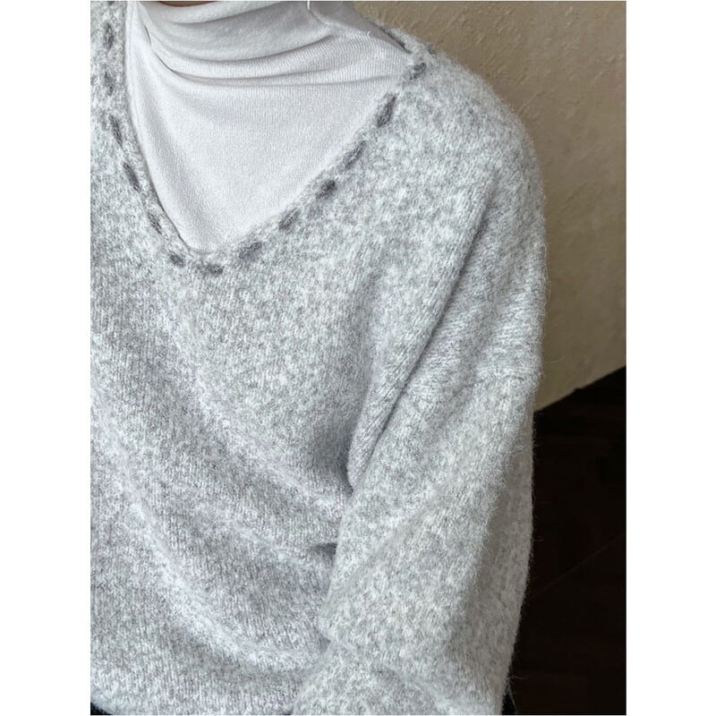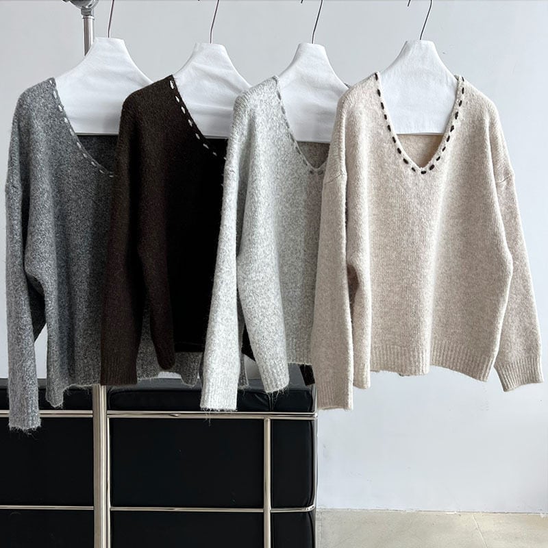 Vネックとステッチデザインが、顔周りをすっきりと見せてくれるニットトップスです。