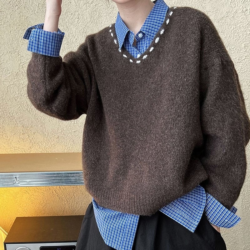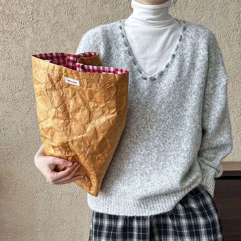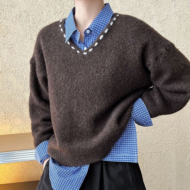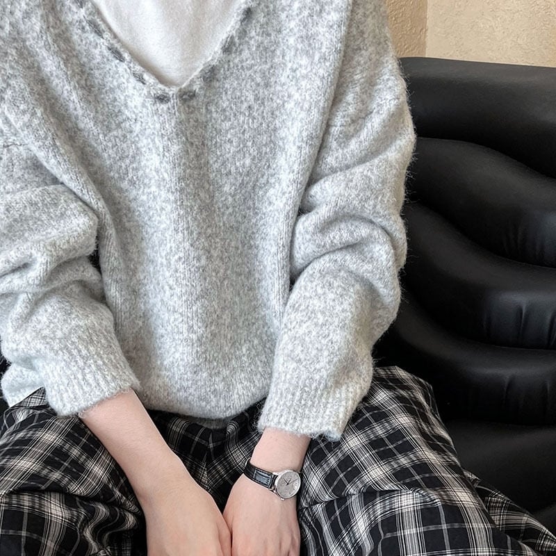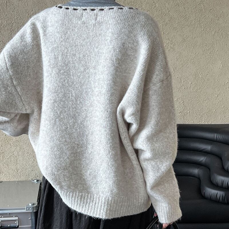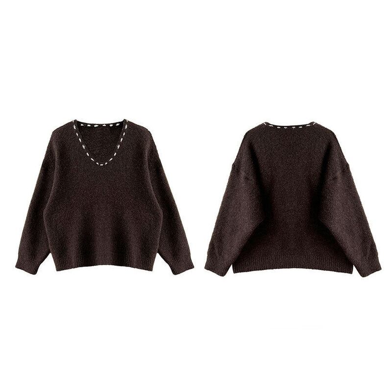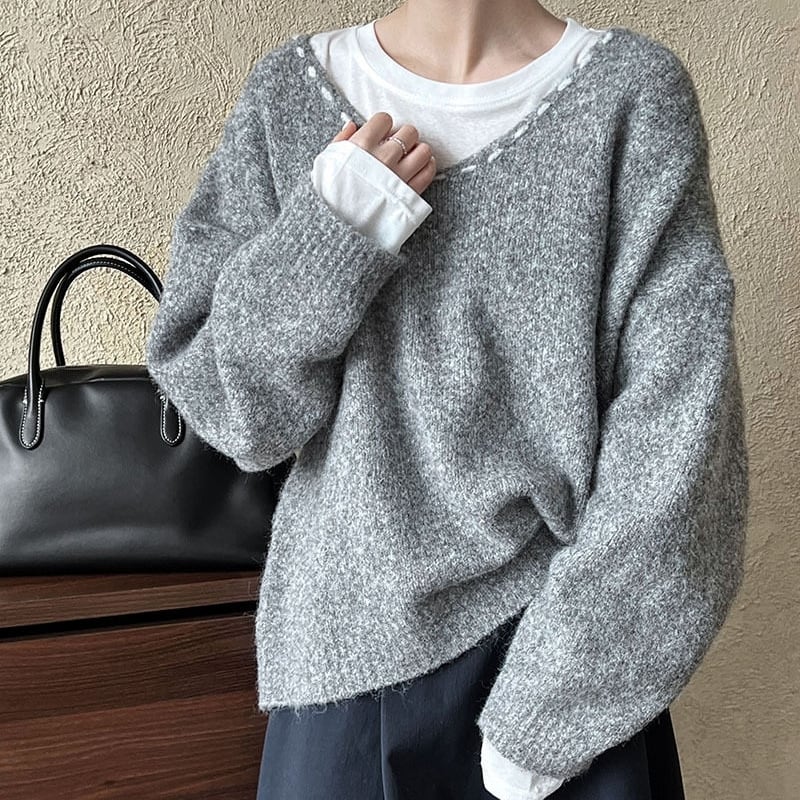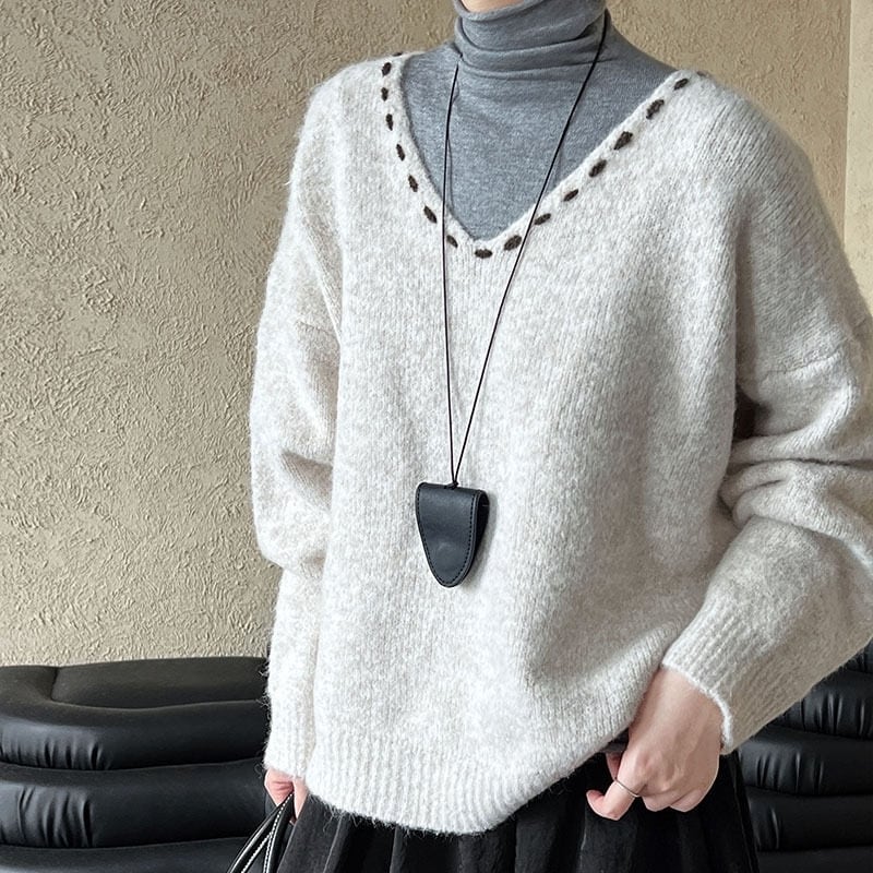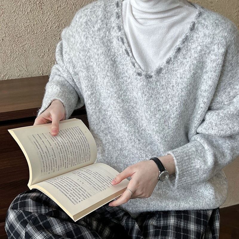 Vネックとステッチデザインが、顔周りをすっきりと見せてくれるニットトップスです。