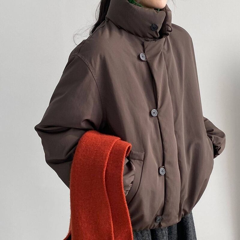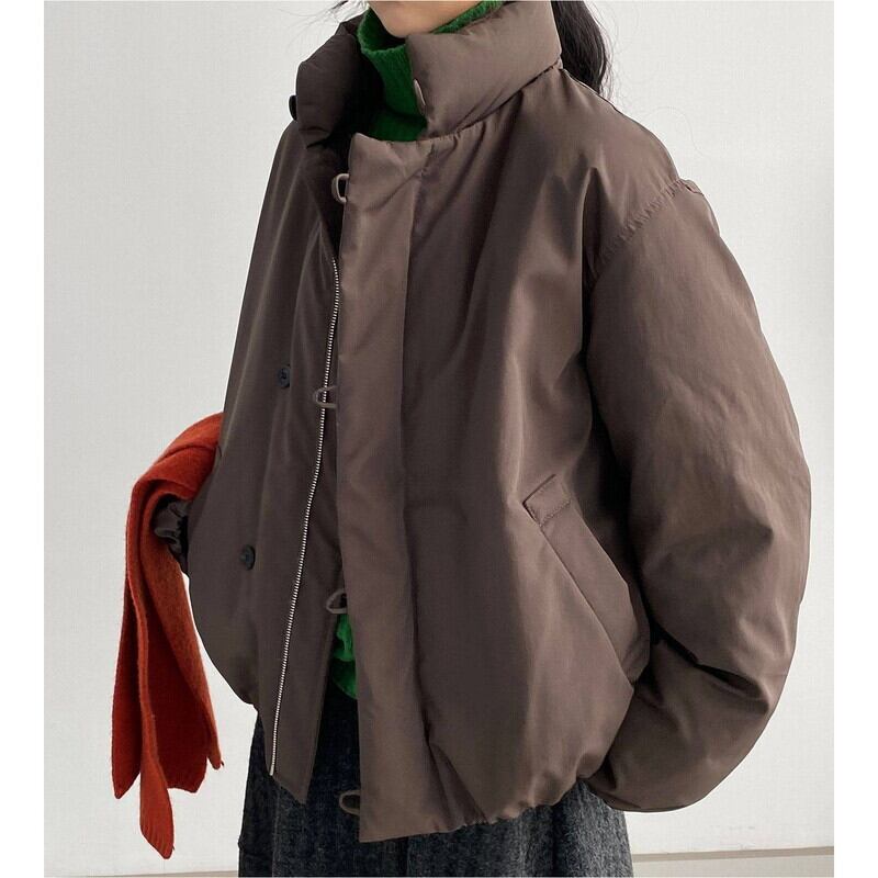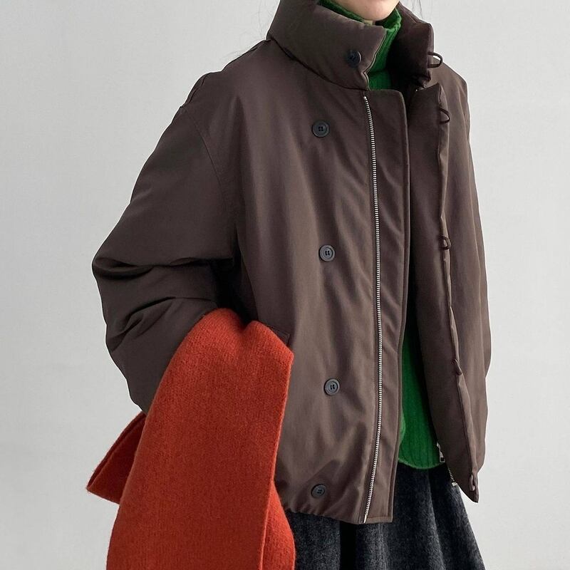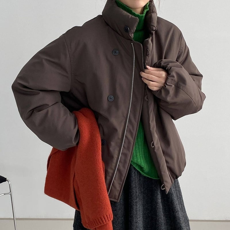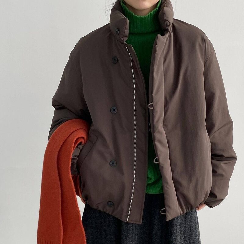 ジップとボタンのダブル開閉デザインのショート丈ダウンジャケットです。