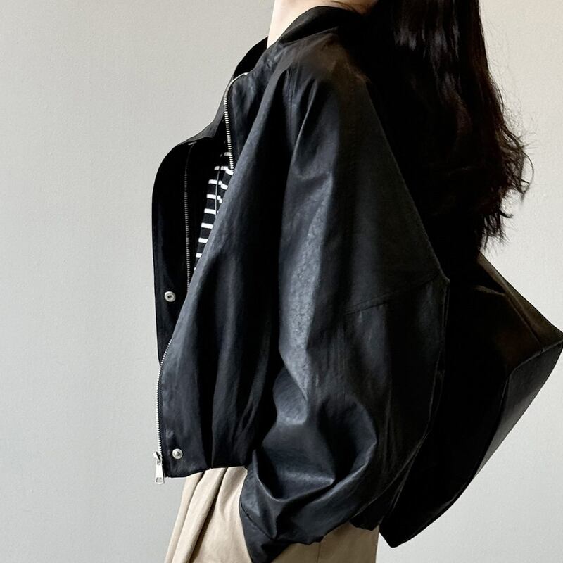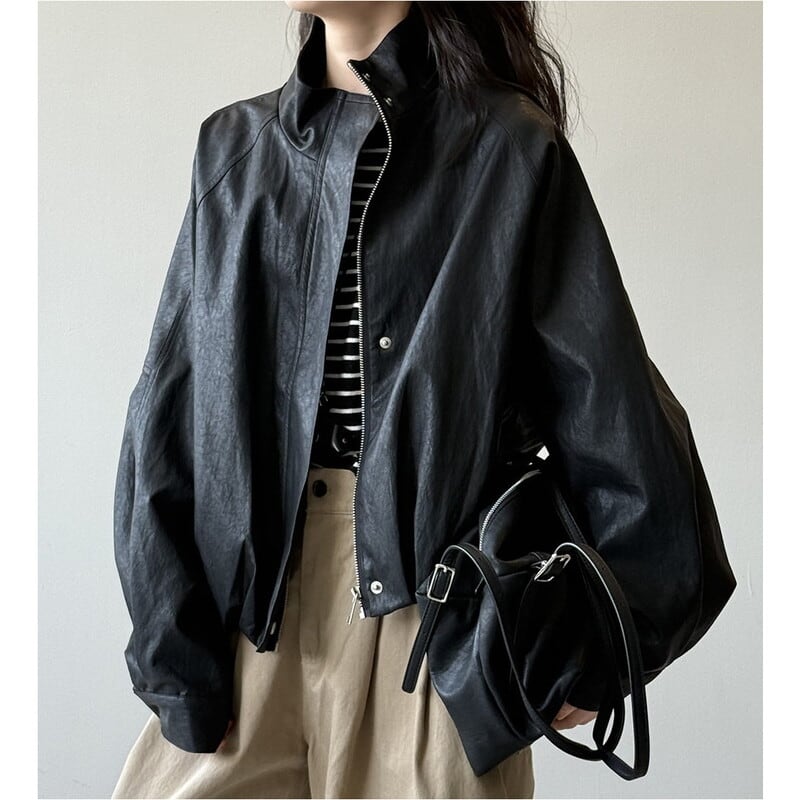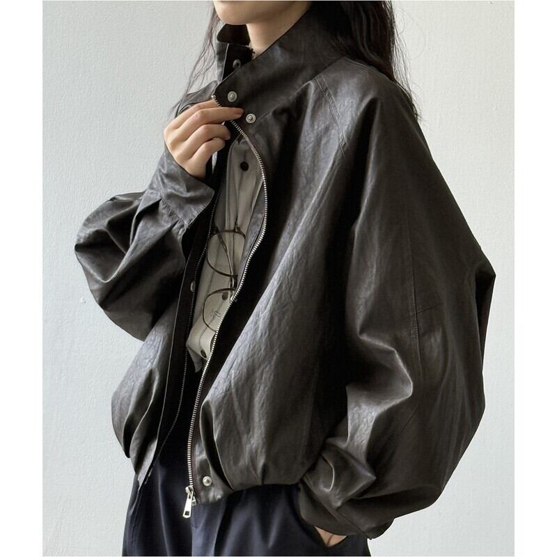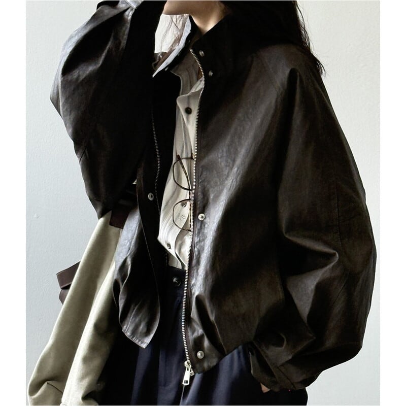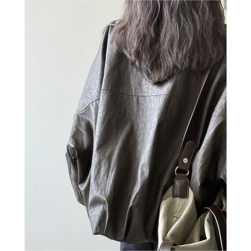 トレンド感溢れるオーバーサイズのフェイクレザージャケットです。