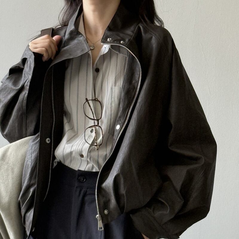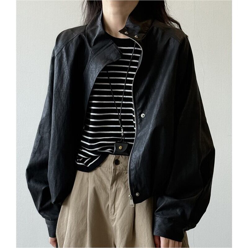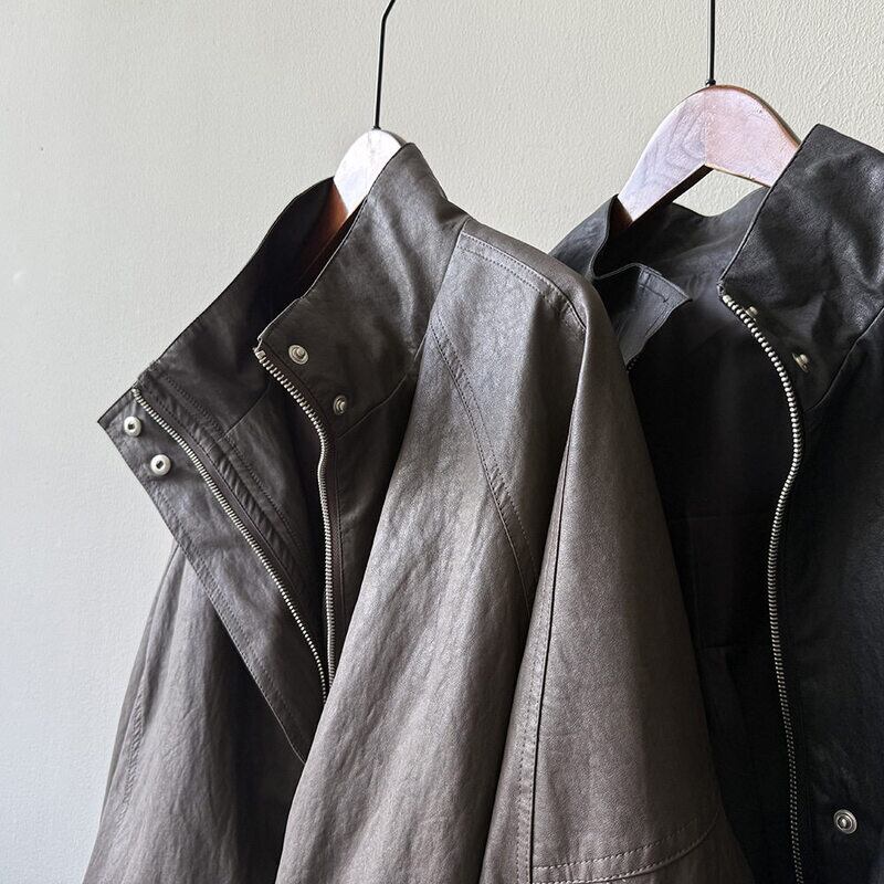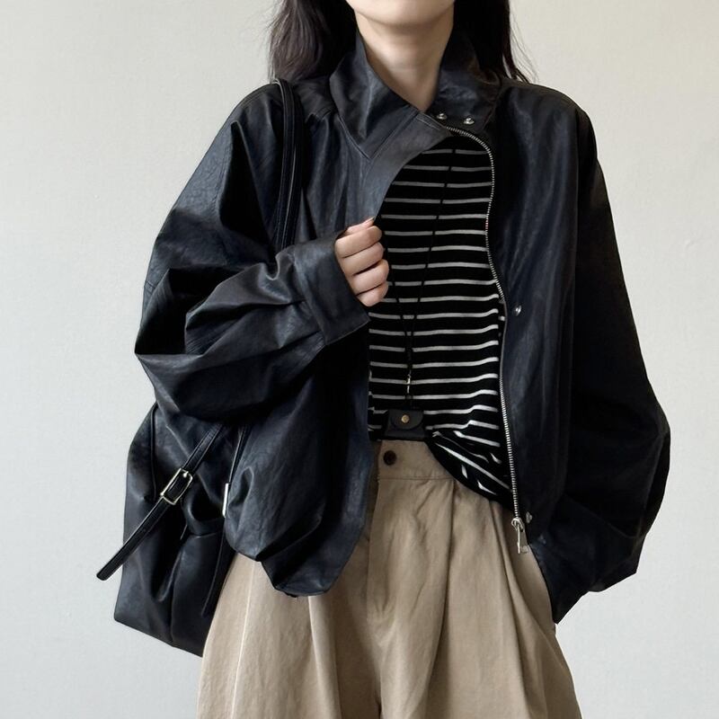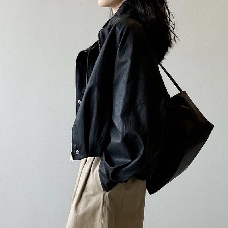 トレンド感溢れるオーバーサイズのフェイクレザージャケットです。