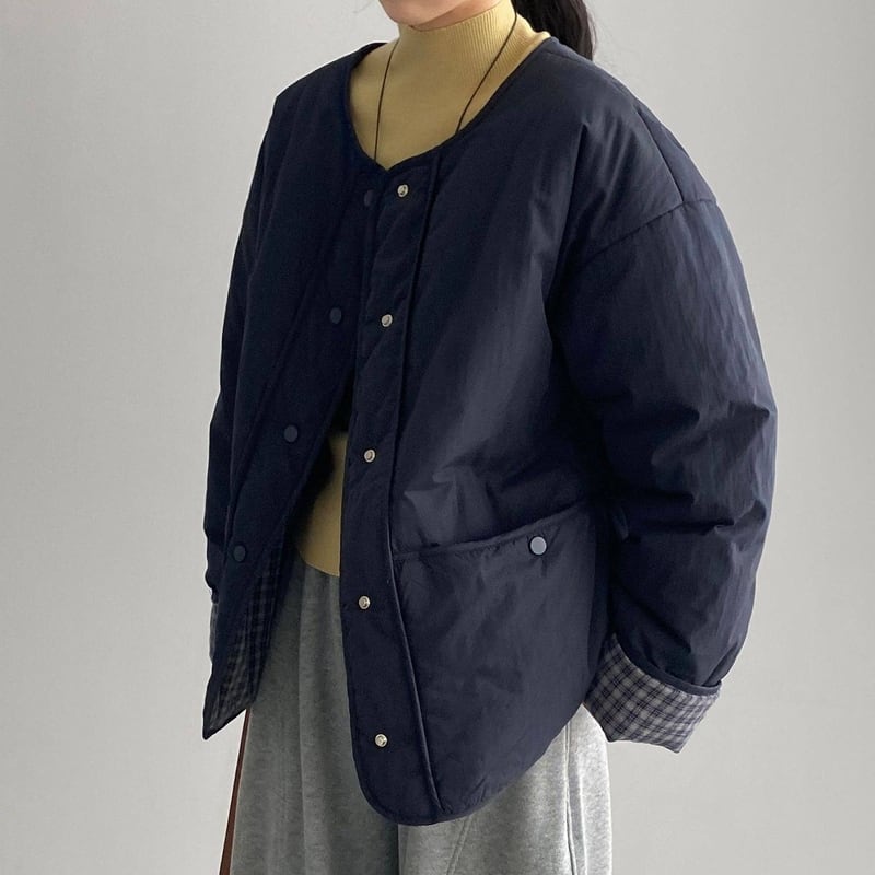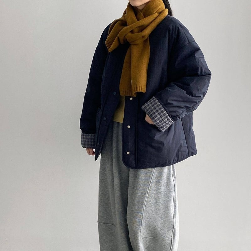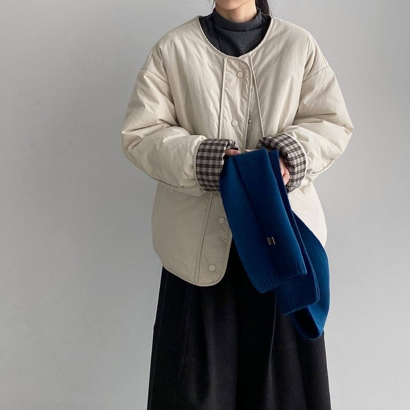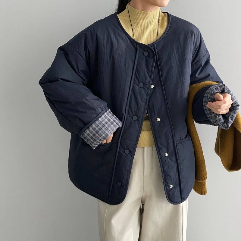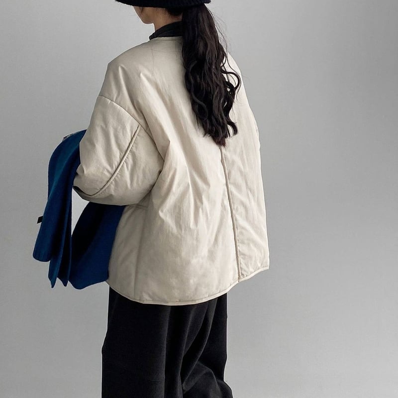 カジュアルにもきれいめにも着こなせるノーカラージャケットです。