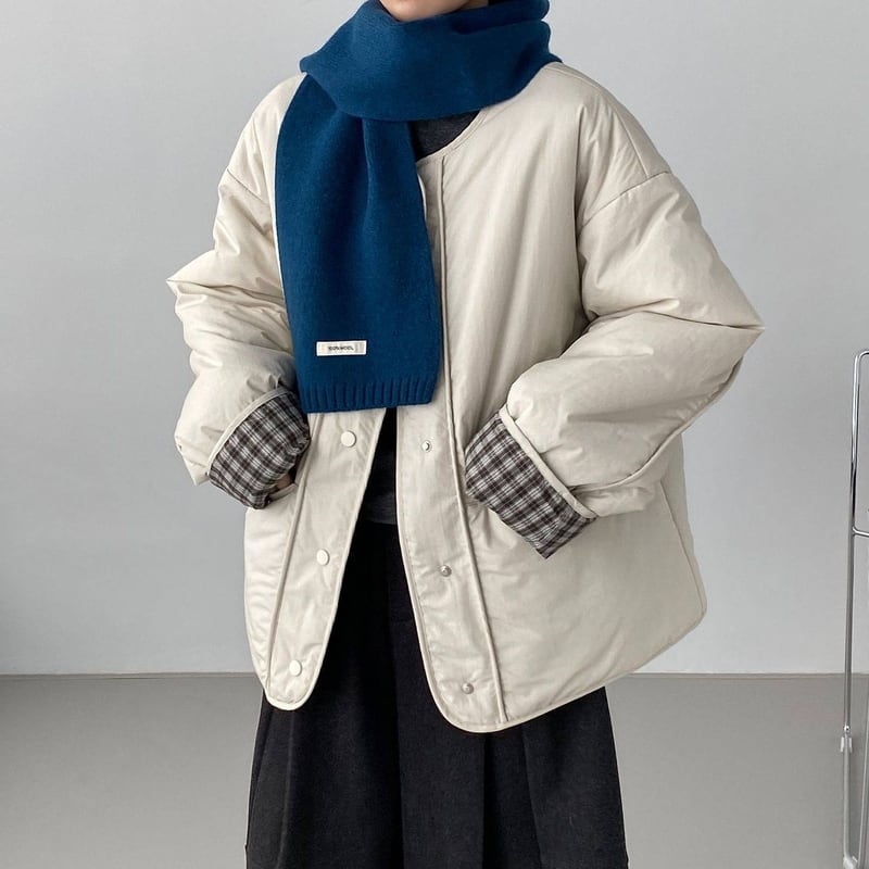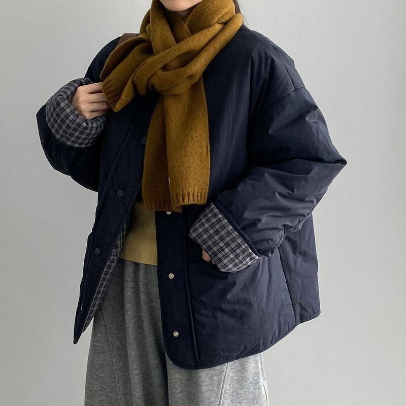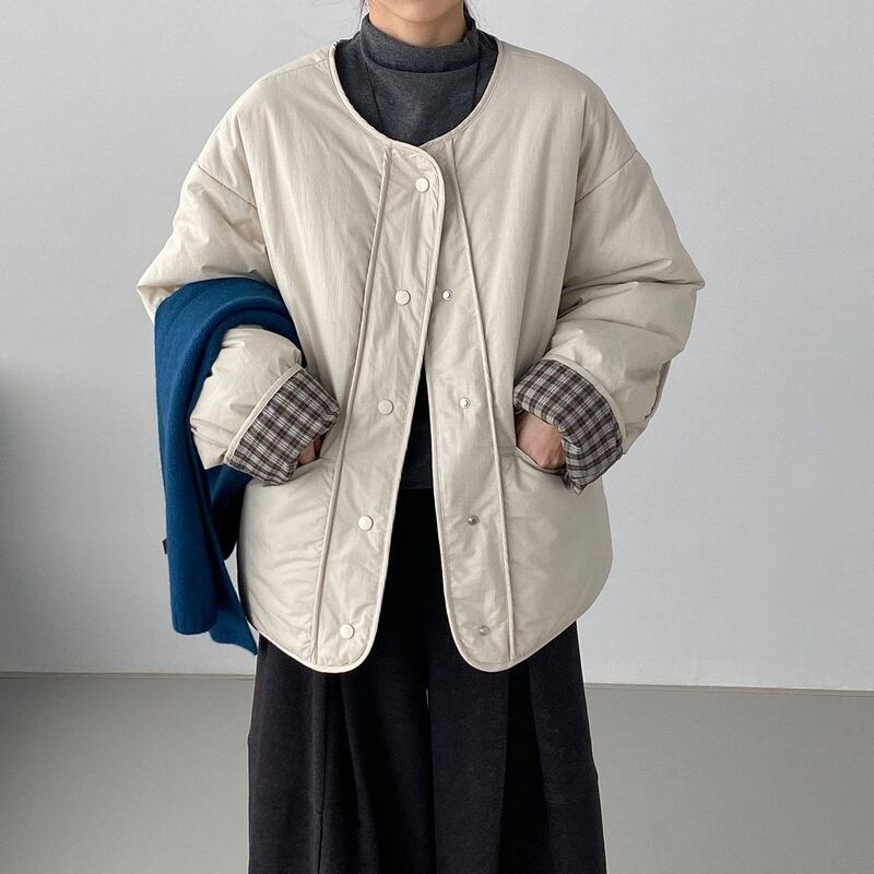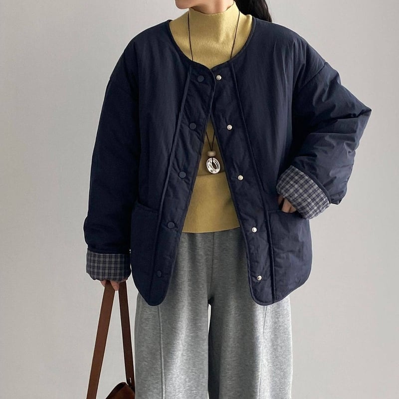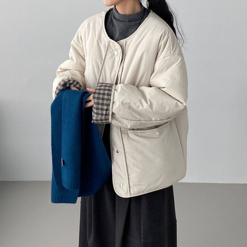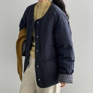 カジュアルにもきれいめにも着こなせるノーカラージャケットです。