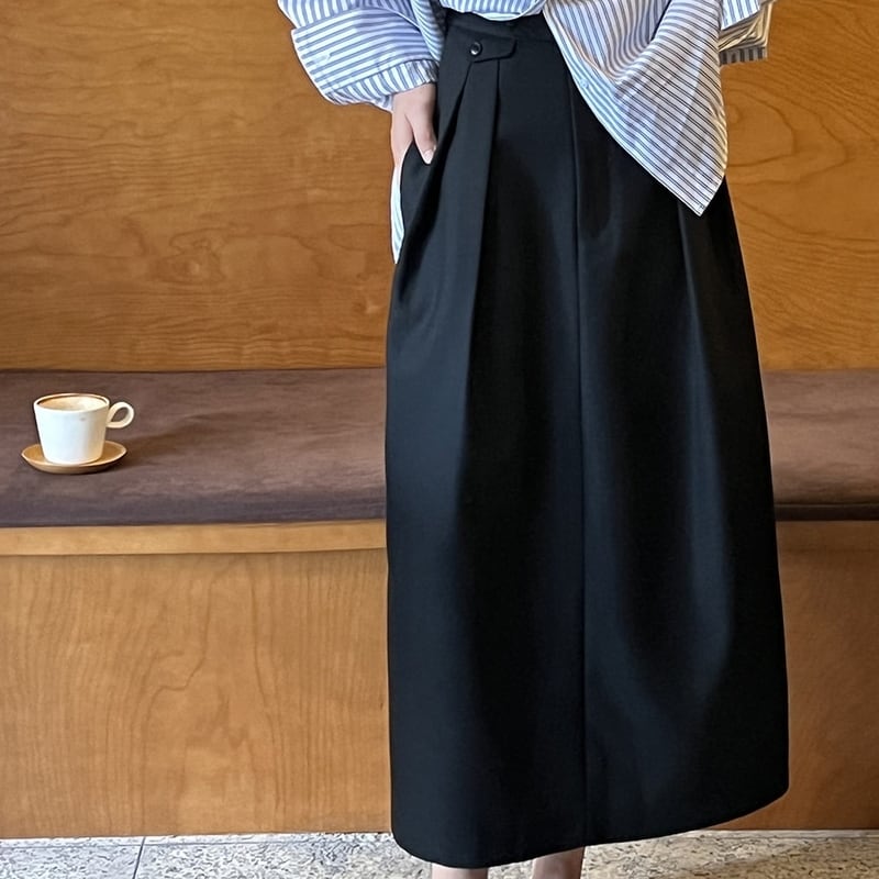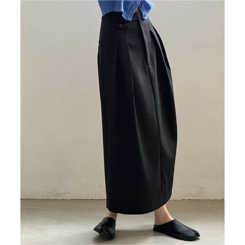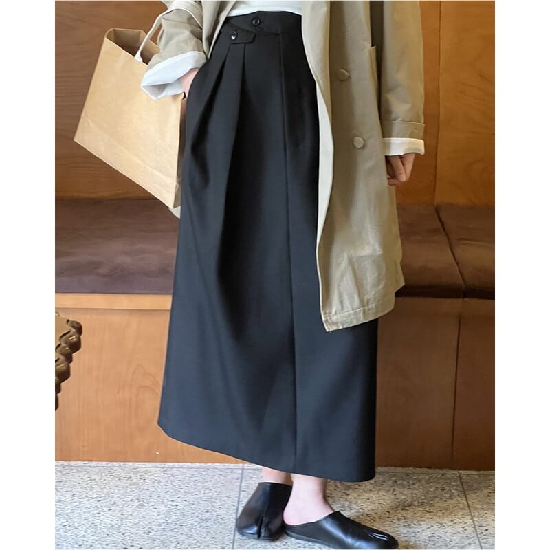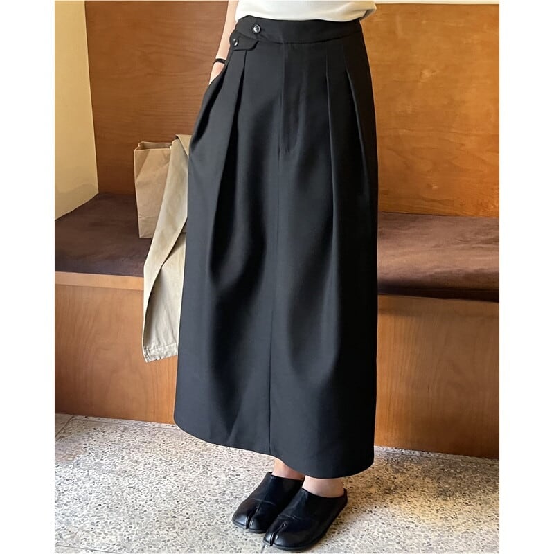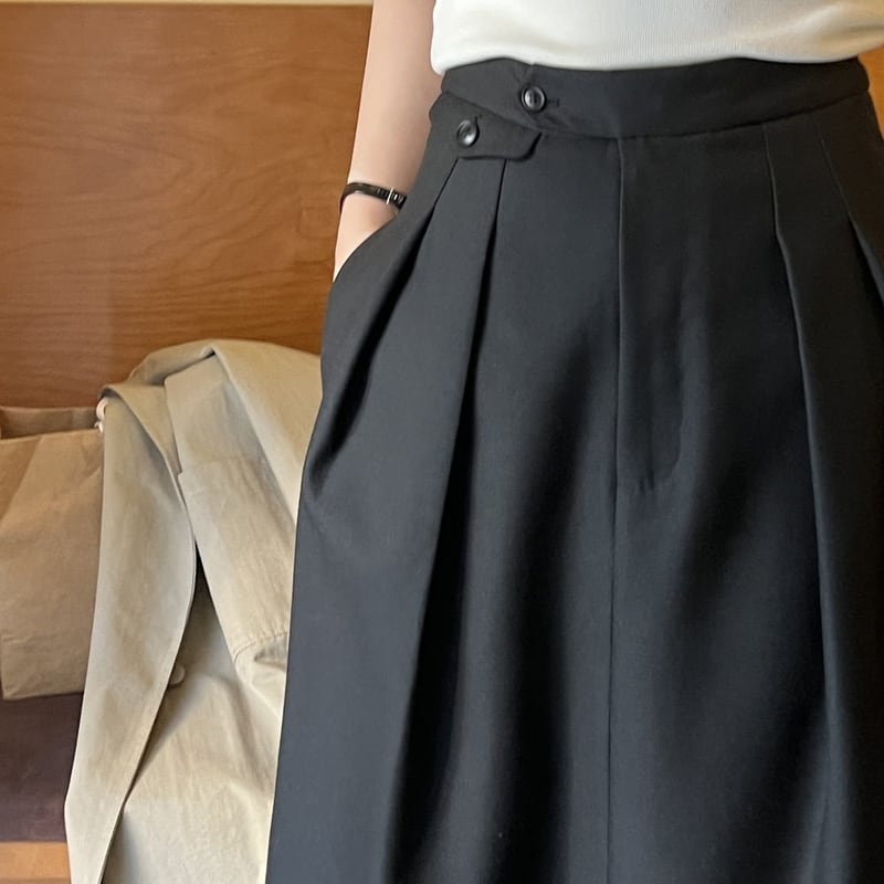 ボタン付きの装飾がアクセントになったミモレ丈のペンシルスカートです。