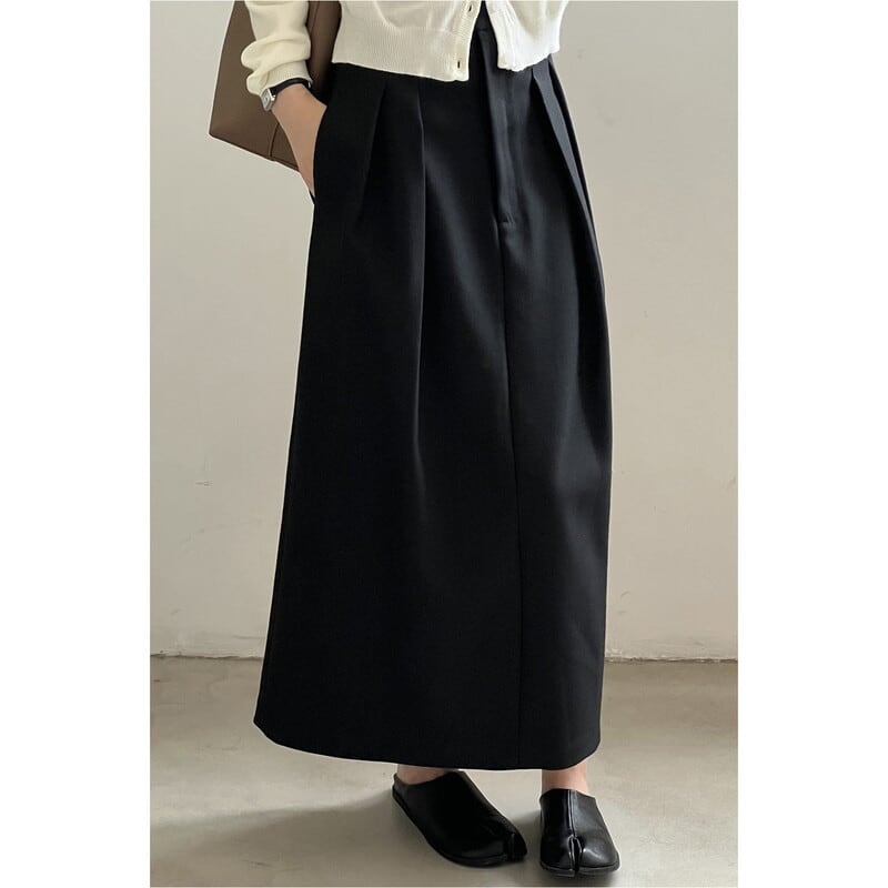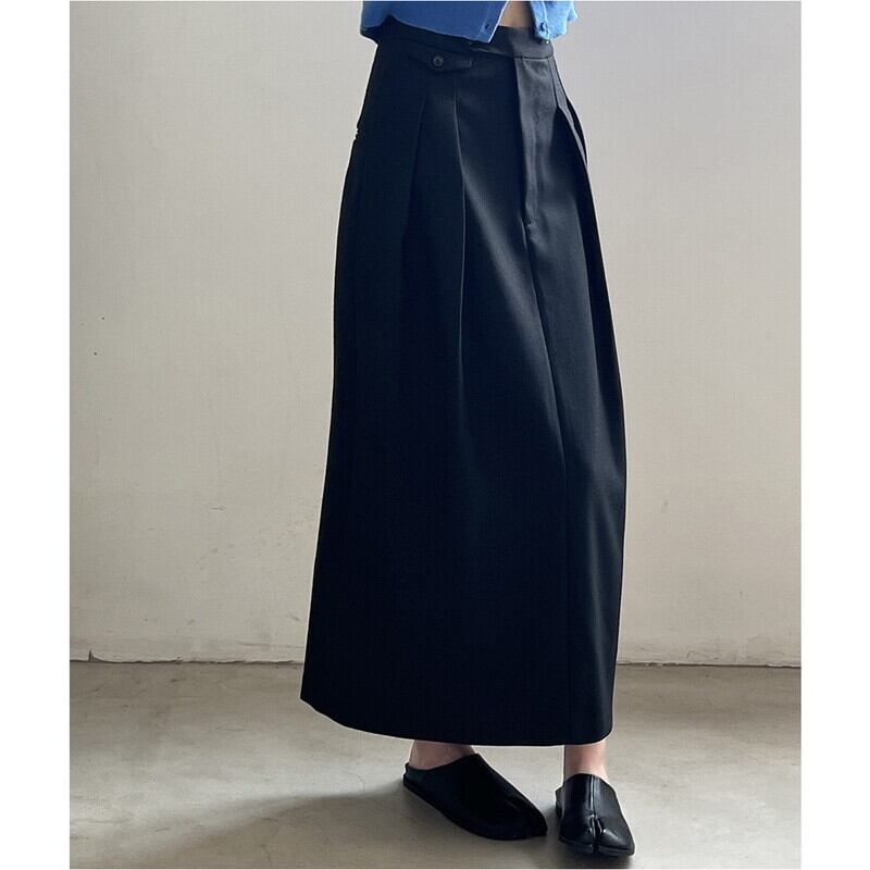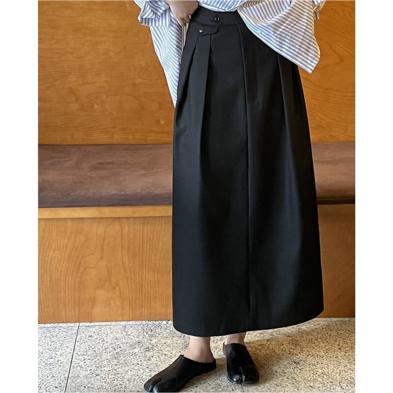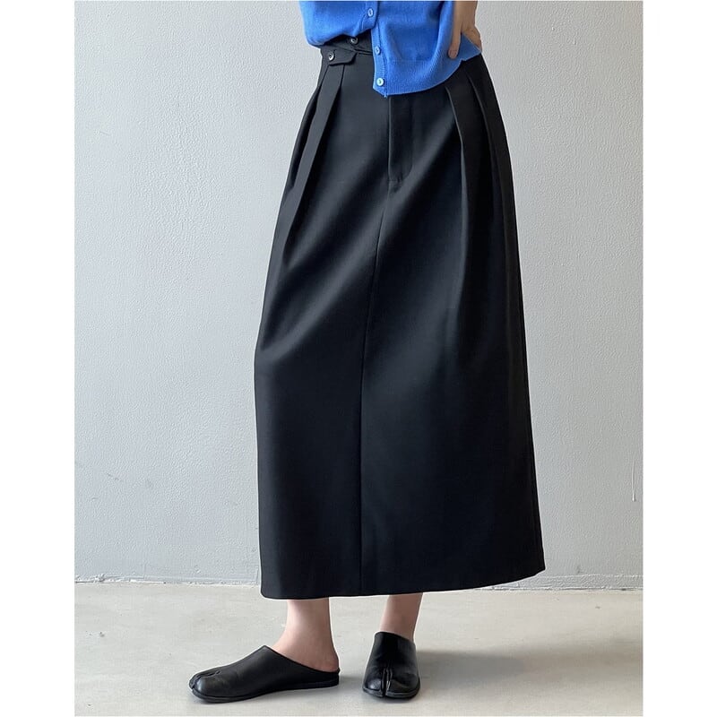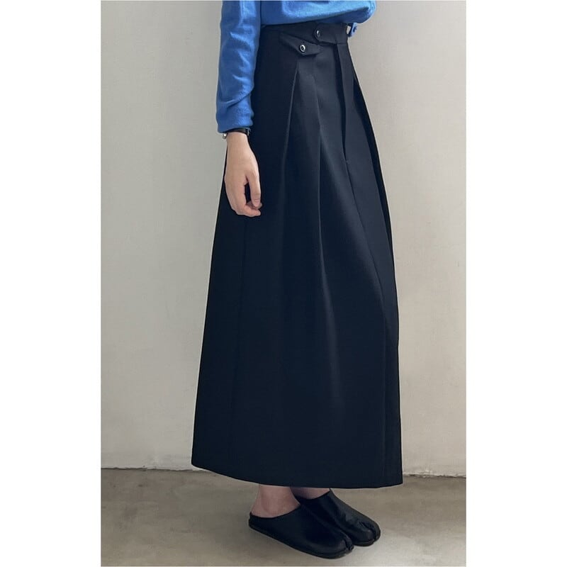 ボタン付きの装飾がアクセントになったミモレ丈のペンシルスカートです。