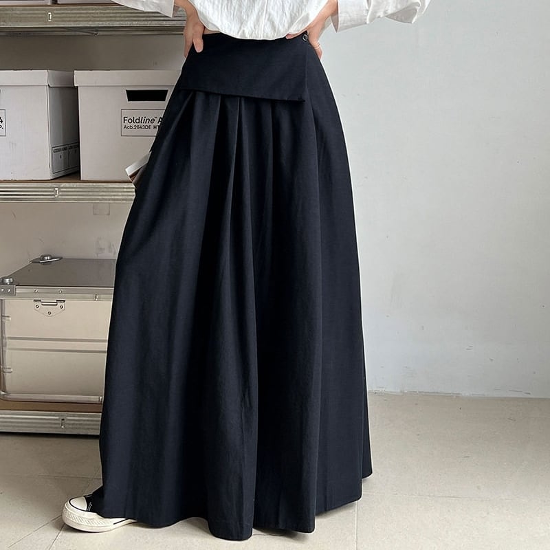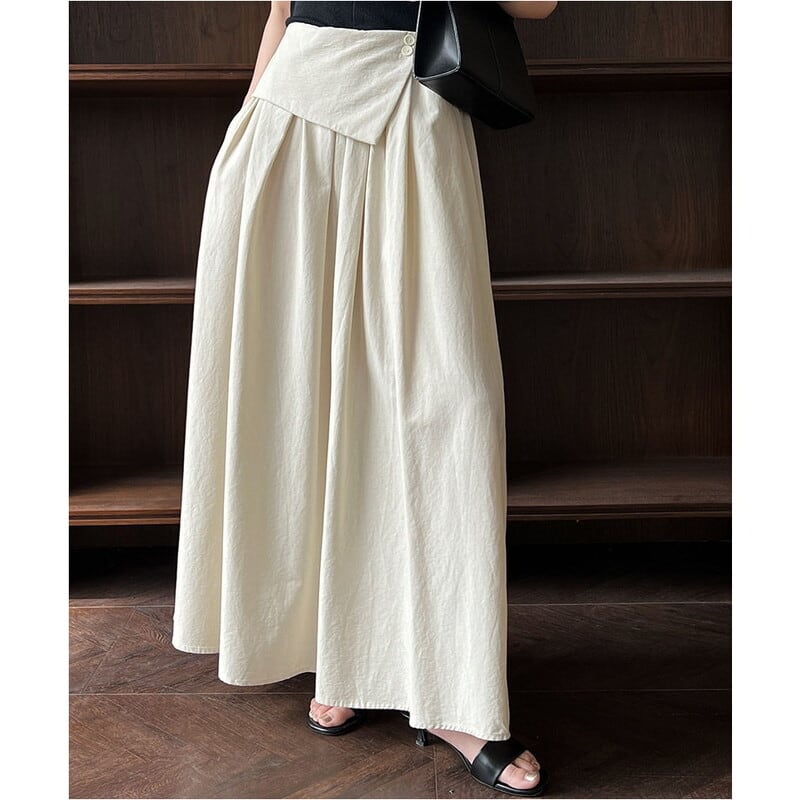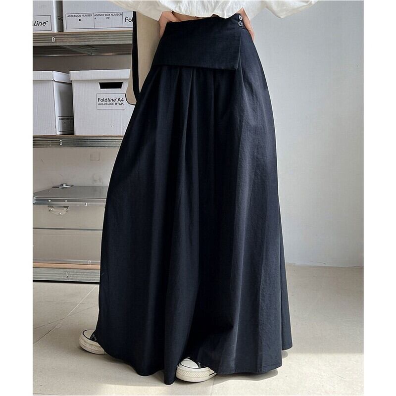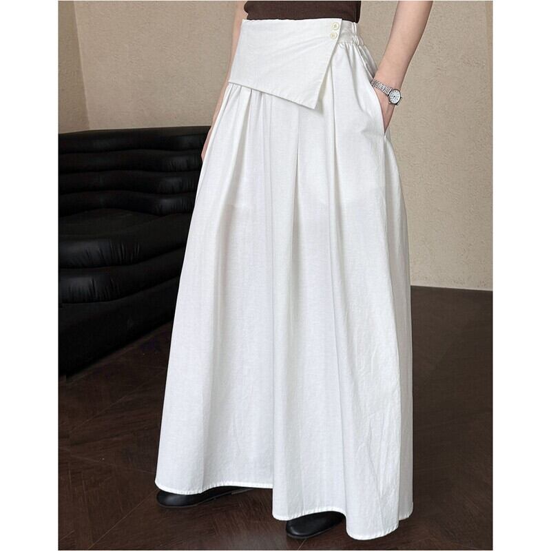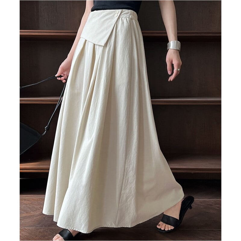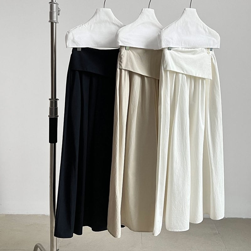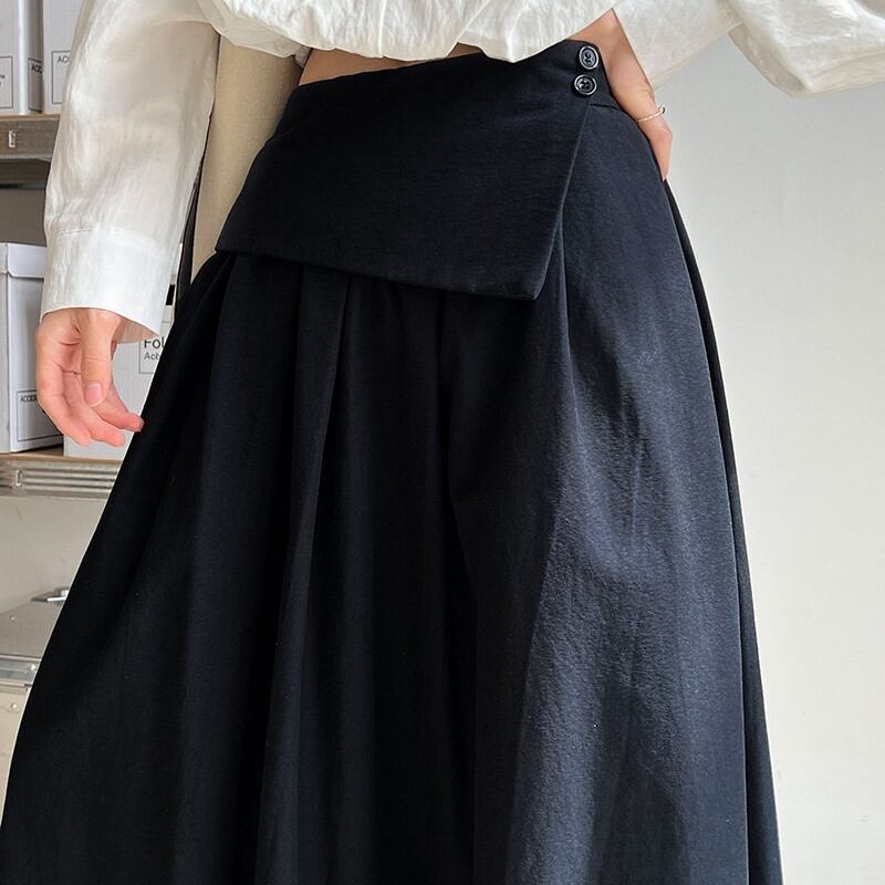 アシンメトリーな折り返しデザインが目を引く、マキシ丈のAラインスカートです。
