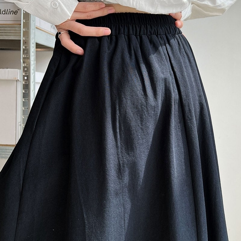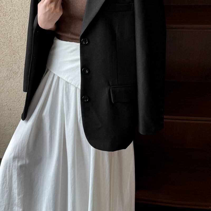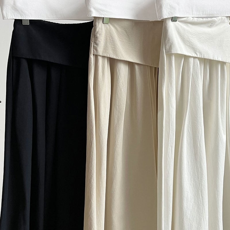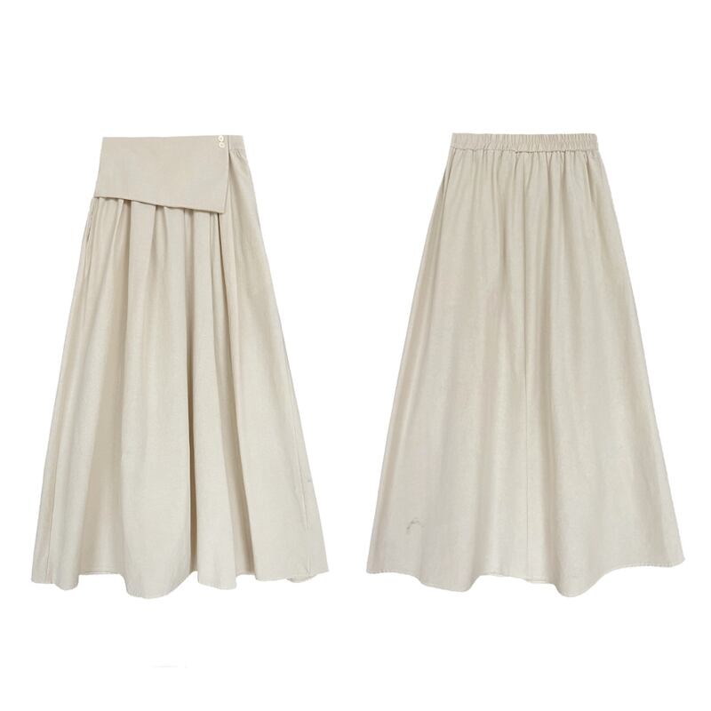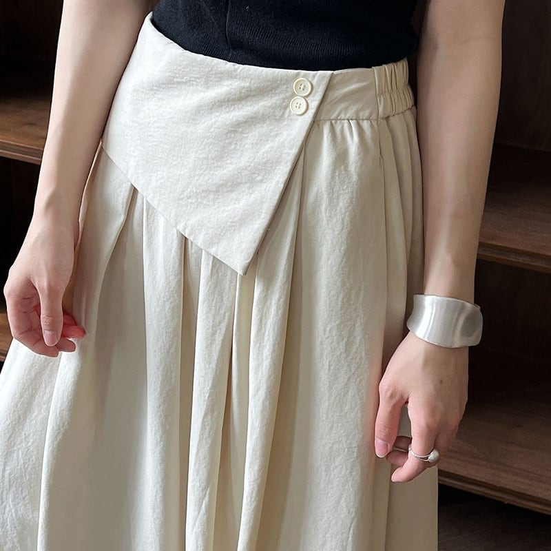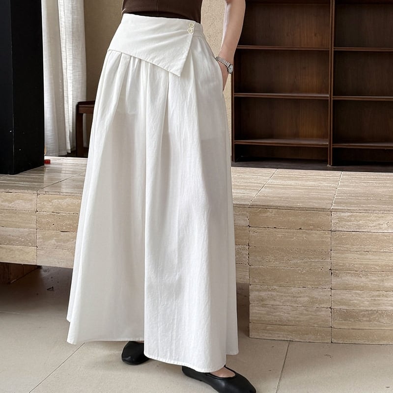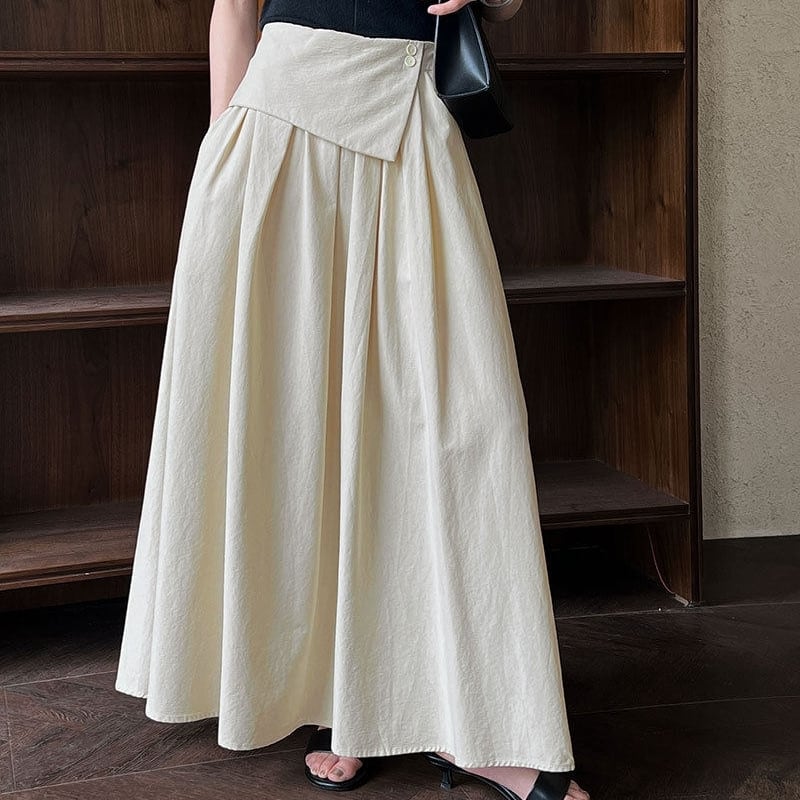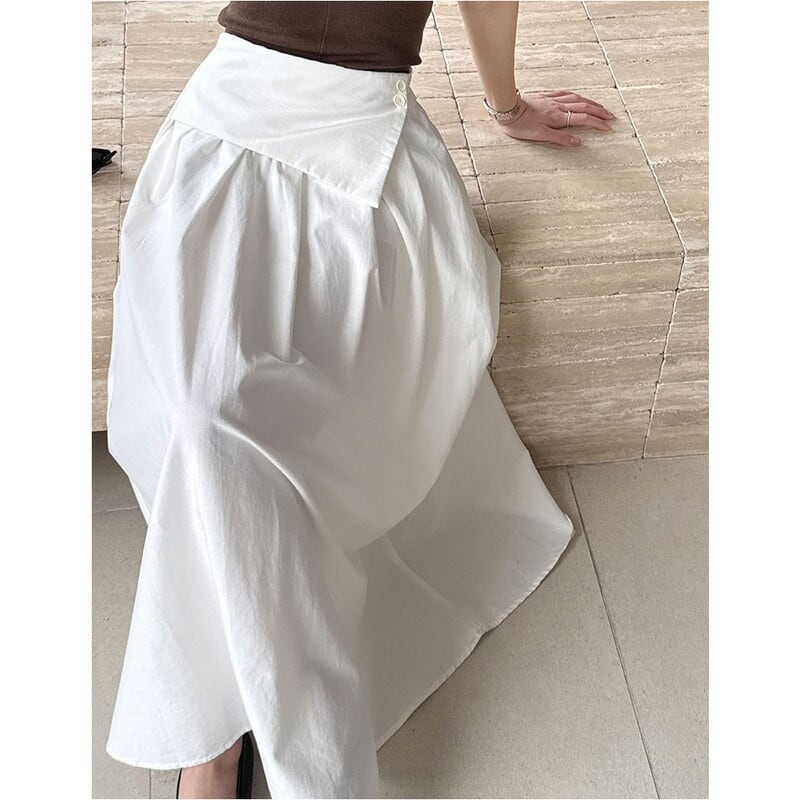アシンメトリーな折り返しデザインが目を引く、マキシ丈のAラインスカートです。