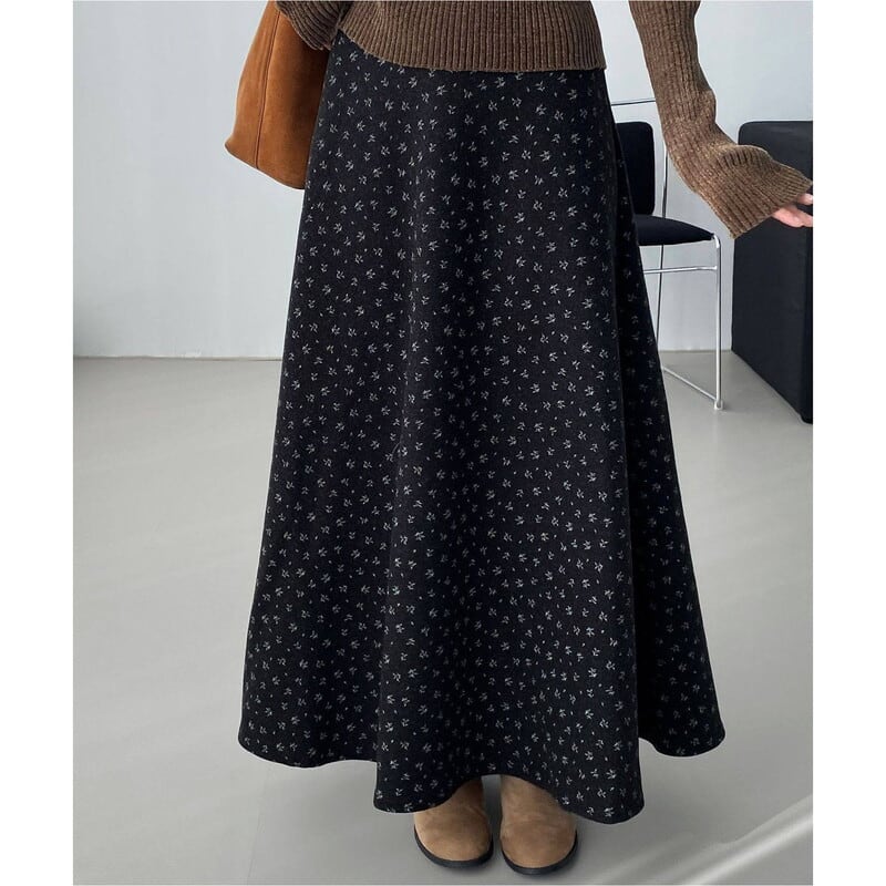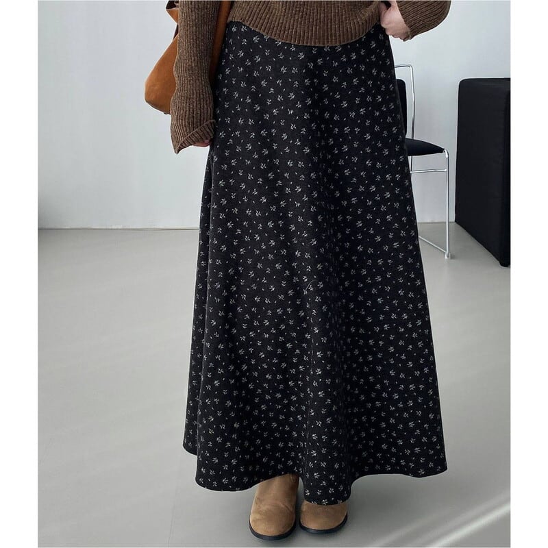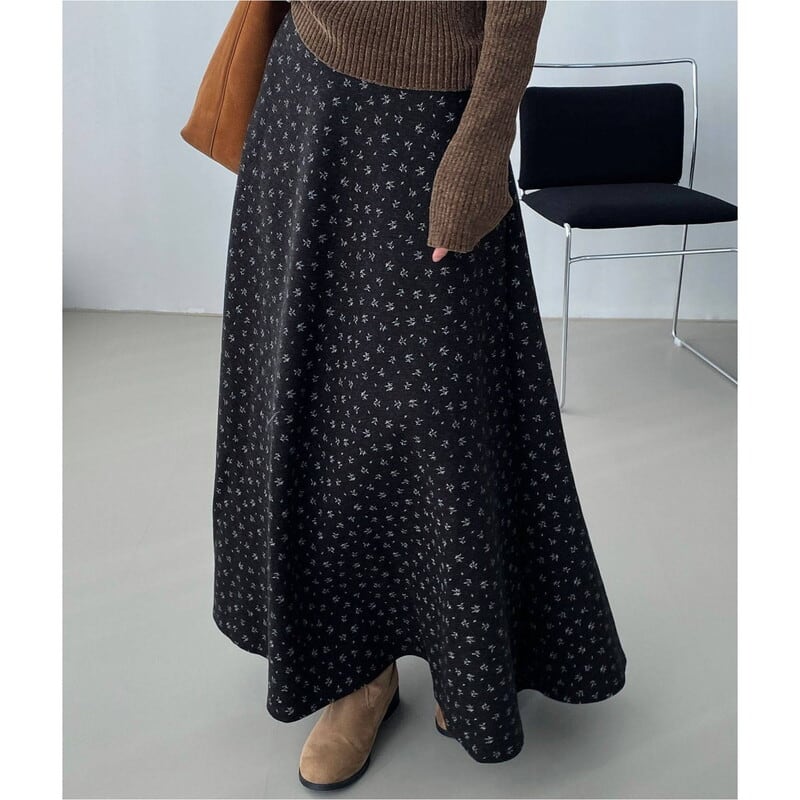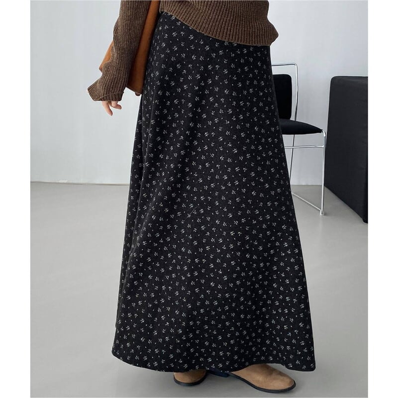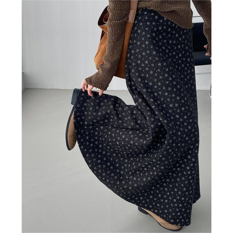全体にあしらわれたフラワープリントが目を引くマキシ丈スカートです。