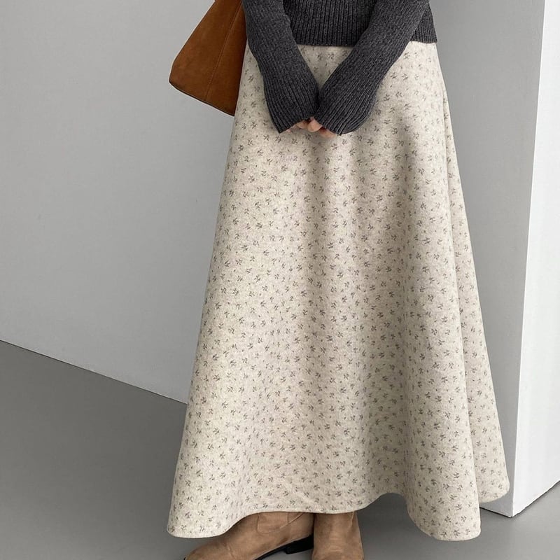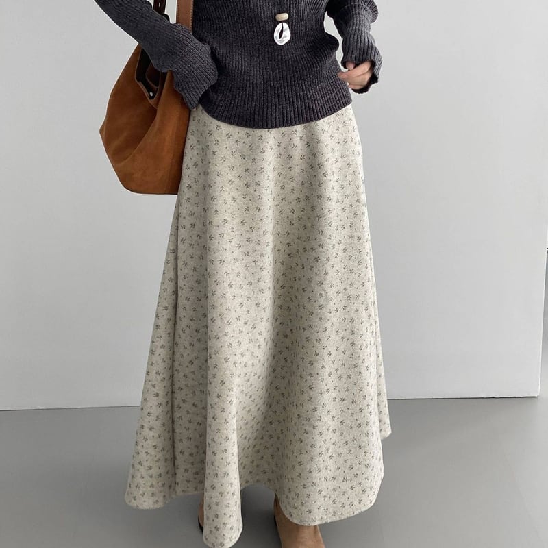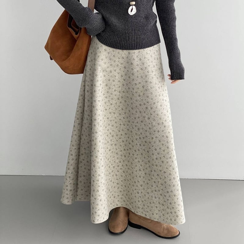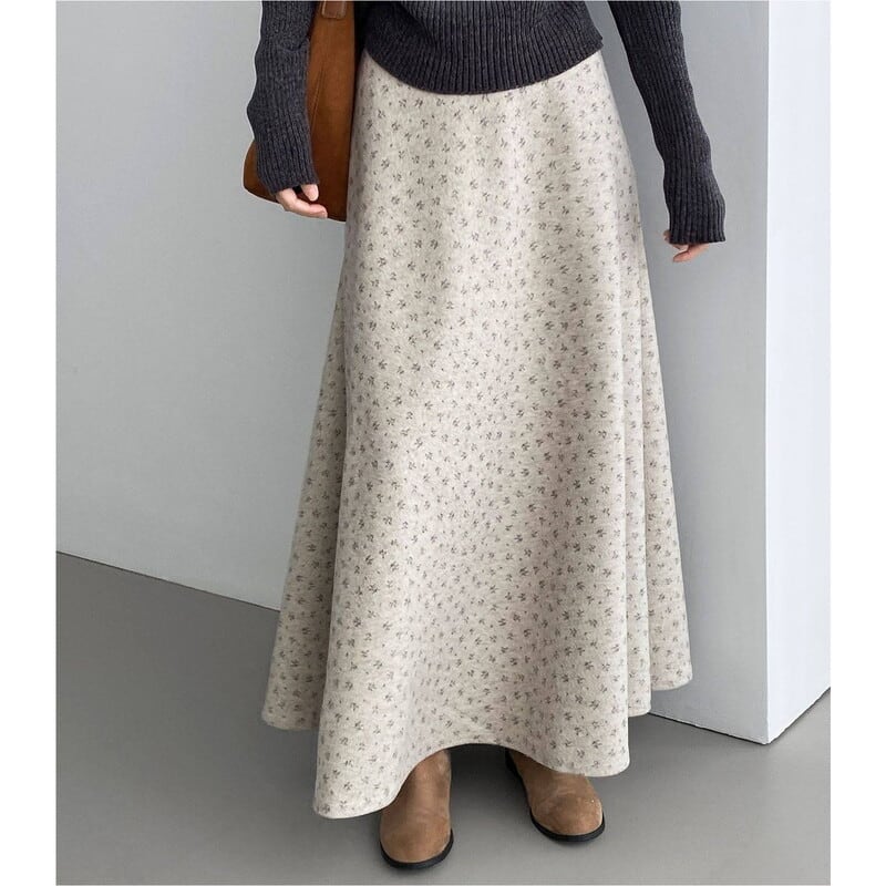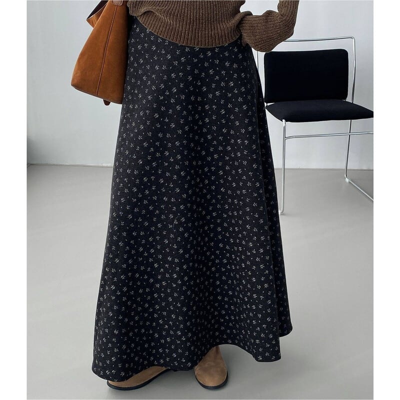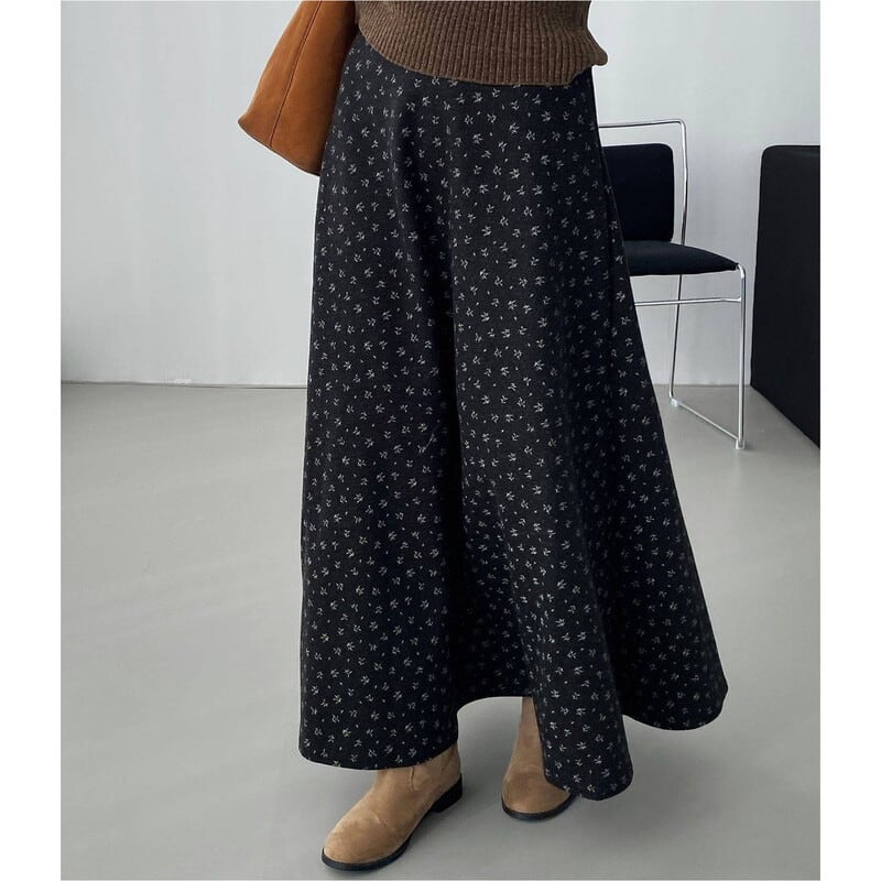 全体にあしらわれたフラワープリントが目を引くマキシ丈スカートです。