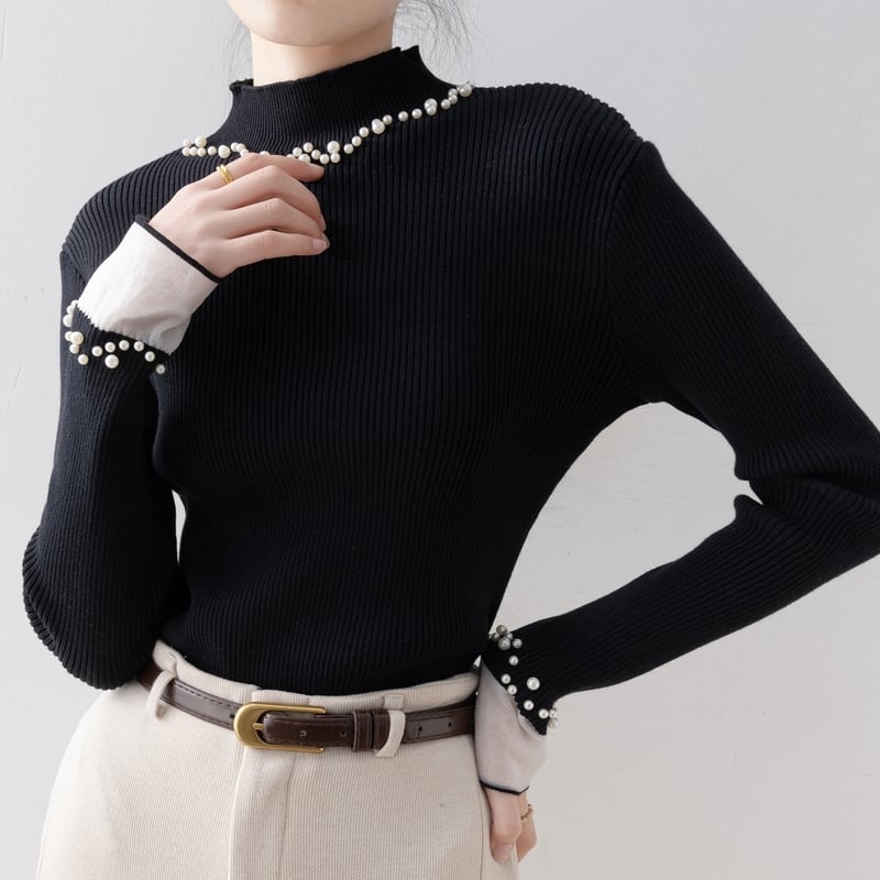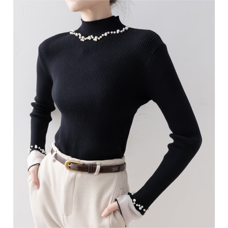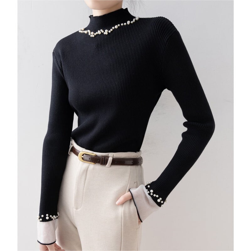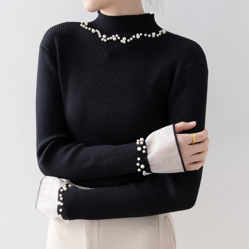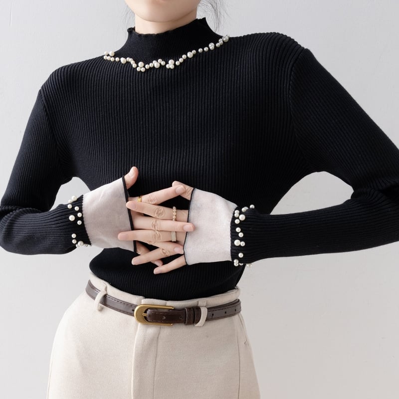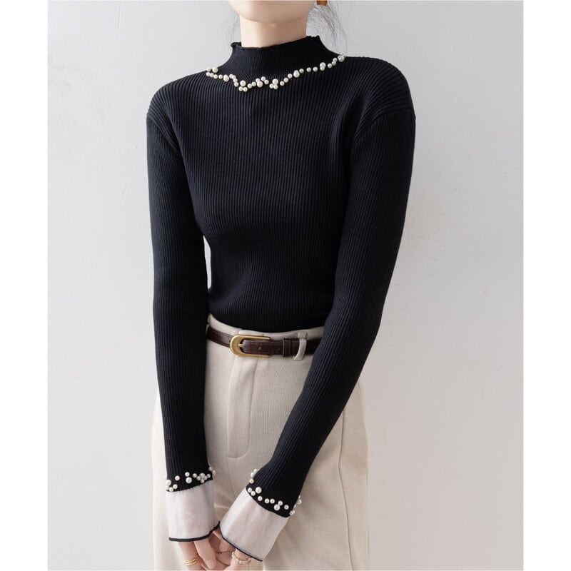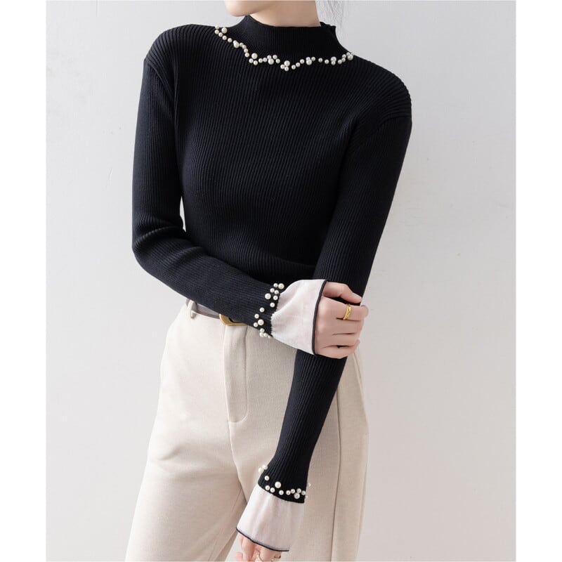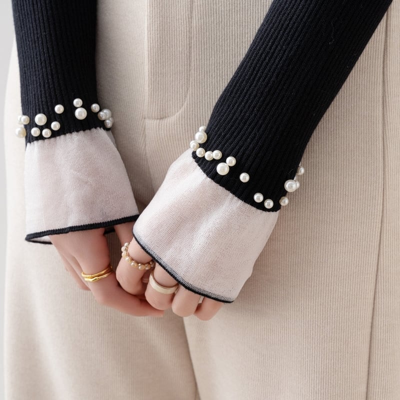 首元と袖口にパールがあしらわれた、上品なリブ編みニットトップスです。