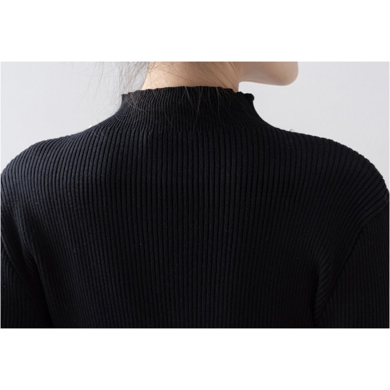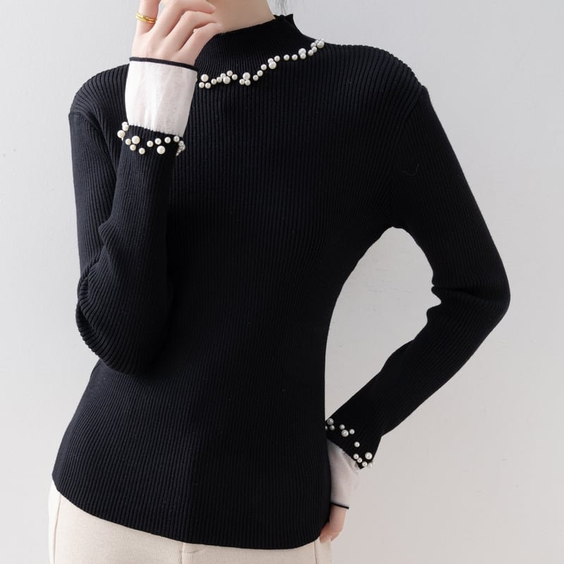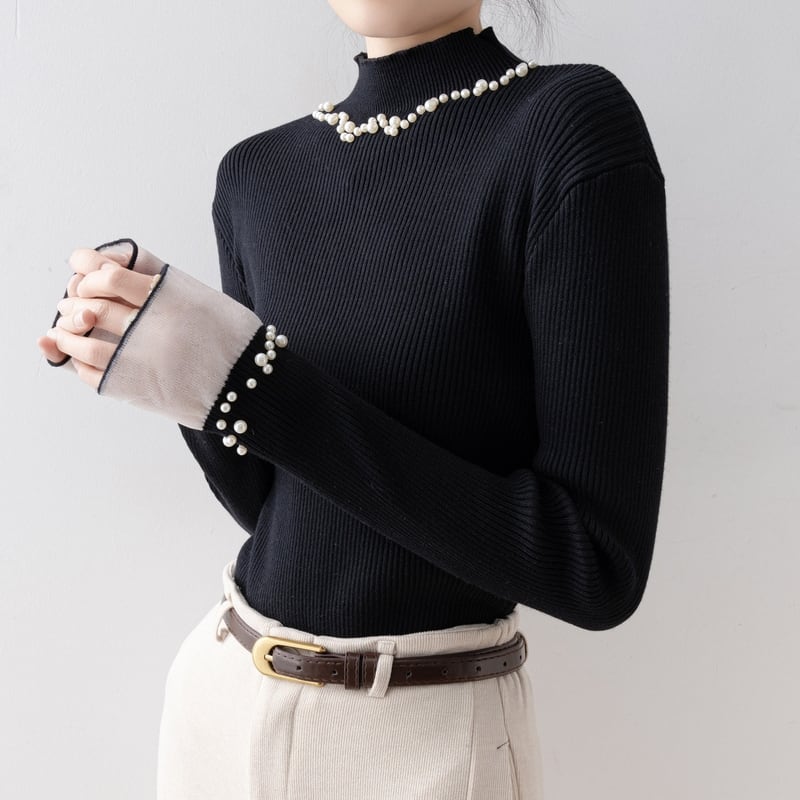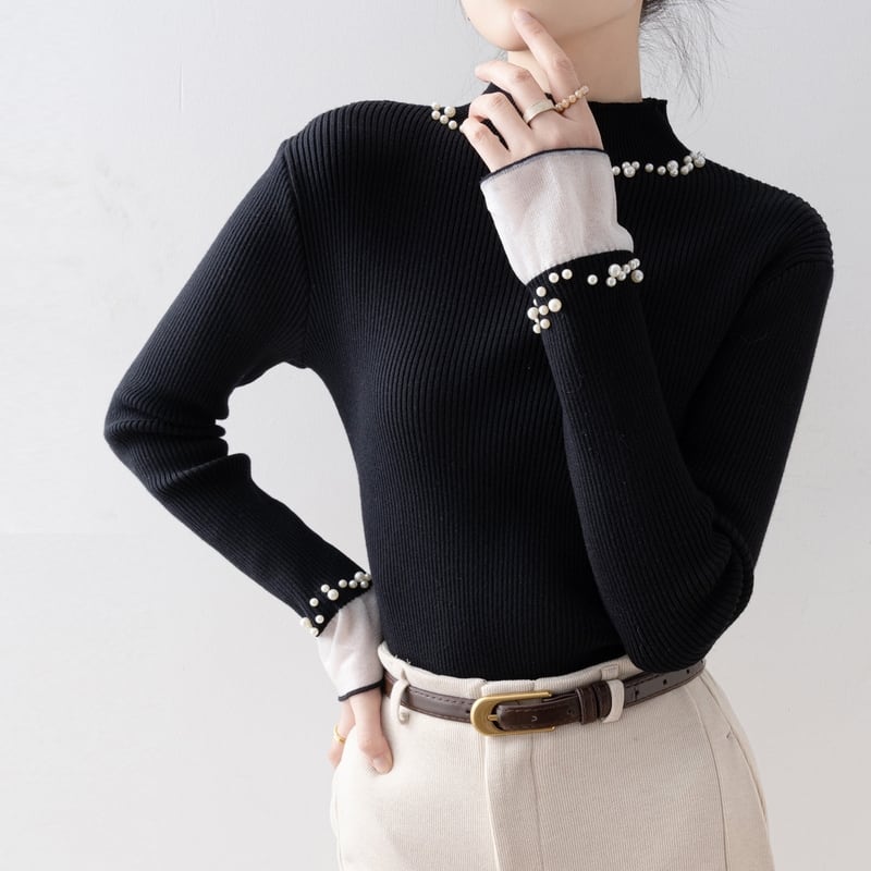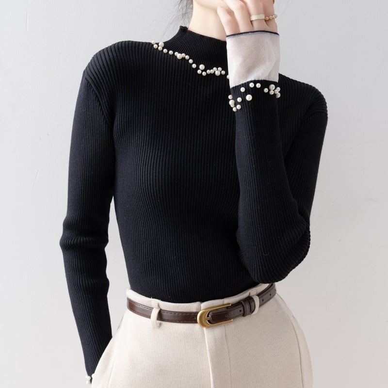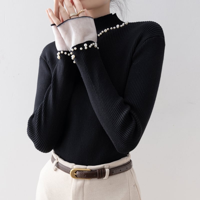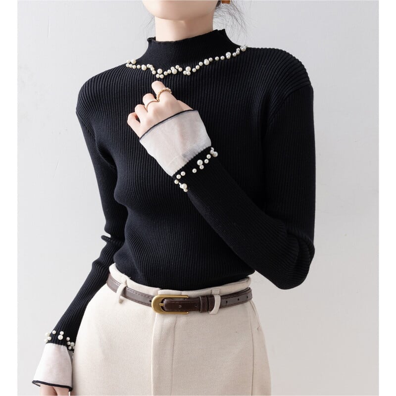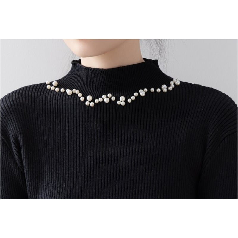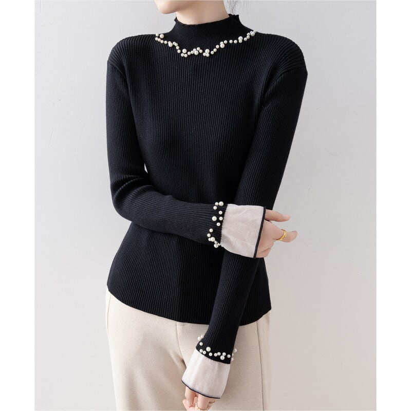 首元と袖口にパールがあしらわれた、上品なリブ編みニットトップスです。