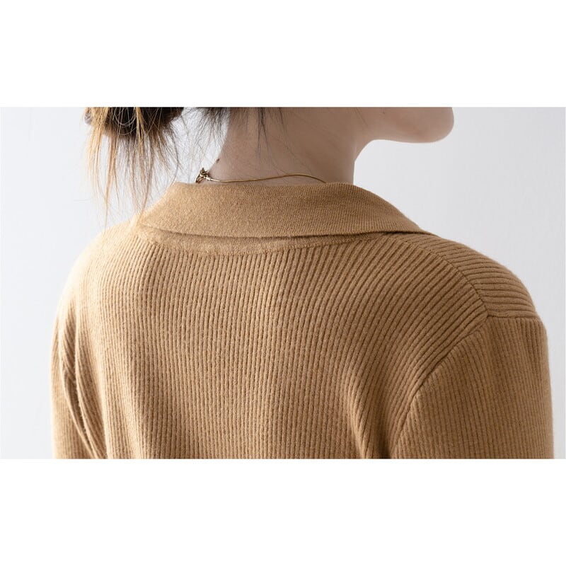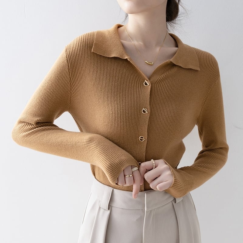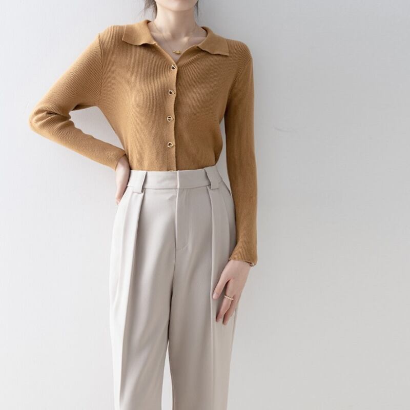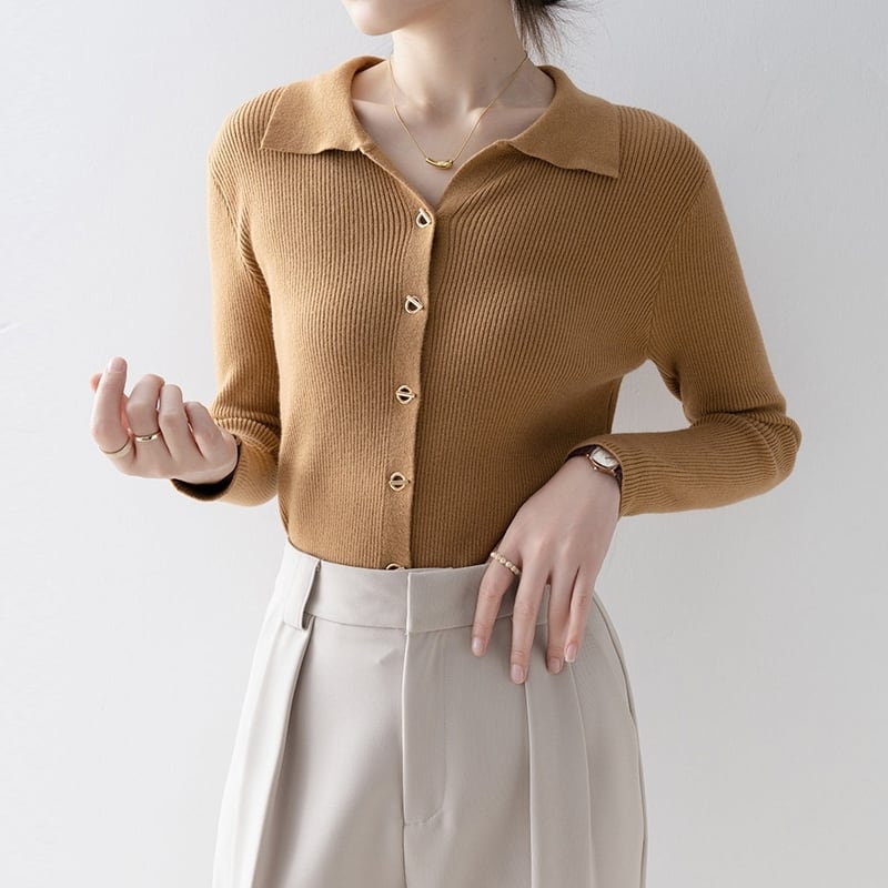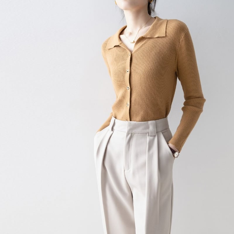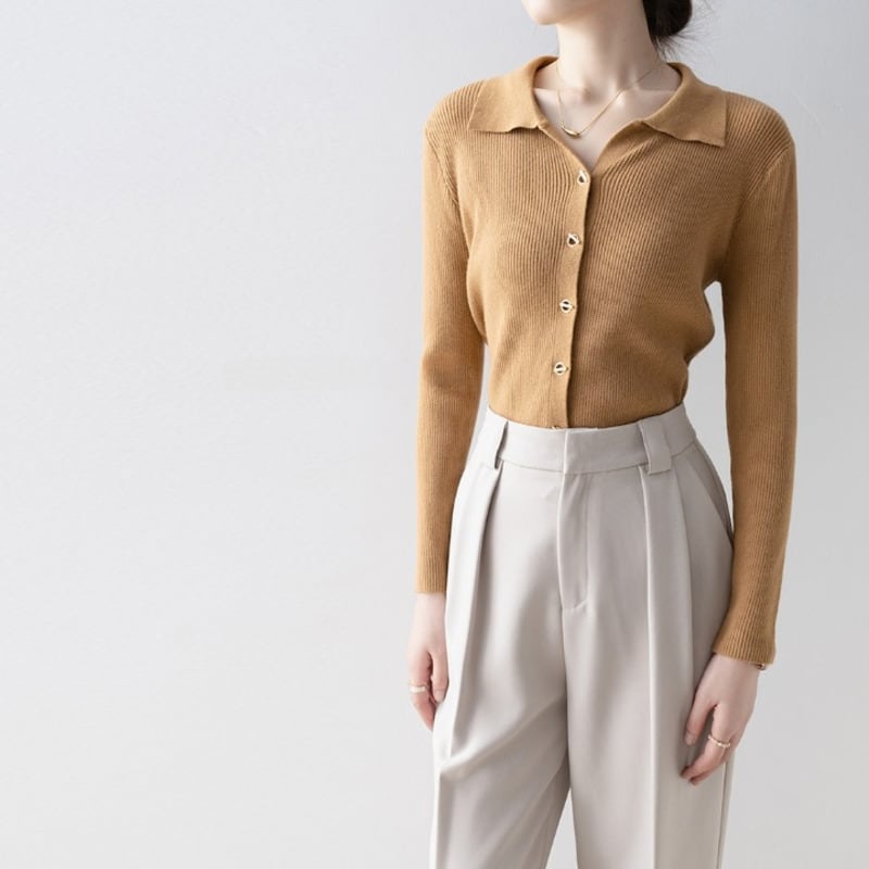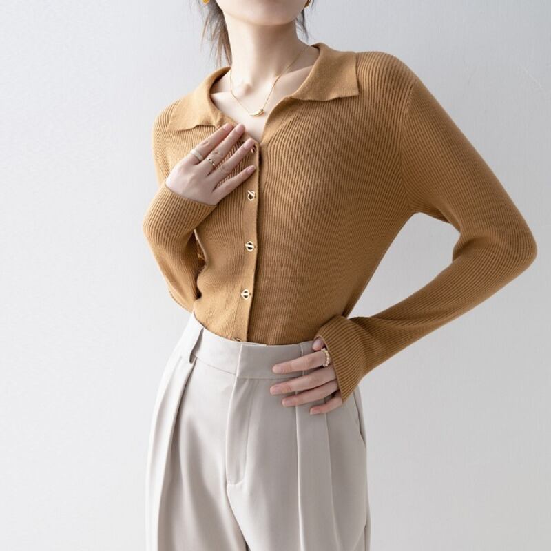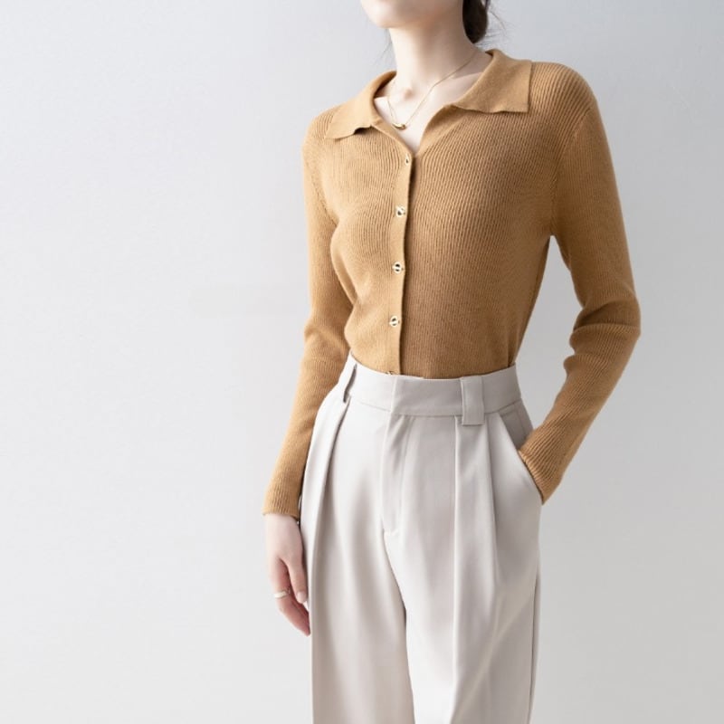 襟付きデザインが上品な印象を与えるニットトップスです。