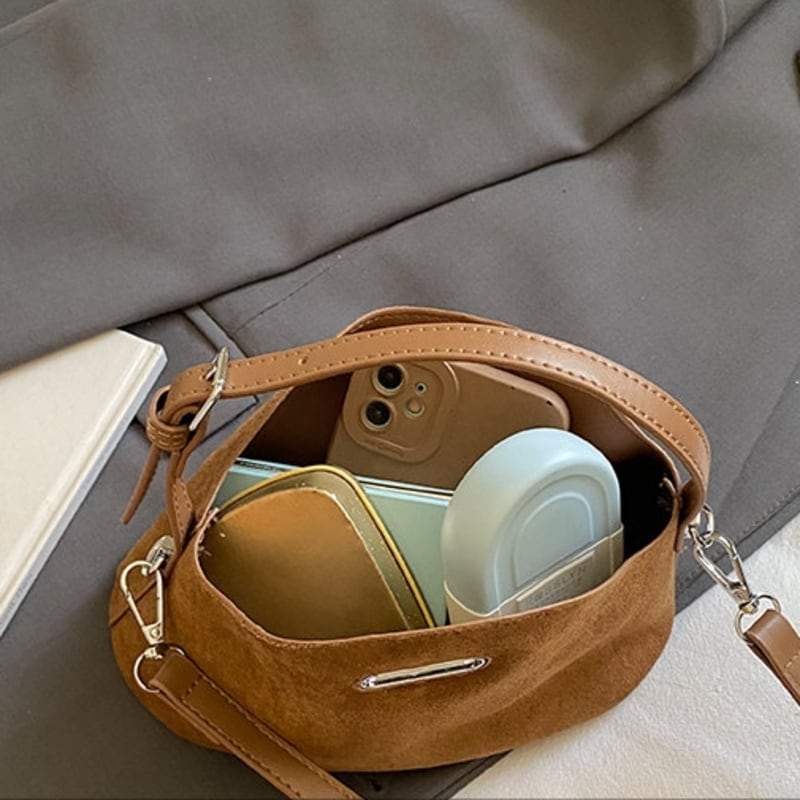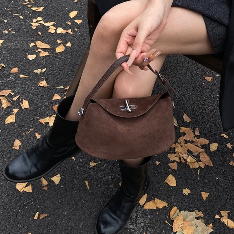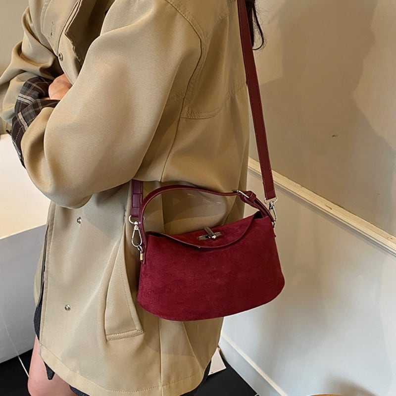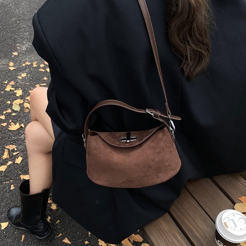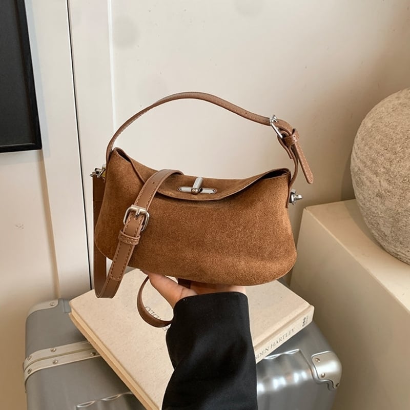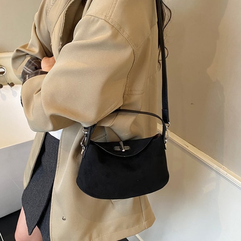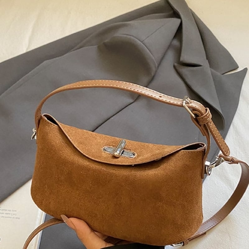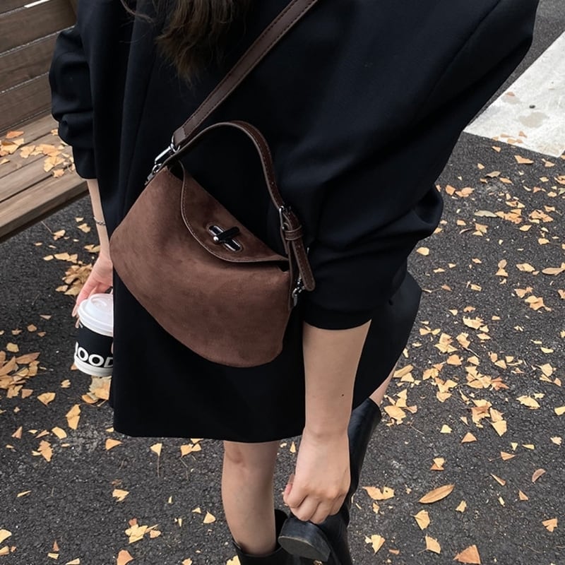 フラップデザインがアクセントになったスエード調のミニショルダーバッグです。