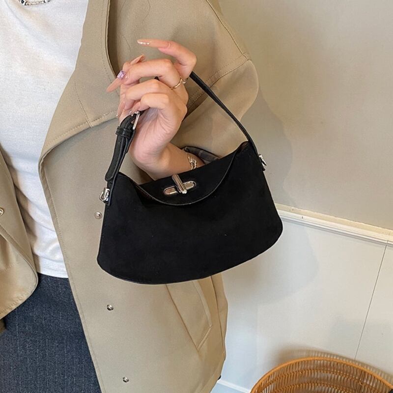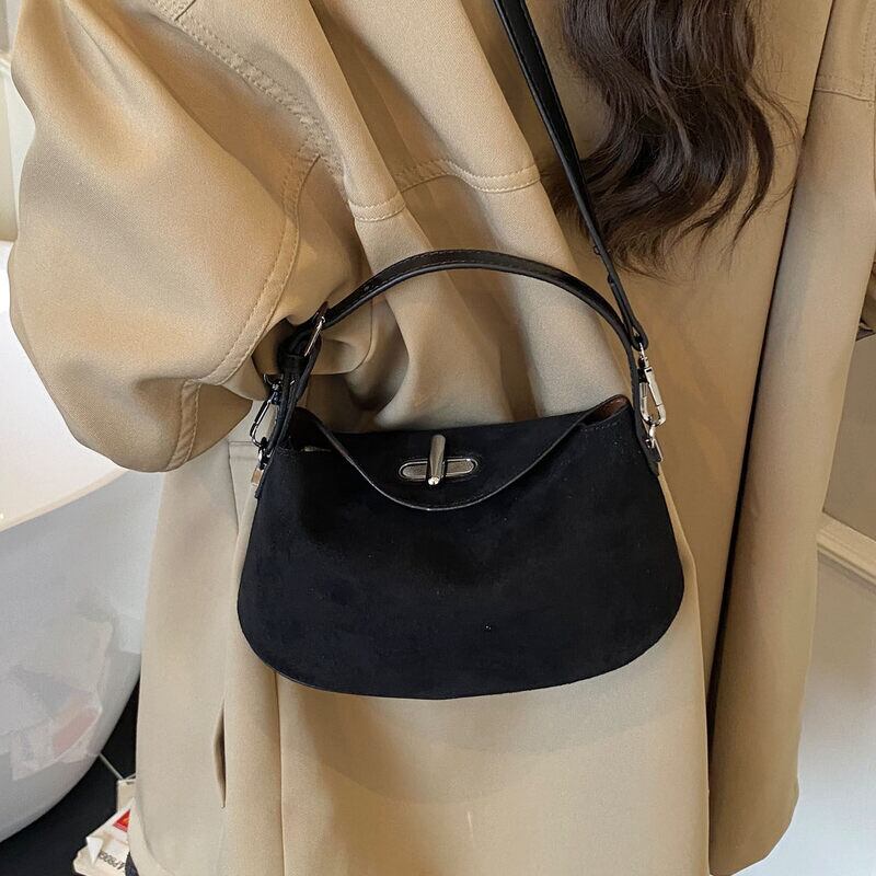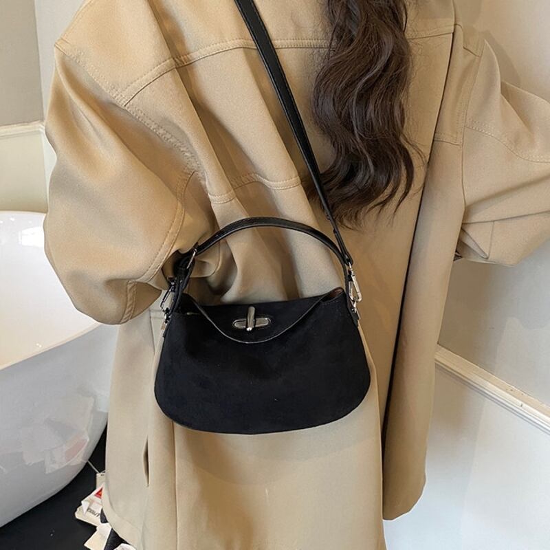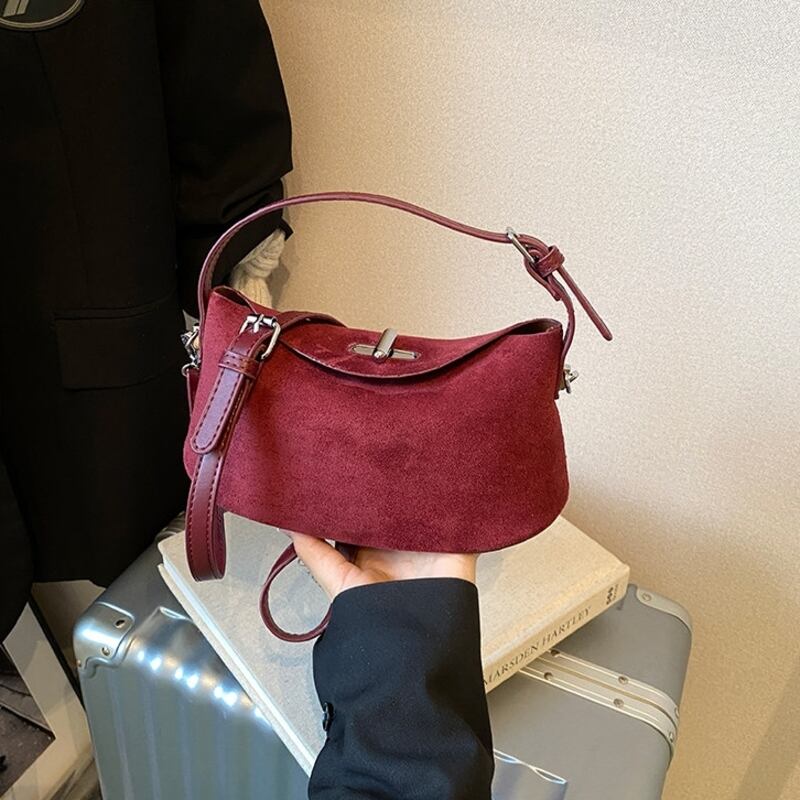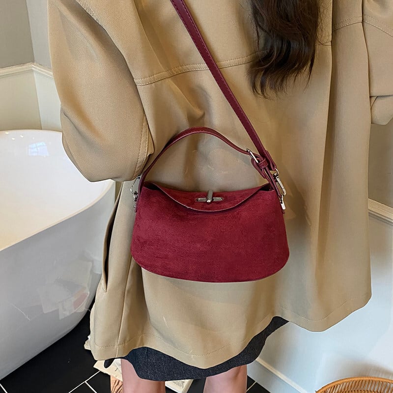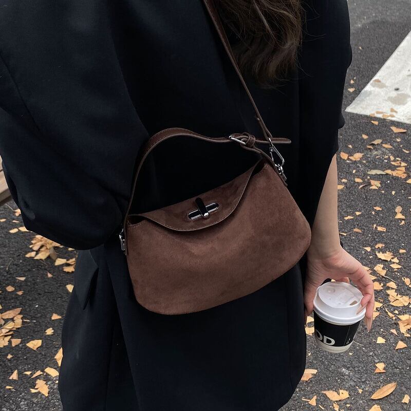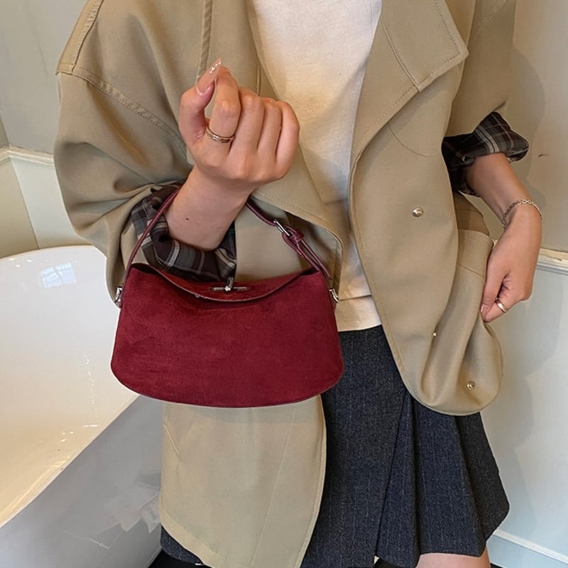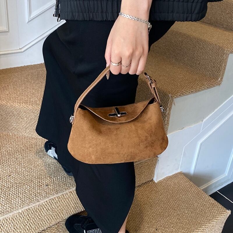 フラップデザインがアクセントになったスエード調のミニショルダーバッグです。